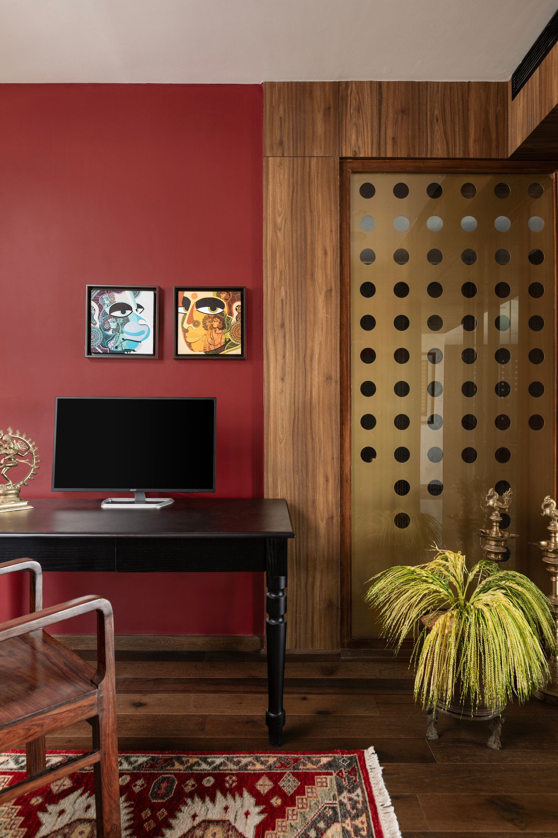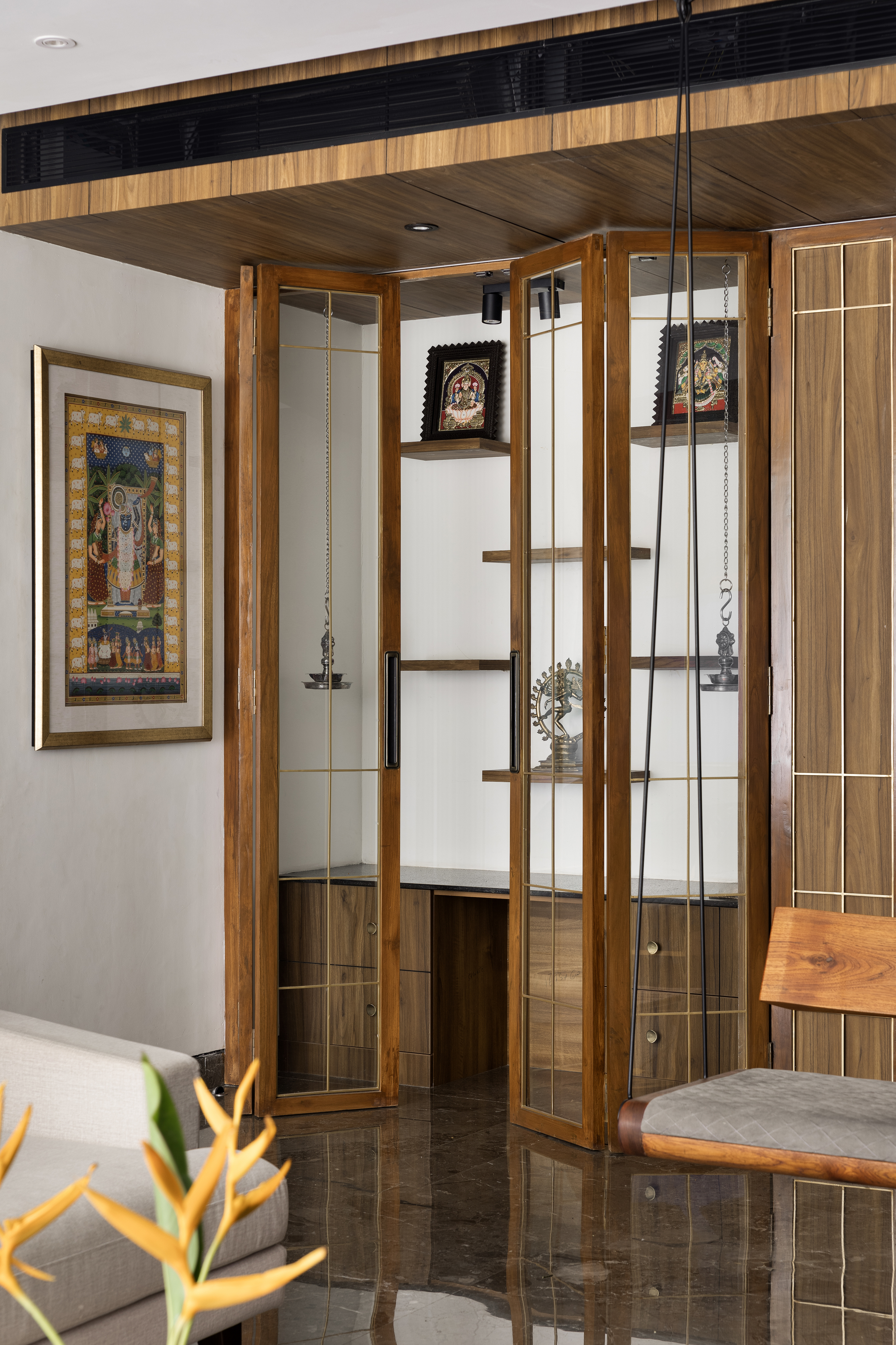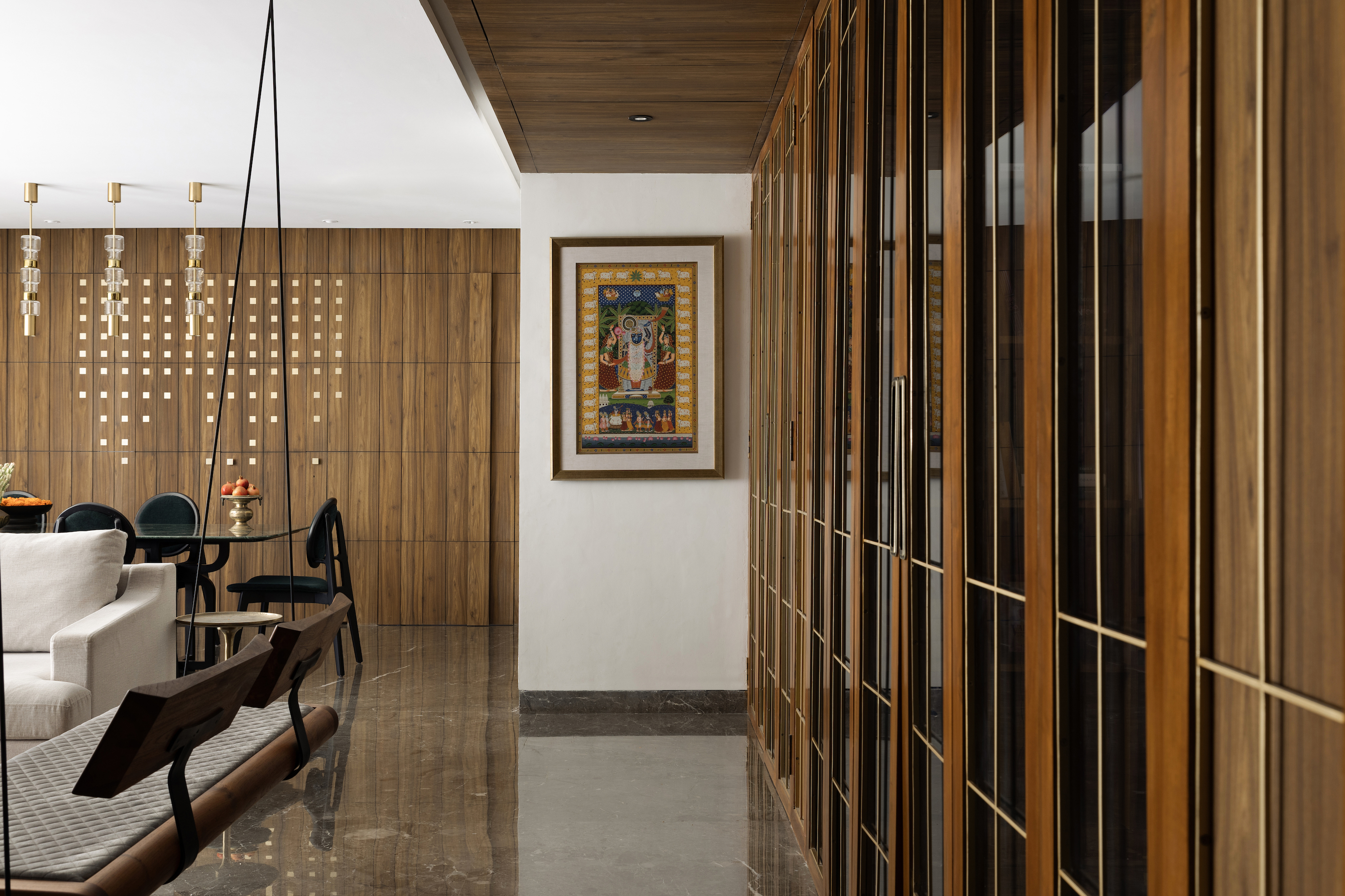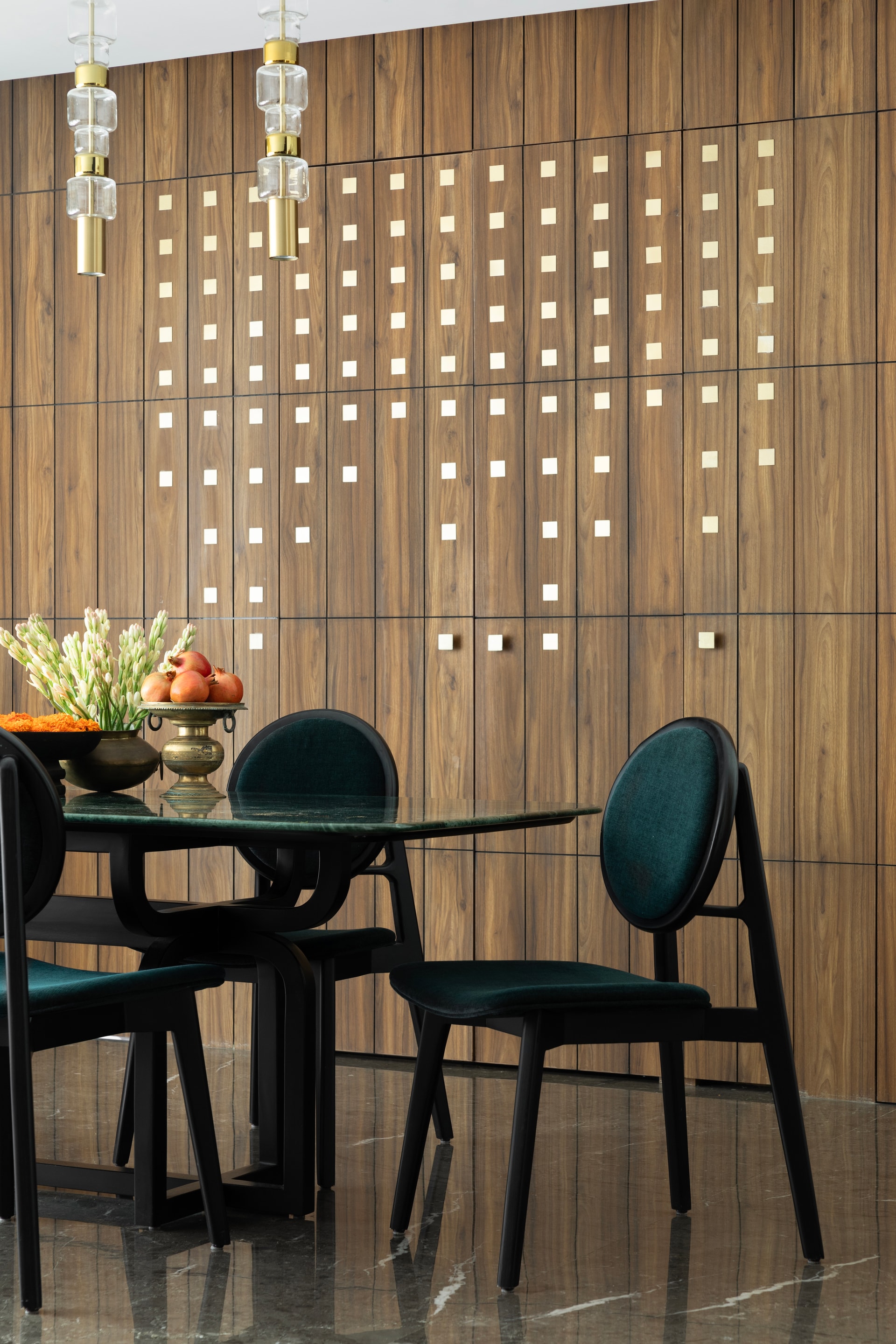 Across the room, an origami-inspired partition conceals a serene prayer nook, its pristine whites glowing against accents of wood and brass, materials that reappear as quiet leitmotifs throughout the home. The dining zone, meanwhile, blurs the boundary between restraint and richness. A walnut-paneled wall conceals five doors in seamless symmetry, while brass inlays reinterpret the Toran, the ceremonial hanging seen in Indian homes. Overhead, three luminous brass-and-glass pendants take their cue from temple bells, echoing softly against a bespoke Udaipur green marble table and ceramic lotus installations by Priya Sundaravalli Sudharsan of Auroville.