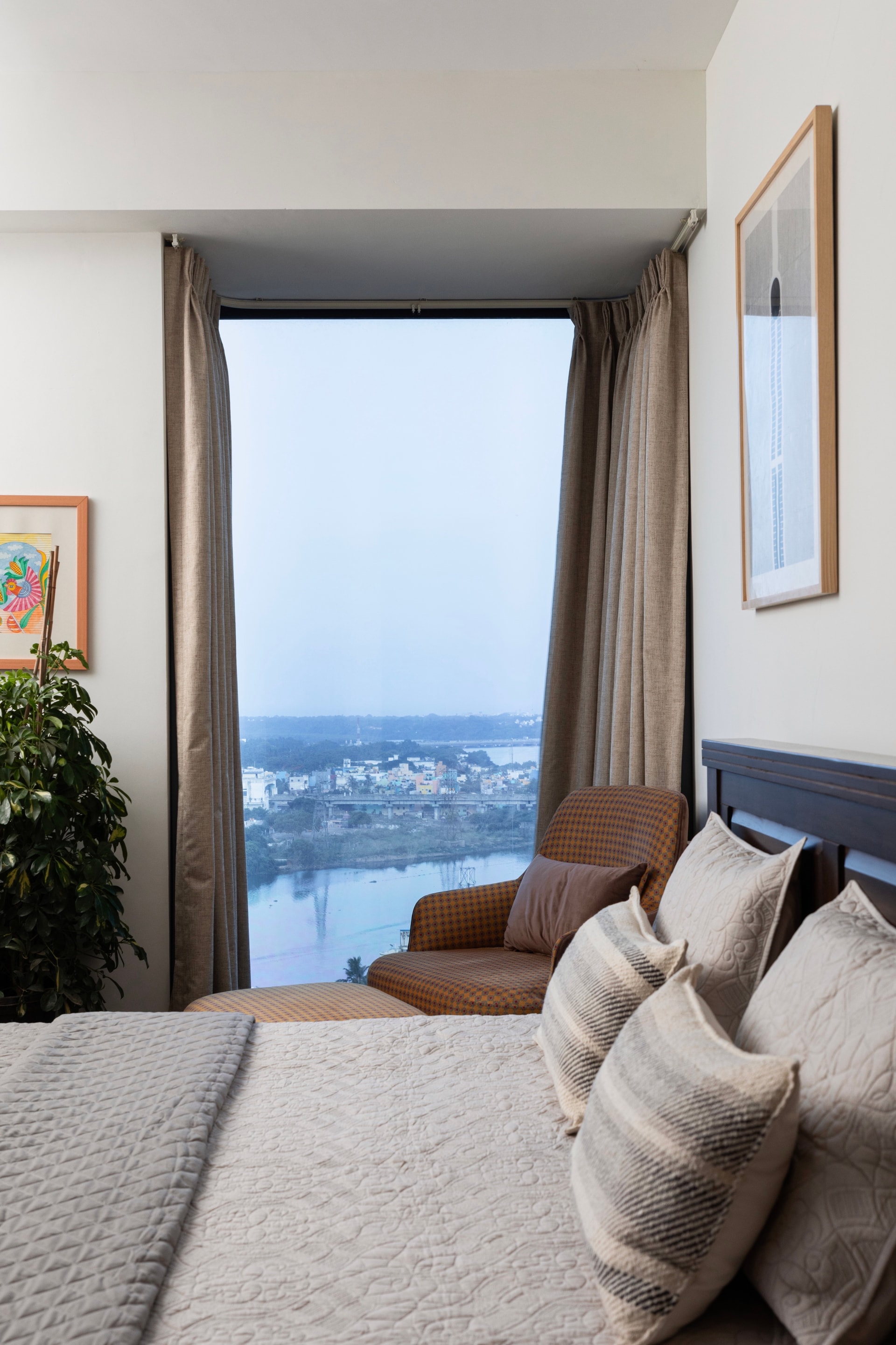 The aroma of finely ground coffee decoction swirls in the morning air, mingling with the distant chime of salangai, anklets that mark the rhythm of Bharatanatyam practice. Beyond the glass, the Adyar River unfurls toward the horizon, its rippling expanse mirrored by the dappled greens of its islets. These sensory fragments – aroma, sound, and sight, become the prologue to Nesavu, a home perched on the 18th floor of a coveted riverside complex in the heart of Chennai.