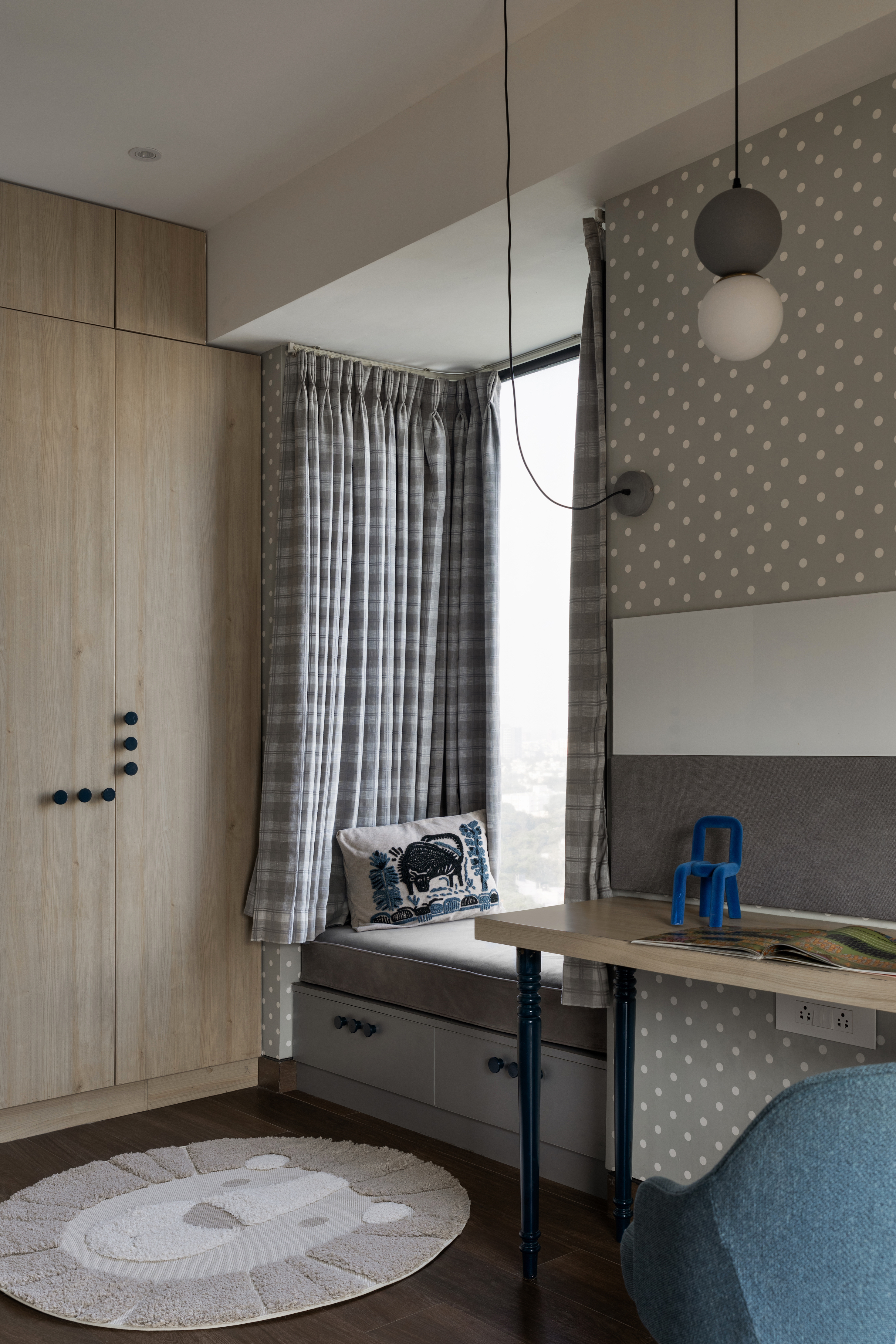 The guest bedroom celebrates memory and heirloom: an antique family bed, gingham upholstery, and Ikat-patterned wardrobes blend warmth with nostalgia. The child’s bedroom bursts into Prussian blue, a space designed to grow with its young inhabitant, featuring a custom bunk bed, a turned-leg study desk, and a window seat for slow reading days.