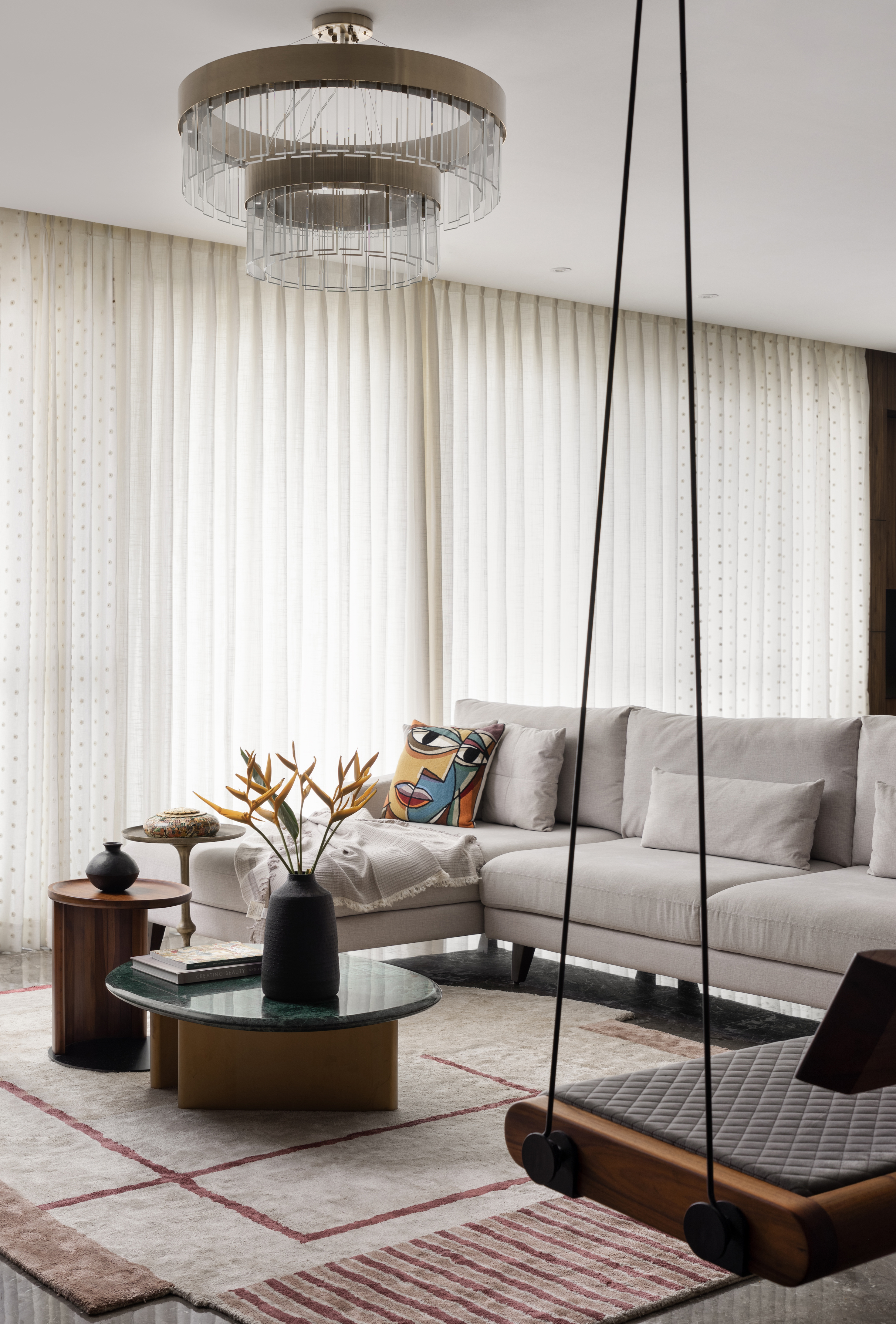 The living and dining areas unfold as a minimalist counterpoint to the colour-forward shell. A warm grey sectional sofa and a suspended swing by Studio Works anchor the space, resting atop a sculptural carpet by Jaipur Rugs. Billowing ivory curtains embroidered with marigold motifs filter soft daylight, a contemporary take on traditional malaihal (garlands).