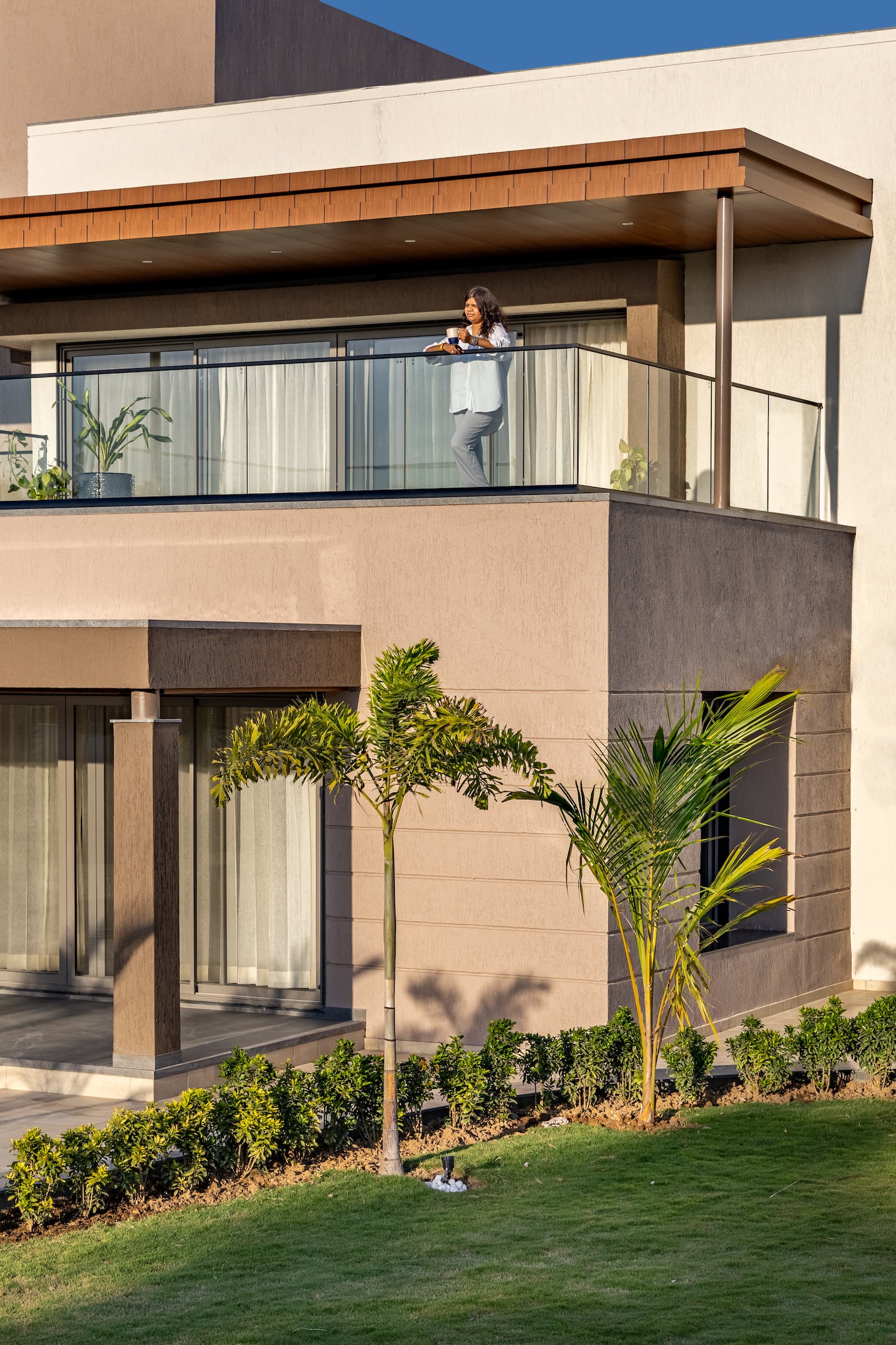 A beautifully landscaped lawn, a major focal point, provides a charming space for entertaining guests. At sunset, this area transforms into a mesmerising retreat, earning the house its name. The structure itself is a harmonious blend of neat, vertical lines and horizontal projections, lending it a pleasing character that captivates the eye.