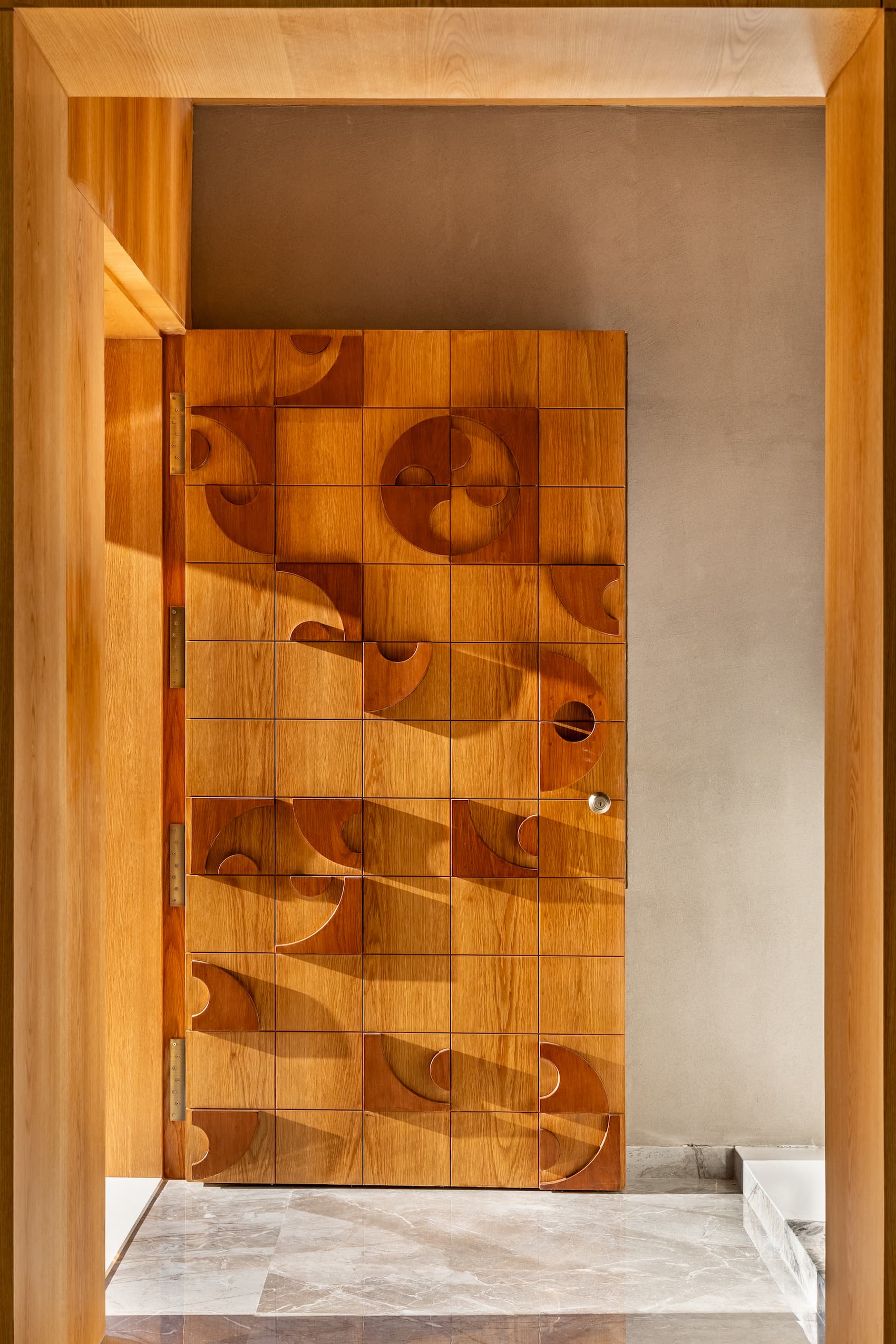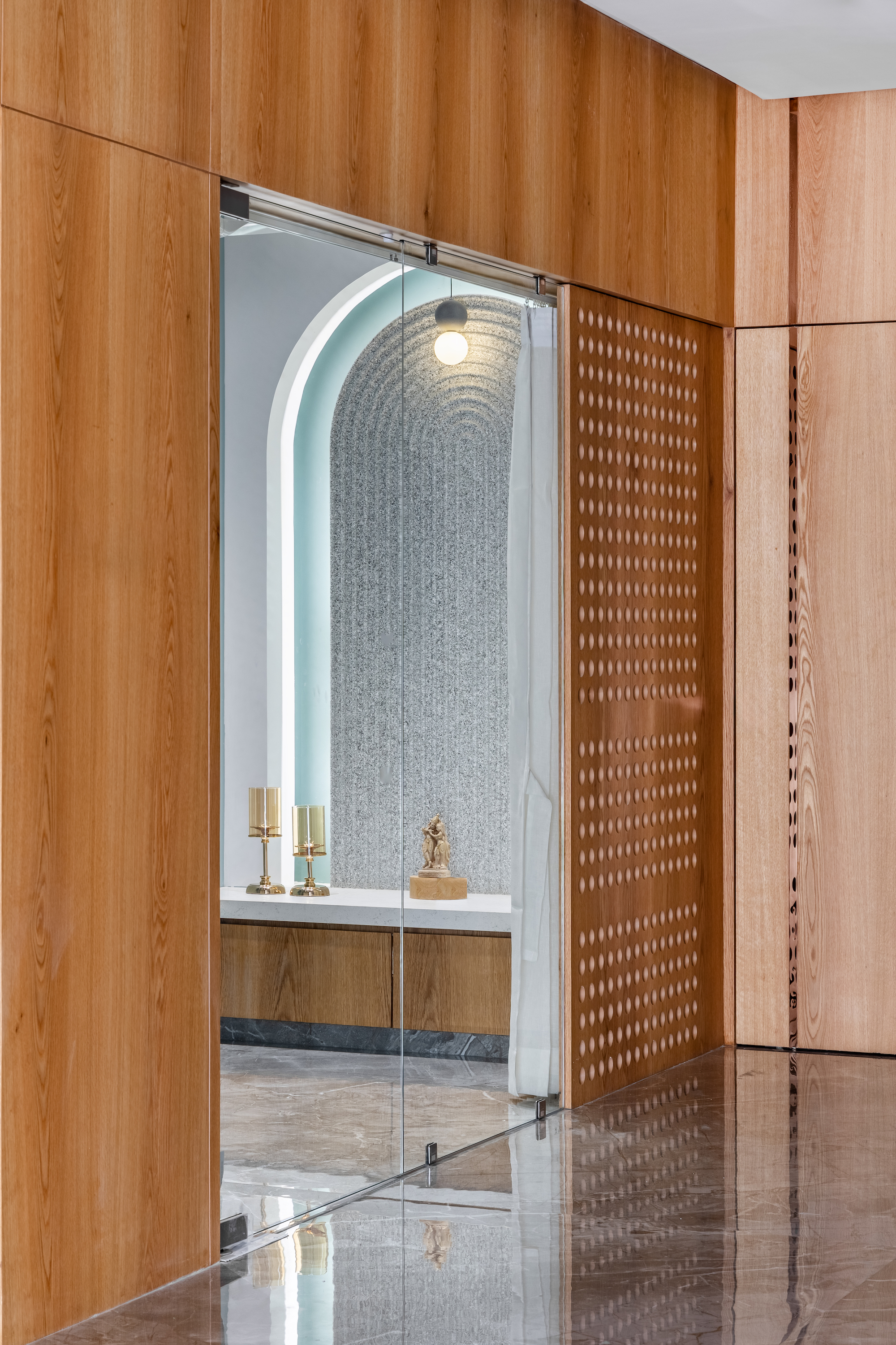 The prayer room is a serene haven that radiates tranquility throughout the house. Soft arches and a palette of whites and soft teals combine modern and traditional elements. Recessed arches with traditional Pichwai paintings adorn the left wall, enhancing the room’s elegance and providing a pleasing aesthetic for the dining area. A mesh wooden wall in the corner ensures natural light and air ventilation.
