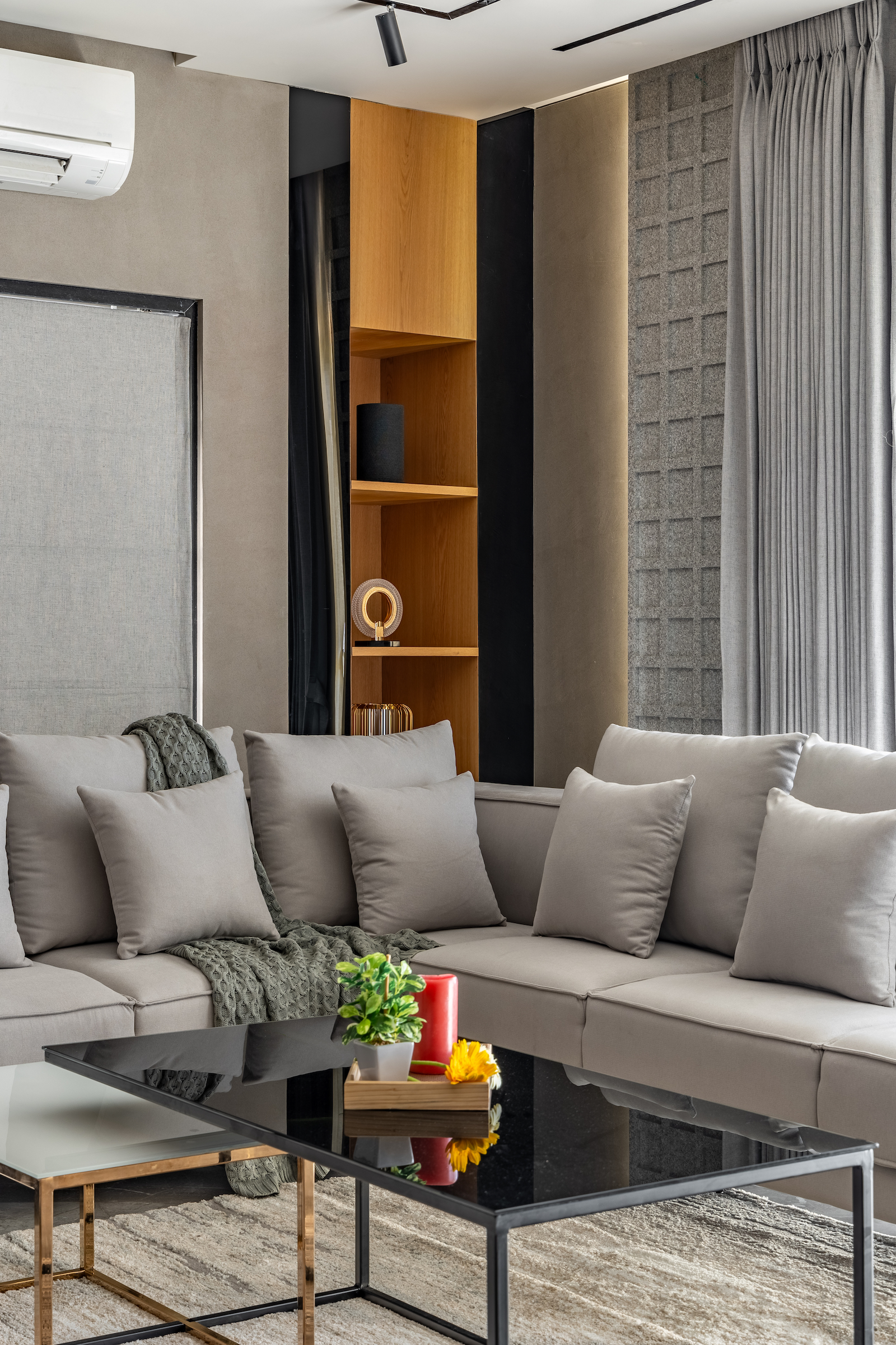 Inside, the home adheres to the same modern contemporary principles and neutral color palette that define the exterior. The living room features comfortable grey sofas and sectionals, complemented by a distinctive nesting table combination at the center. The room’s centerpiece is the black back-painted glass in the recessed TV nook, which is also used in the center table and the vertical borders of the unit behind the sofas. Black trimmings on the furniture further harmonise the design, while spotlighting ensures an ambient atmosphere.