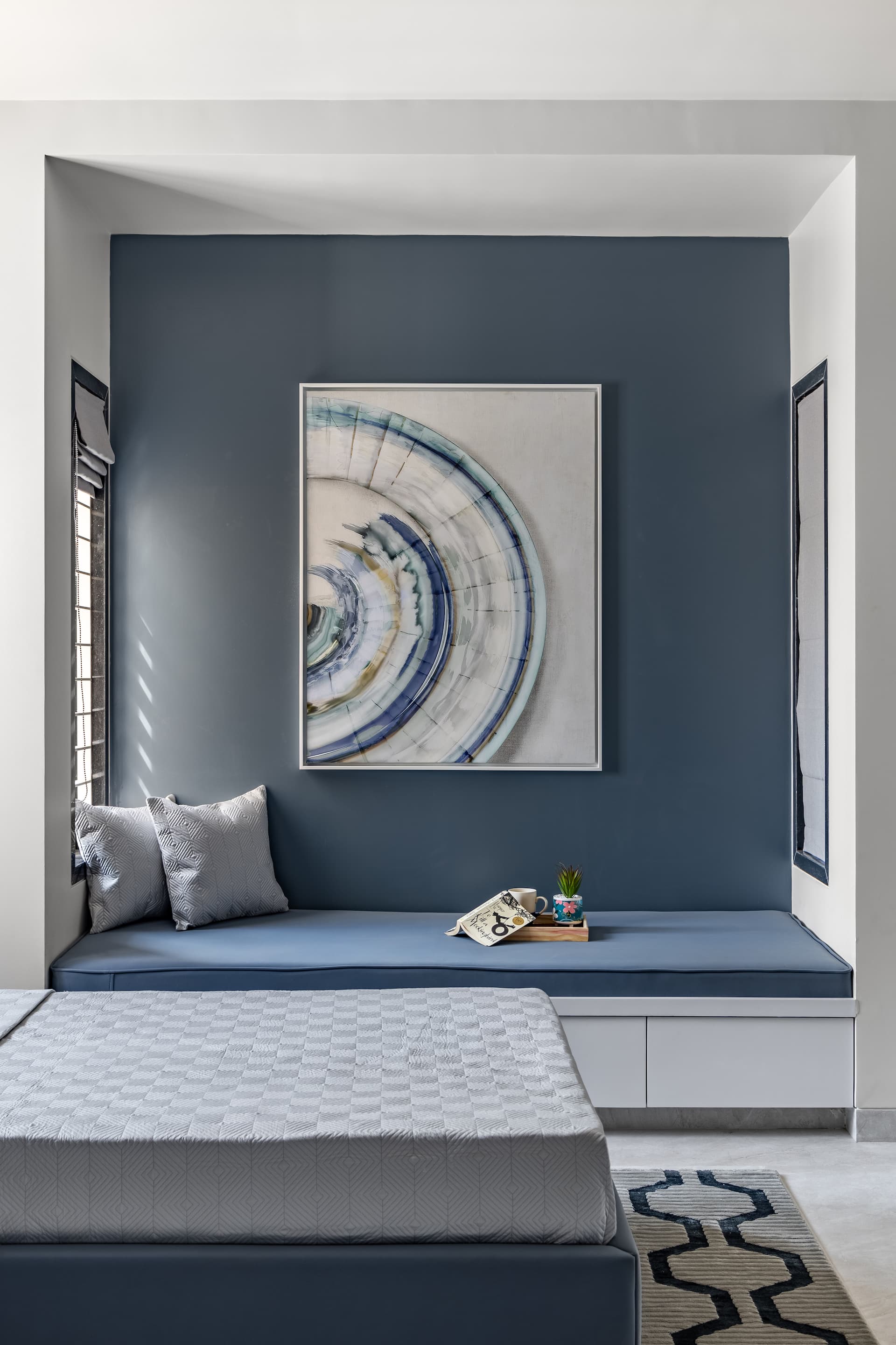 In the children’s bedroom, a palette of steel-blue and whites creates a soothing atmosphere. Twin beds with wardrobes separated by a dressing area make it a sensible design for two kids sharing a room. A cozy nook in the corner is perfect for reading, napping, or lounging. Rose-gold trimmings on the walls and furniture knobs add an elegant touch.