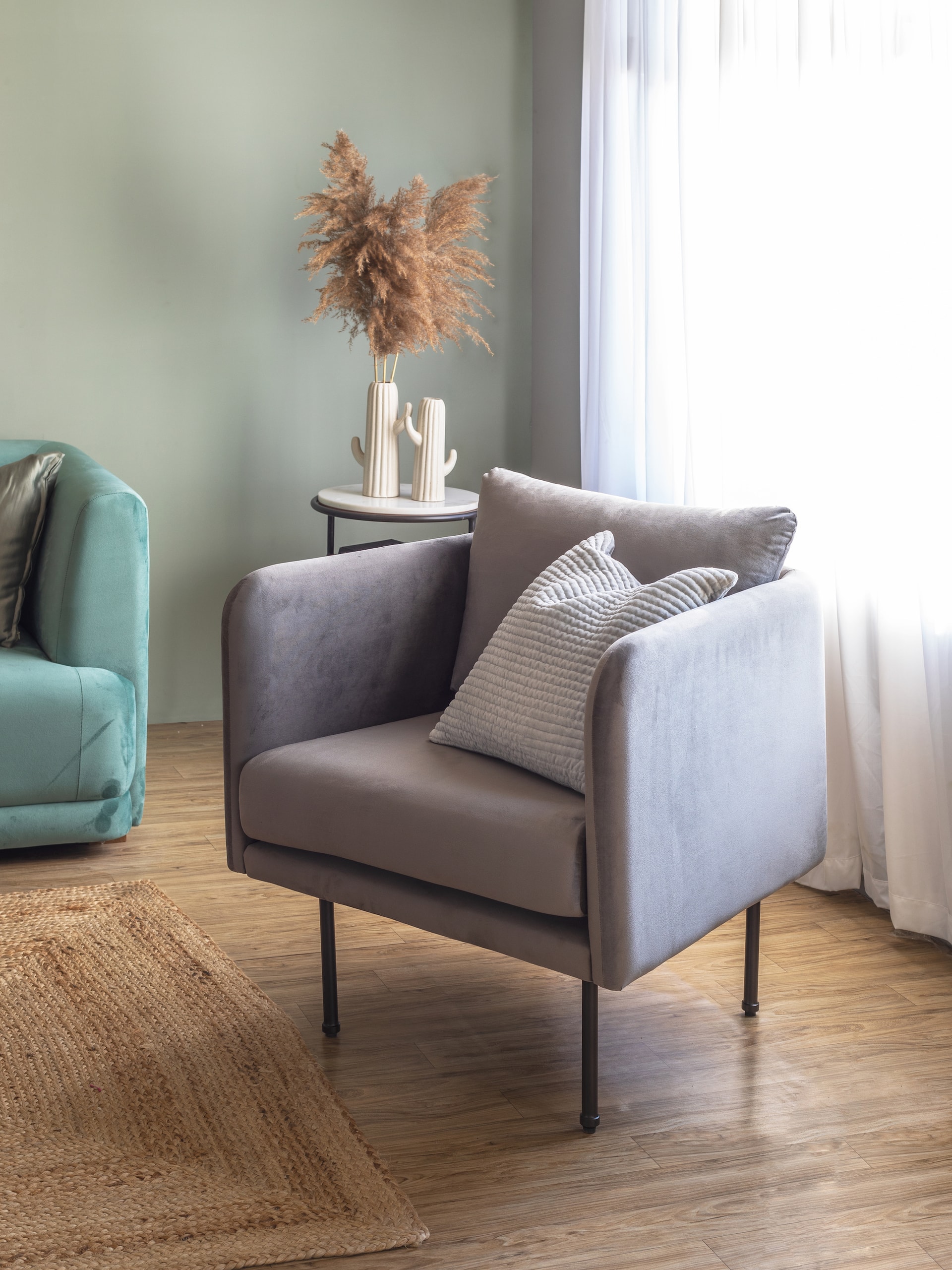 A minimalistic silhouette in a pearl grey hue, amply upholstered in the Daburu lounge chair stands elegantly on tall sleek legs enhanced with a powdered black finish, a temptation for lulled quietude. The feminine and curvaceous profile of the Katashi lounge sits like a throne on metal legs that boast an endearing black finish, speaking of unparalleled comfort in grey and mint green. Plush and captivating, the Maru lounge chair tempts of solitary quiescence on its curvaceous arms with feet tucked under. Sturdy wooden legs with an autumn brown finish, upholstered in calming grey, earthy pastel green and coral pink emanate a tranquil aura.