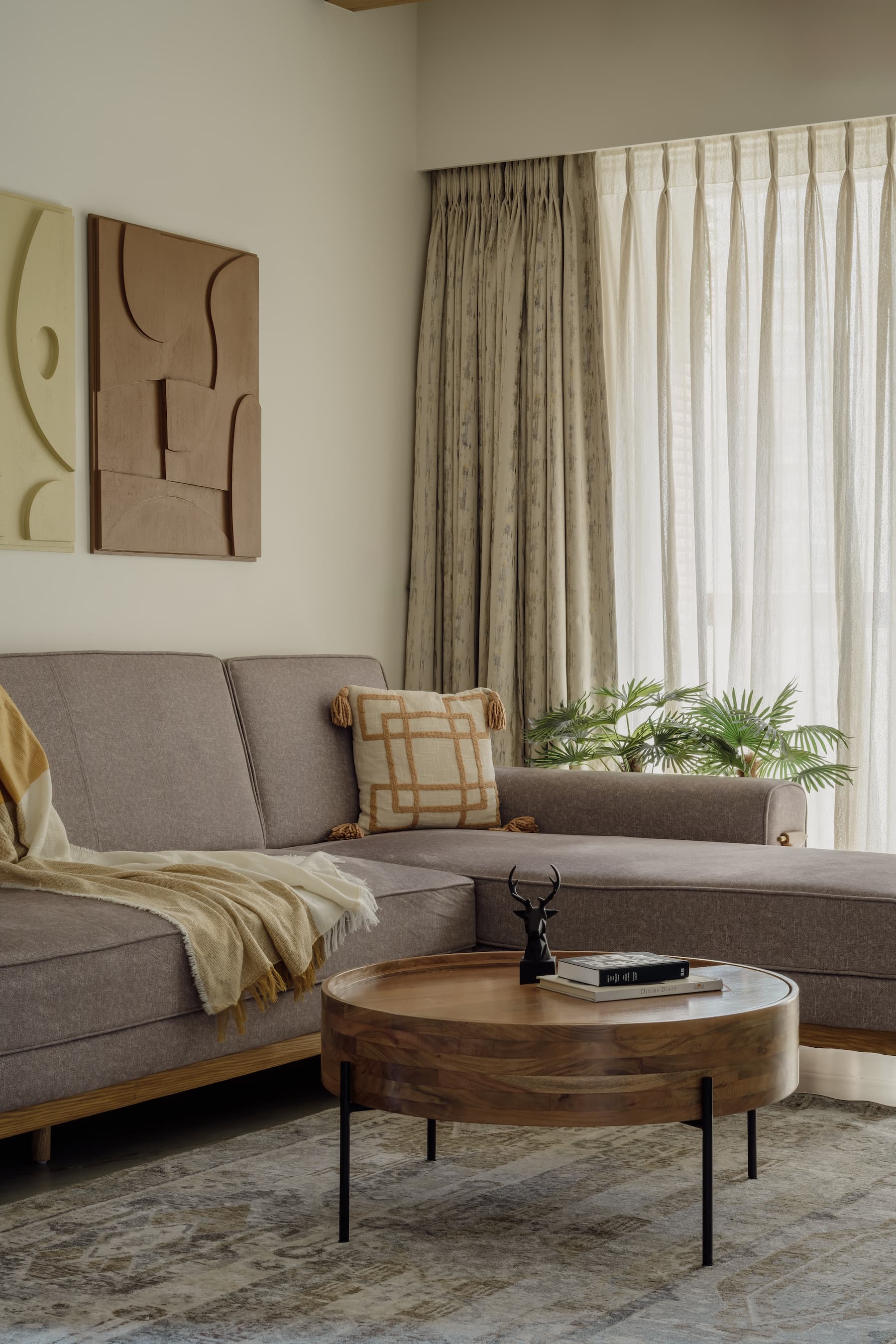 As one steps through the striking Blue PU door—a glossy, bold entryway—the journey into retro-inspired elegance begins. This doorway sets a playful yet sophisticated tone, seamlessly introducing the interior’s thematic richness. The living room, anchored by an L-shaped sofa and a wooden center table, is a testament to the design’s commitment to comfort and style. Here, abstract wall art in vivid hues forms a captivating focal point, energizing the space with a splash of creativity.