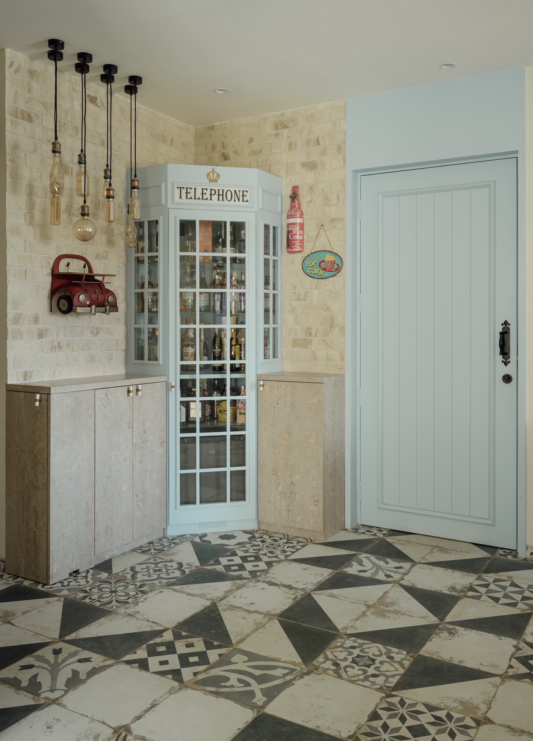 A whimsical touch is added by an English telephone booth repurposed as a bar cabinet, positioned in the open-plan living and dining area. This playful, functional piece serves as both a storage solution and a focal point, enhancing the room’s eclectic appeal.