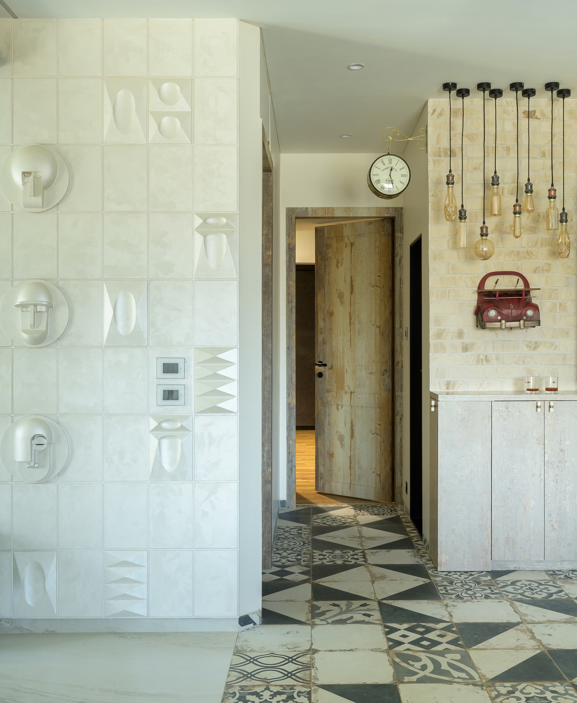 A standout element in the living room is the TV wall, a piece of artistic ingenuity. The wall, segmented into textured panels with random 3D geometric shapes and clay man masks, is finished in light texture paint, adding depth and visual intrigue. Complementing this feature is the rustic green TV unit, which ties in seamlessly with the retro aesthetic.