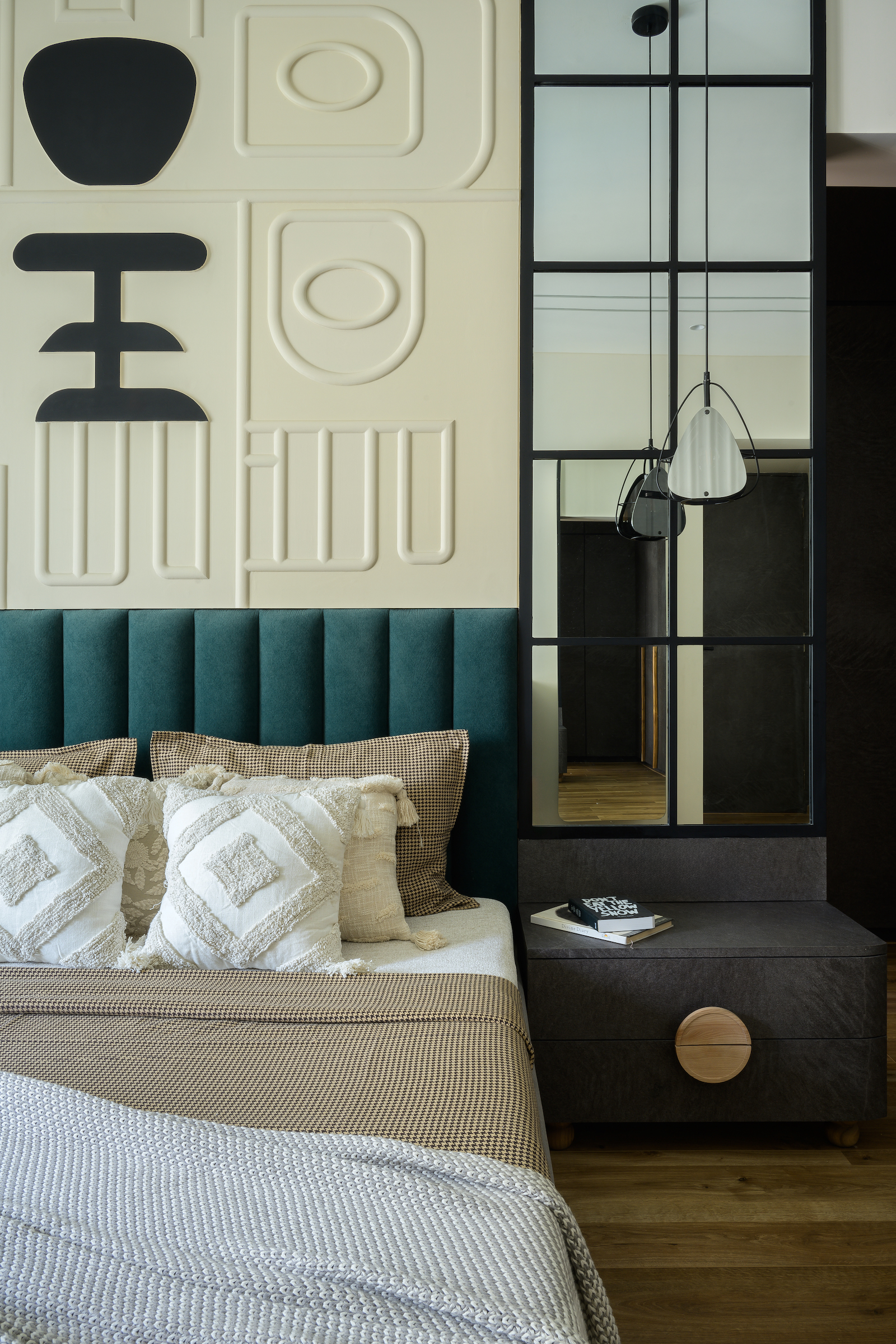 The master bedroom, a study in sophistication, showcases an emerald green headboard set against an abstract 3D art backdrop and framed by full-length mirrors arranged in a grid format. This dramatic focal point is complemented by an emerald green chest of drawers, doubling as a TV unit. Dark grey stone finish laminate and dark wooden flooring contribute to a serene, natural ambiance, blending modernity with a touch of tranquility.