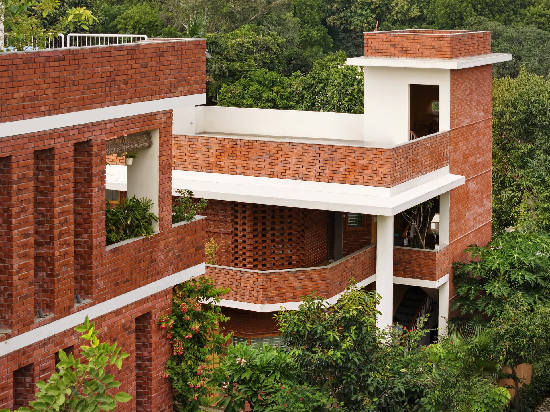Jaipur’s climatic extremes shaped several design decisions. The south façade is intentionally blank, relying on patterned brick bonds to articulate the surface while blocking harsh sun. Cross-ventilation, shaded corridors, and diffused lighting help reduce mechanical dependence. The tensile canopy at the staircase becomes both a climatic mediator and a spatial threshold, reinforcing the project’s emphasis on lightness and adaptability.