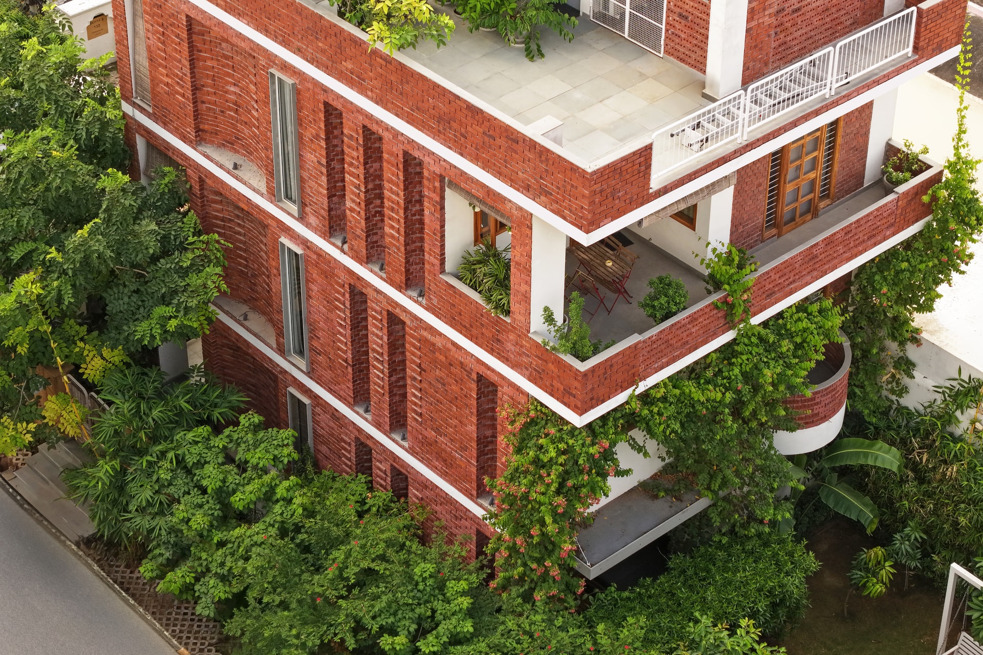 The garden acts as a contiguous ground plane shared between built volumes. A considered mix of fruiting trees, flowering shrubs, and climbers structures the open spaces, allowing seasonal variation to influence shading, fragrance, and colour. The east façade, overgrown with climbers, functions as an ecological extension of the ground, softening the verticality of the building and cooling the microclimate around it.