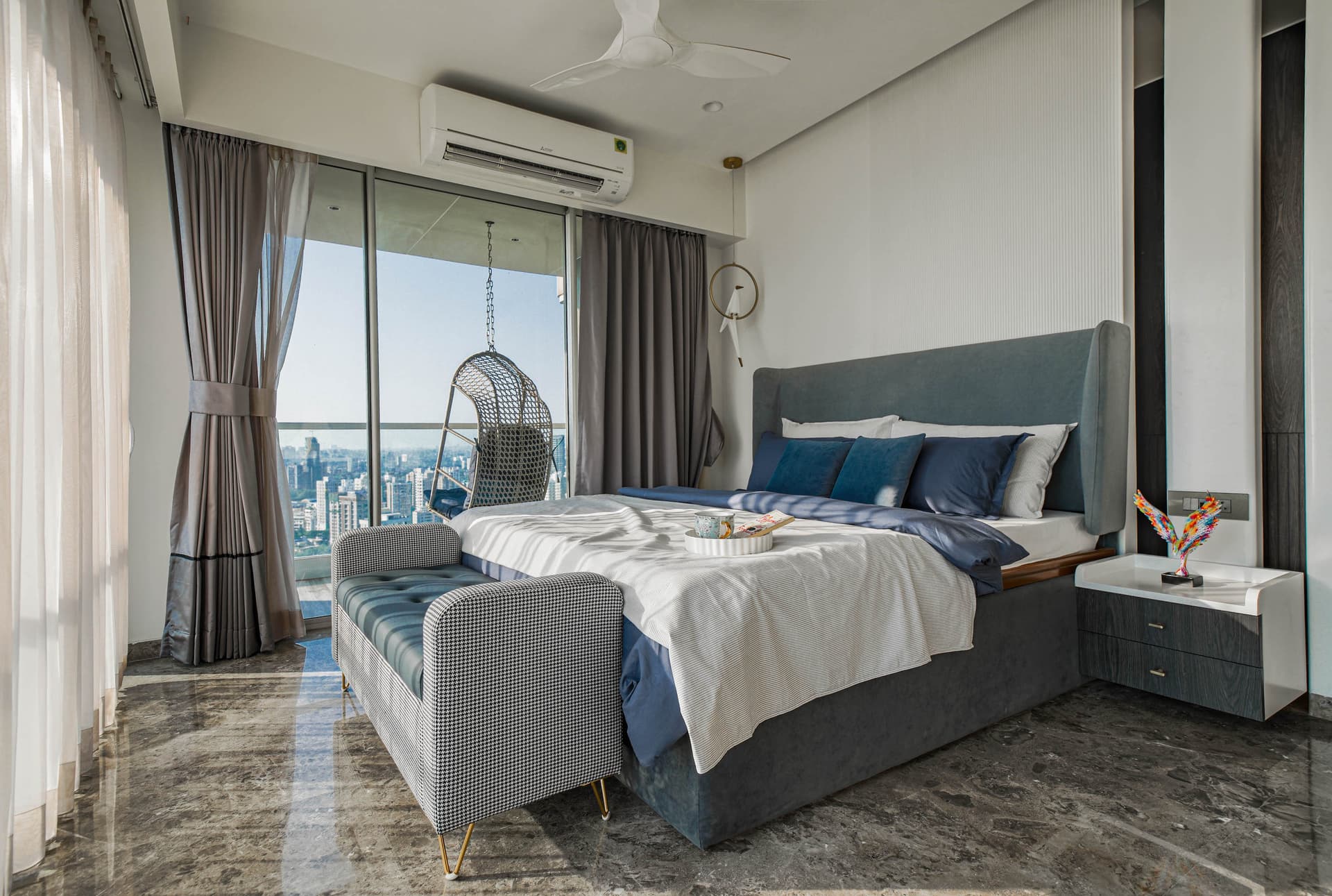 The boy’s bedroom is a harmonious blend of modern and classic design elements, creating a soothing and comfortable atmosphere. A palette of cool blues and greys is accentuated by a white canvas, lending the room a crisp, fresh feel. The upholstered bed with a fluted headboard wall, lends the space a timeless elegance. The bed is adorned with plush pillows and a cozy throw, inviting rest and relaxation. The bedroom also features an attached balcony with breathtaking views of the city skyline, providing a serene and inspiring backdrop. With its tasteful design and thoughtfully curated decor, this bedroom is a perfect retreat for rest, relaxation, and creative inspiration.