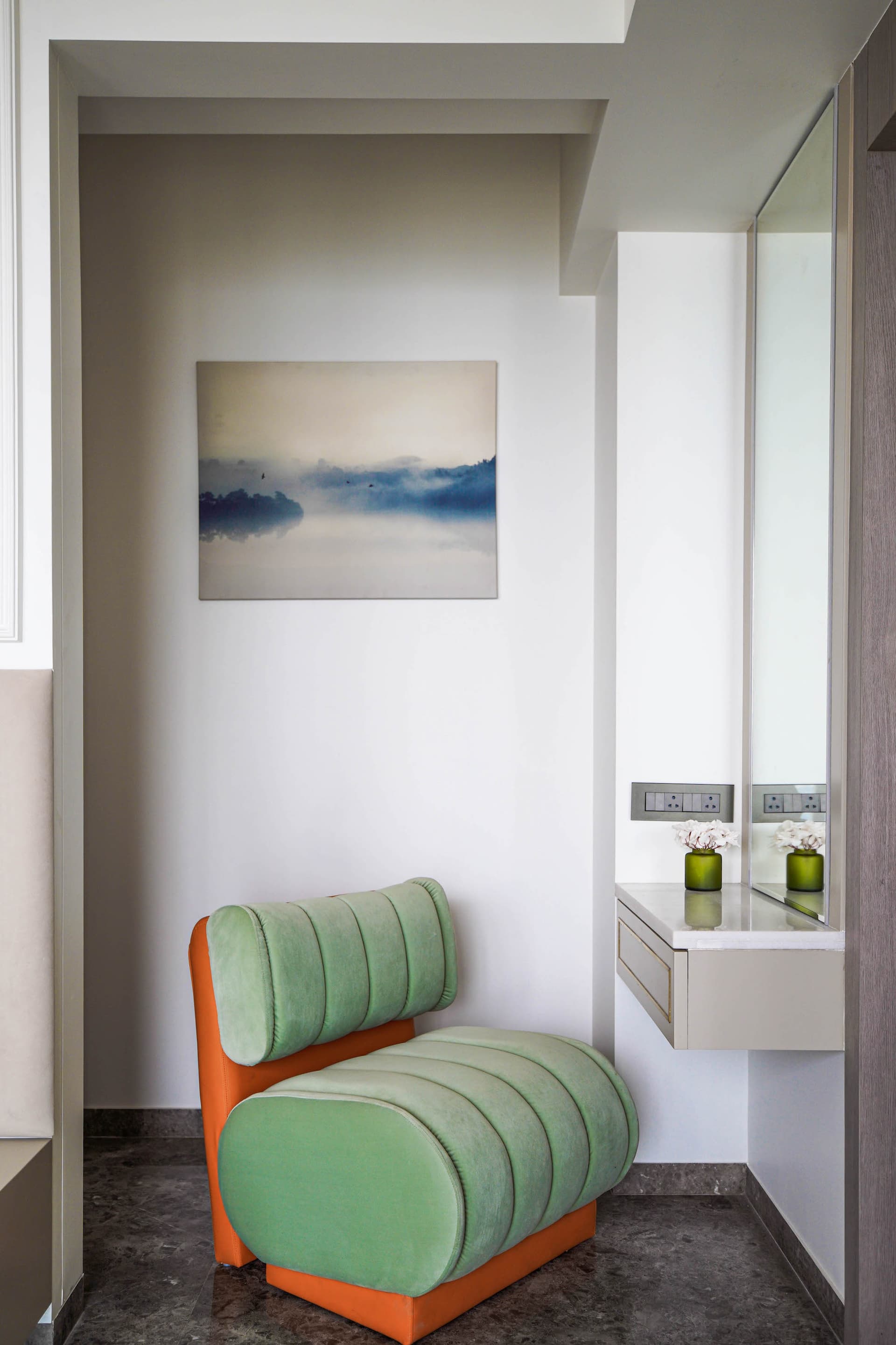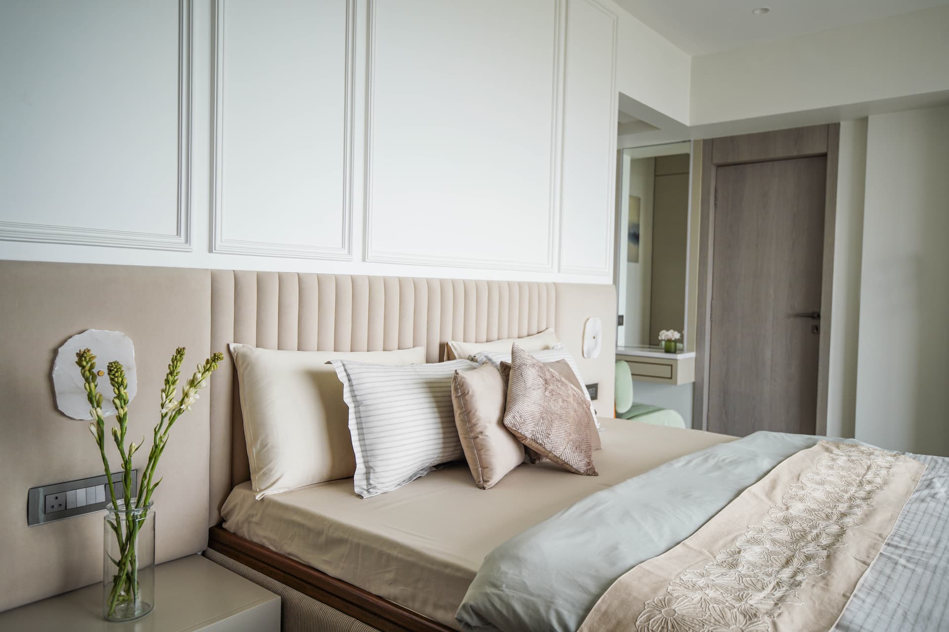 As you step into the master bedroom, you’re greeted by a sight that is nothing short of luxurious. The upholstered headboard immediately catches your eye, as does the beautifully detailed moulding on the walls. The colour palette is soothing and serene, with shades of beige and white dominating the space. However, a pop of colour is added through the choice of a vibrant chair that sits at the dresser. The combination of textures creates a tactile and inviting environment. This is truly a space designed for rest and relaxation, a serene sanctuary within the bustling city.