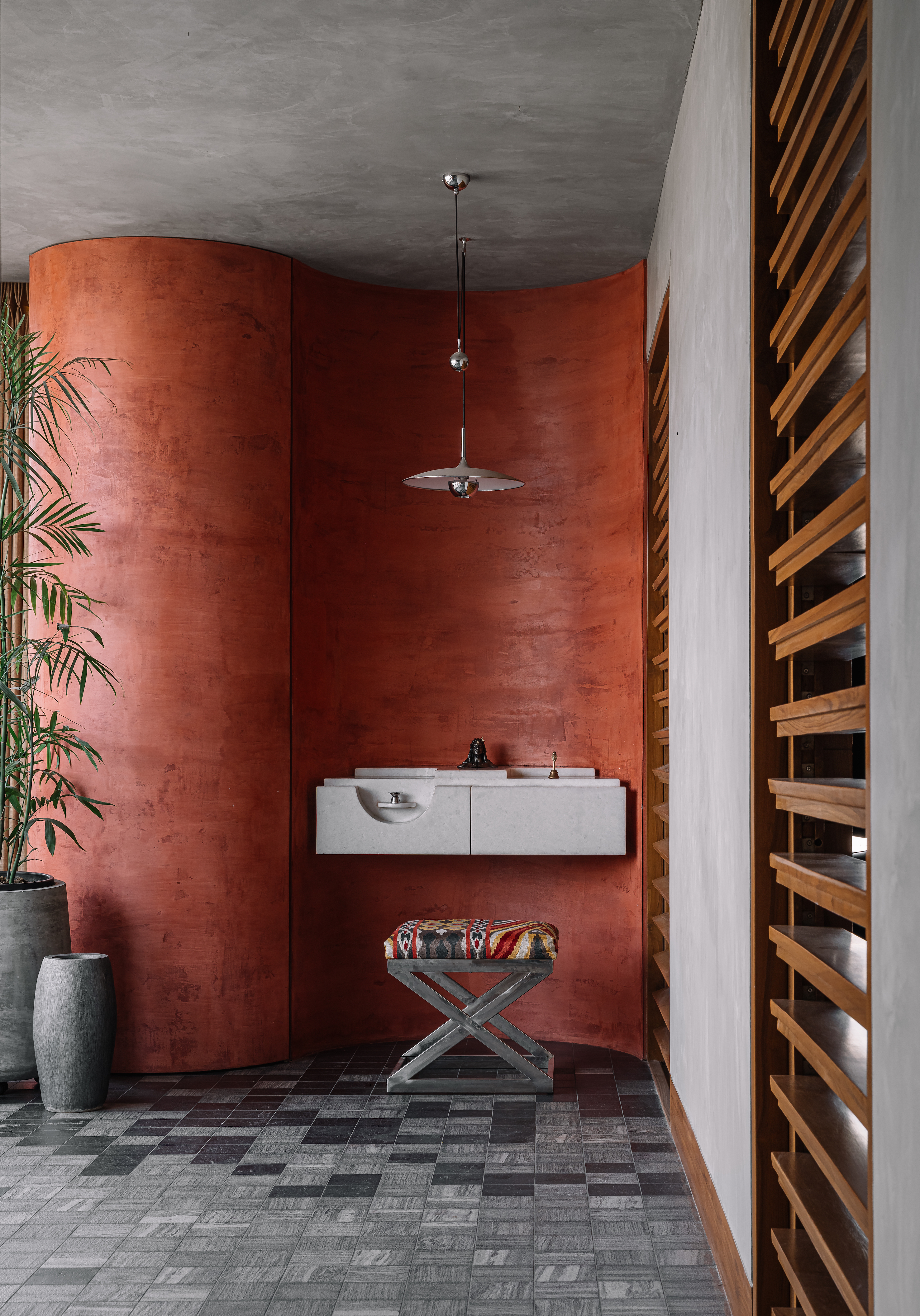 This interplay of transparency and opaque; neutral and colour pops; and rectilinear and curvilinear extends into other areas too. The prayer area in the courtyard is defined by a curved terracotta-hued lime plaster wall paired with a simple stone counter in front. The gentle curves also manifests in other places around the house, such as the stainless steel partition enclosing the kitchen basin and the curved pillar in the entry passage, concealing the services behind. In the library area, the play appears in the form of the change in flooring pattern continued through the use of waste marble pieces–a thoughtful gesture that minimises material consumption.