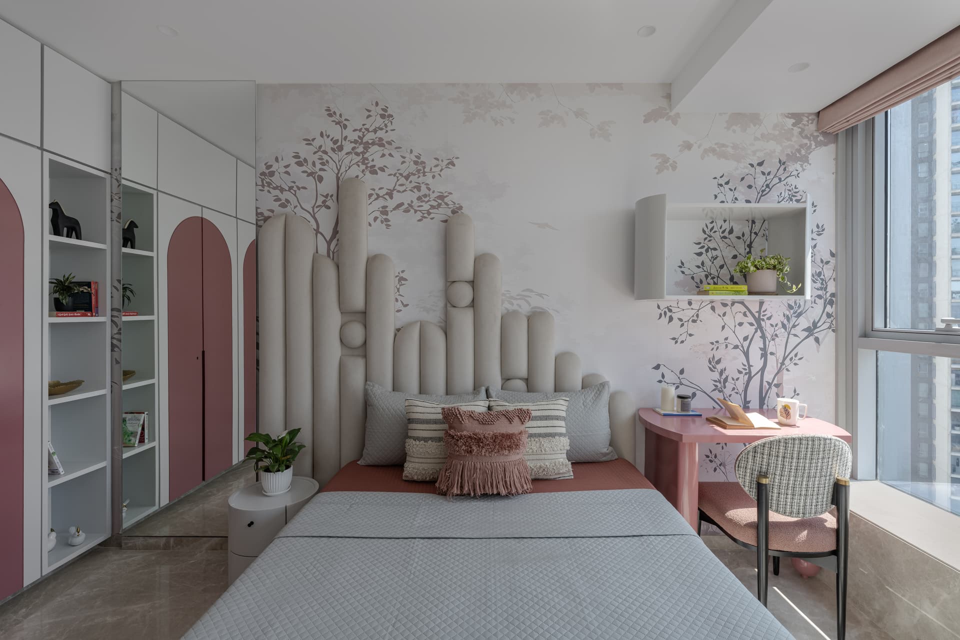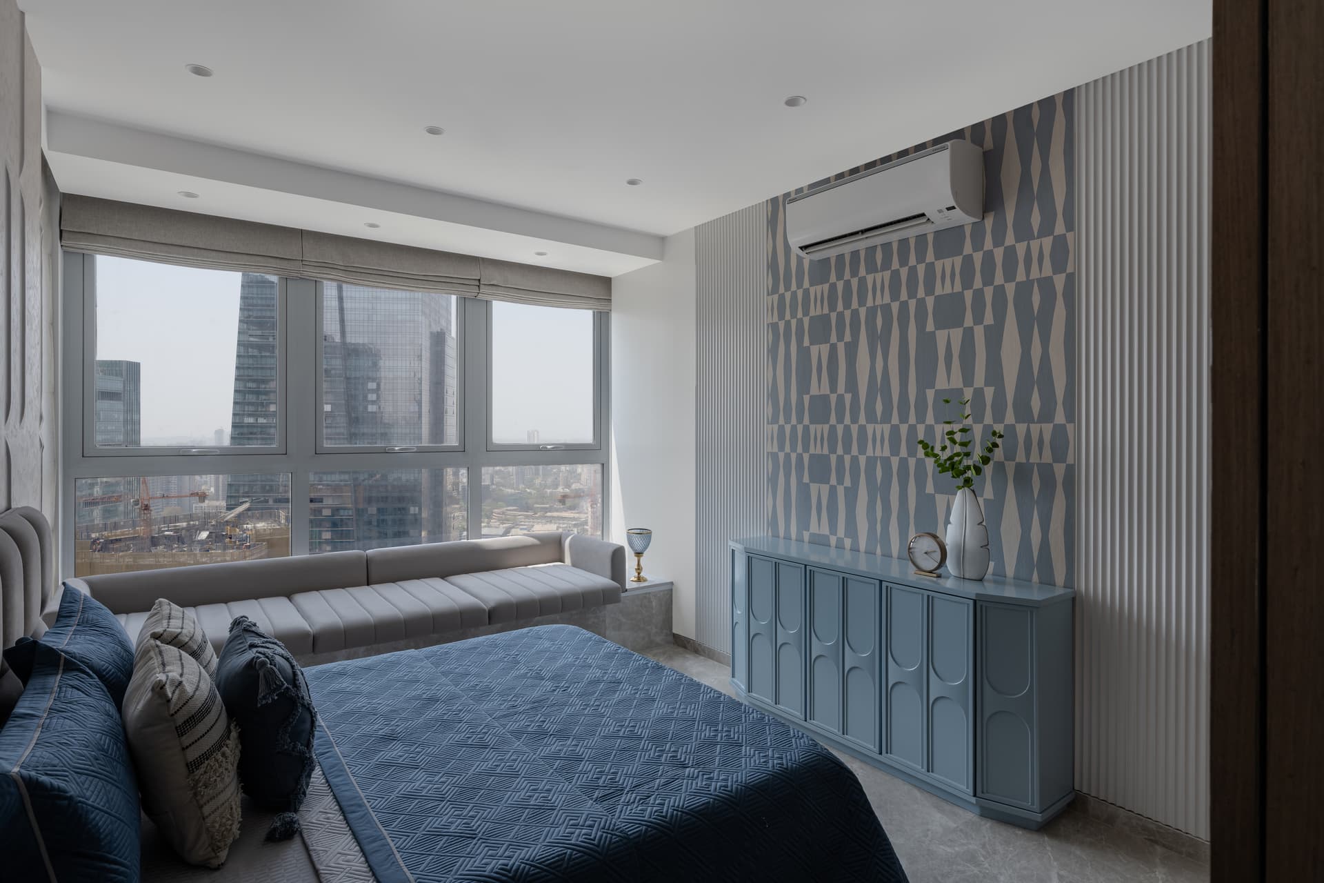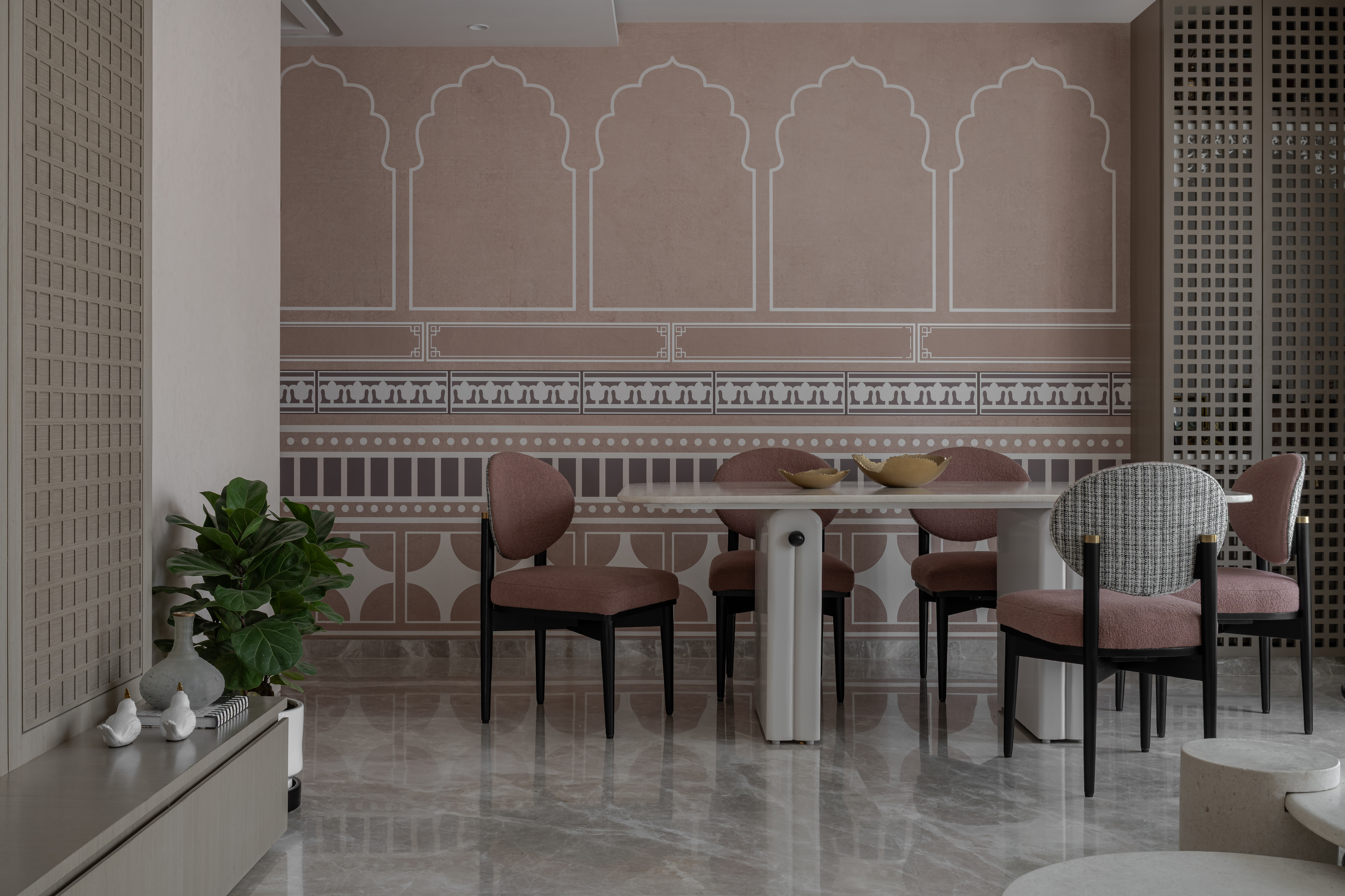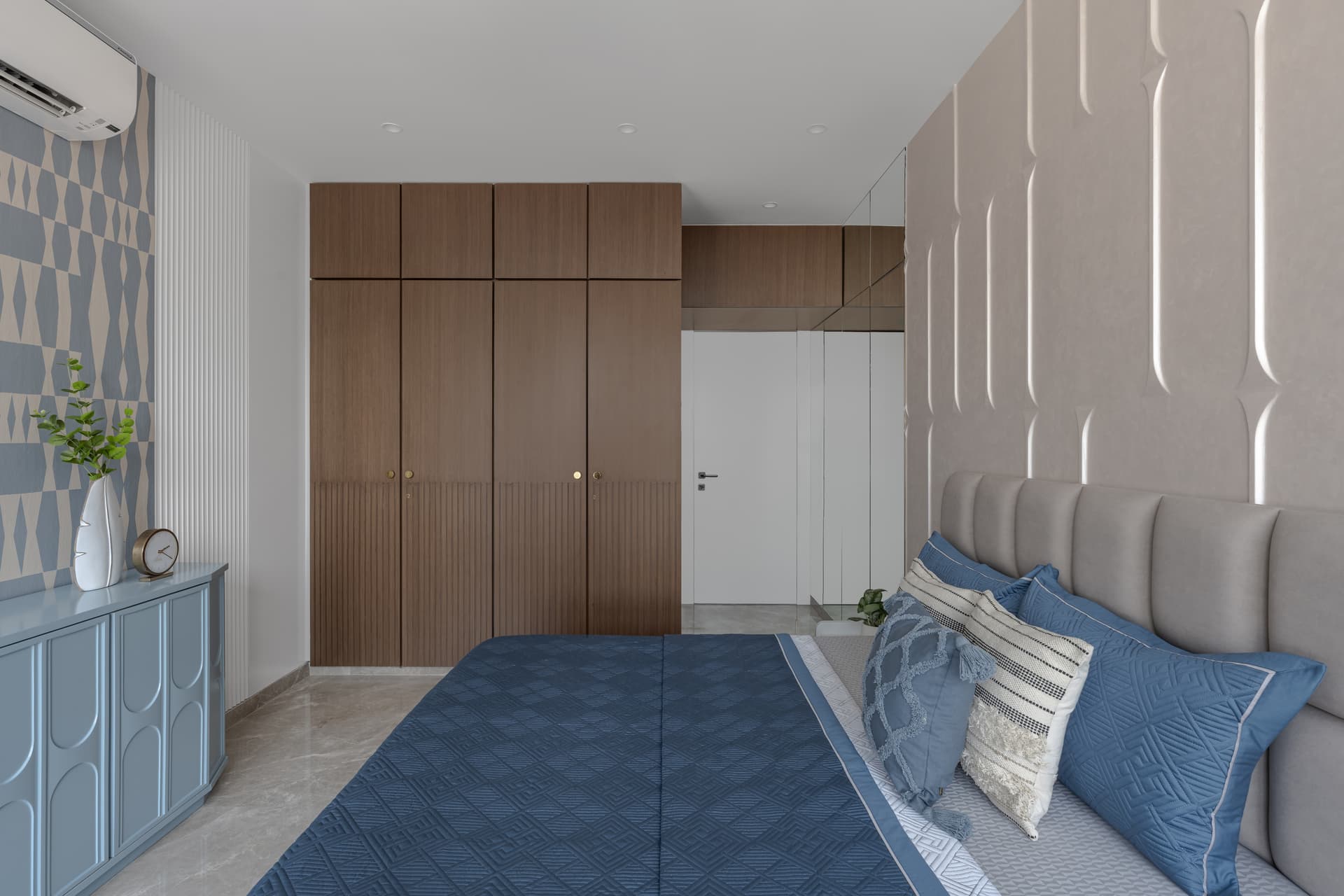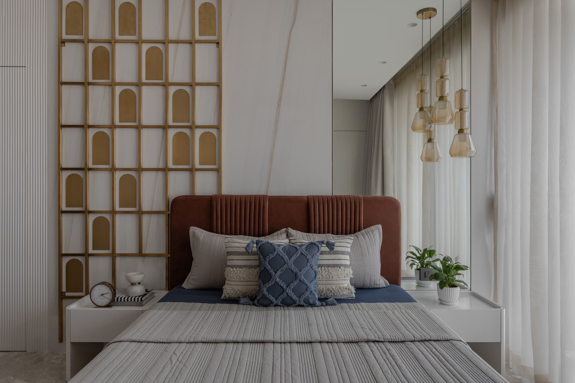The dining space continues this dialogue between craft and modernity, functioning as both a social anchor and a visual pause. Natural materials, warm metallic accents, and subtle textural contrasts shape an atmosphere that feels intimate yet refined. Modern lighting interventions prevent the space from slipping into nostalgia, reinforcing the project’s contemporary posture. Across the private zones, the bedrooms adopt an even softer expression of the design philosophy. Muted palettes, woven details, and restrained material contrasts cultivate a sense of retreat, spaces designed for quietude rather than display.