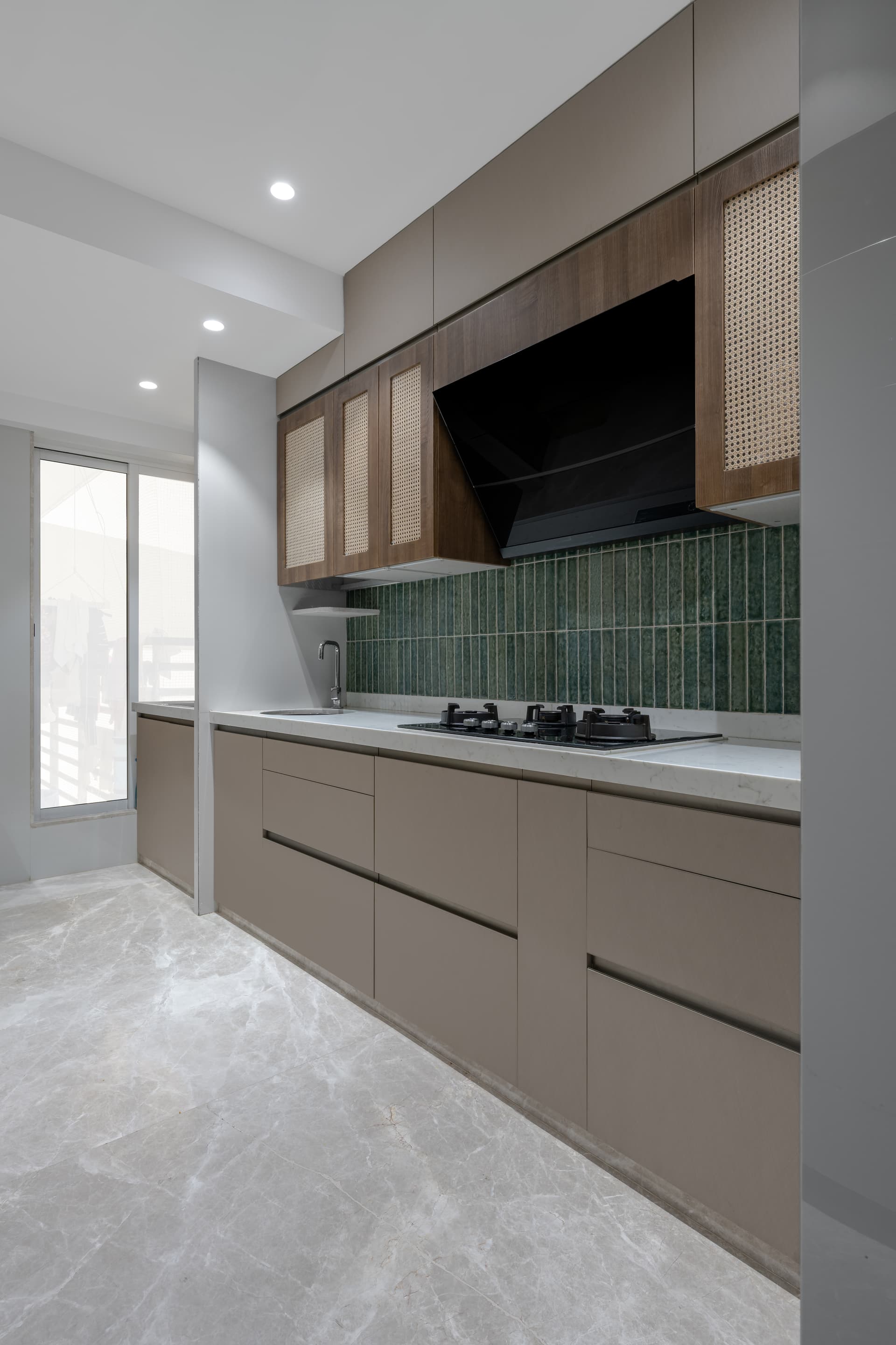 At the heart of the home lies a philosophy that views culture as something to be lived rather than displayed. This approach steers the design away from overt ornamentation, favoring a layered material narrative that feels tactile, grounded, and timeless. Hand-carved wood surfaces introduce depth and individuality, carrying the subtle irregularities that only human touch can produce. Woven cane and natural rattan lend visual lightness, softening the architectural framework while reinforcing a connection to indigenous craft traditions. Aged brass accents punctuate the palette with warmth, their muted glow acting as a quiet counterpoint to the otherwise earthy composition.