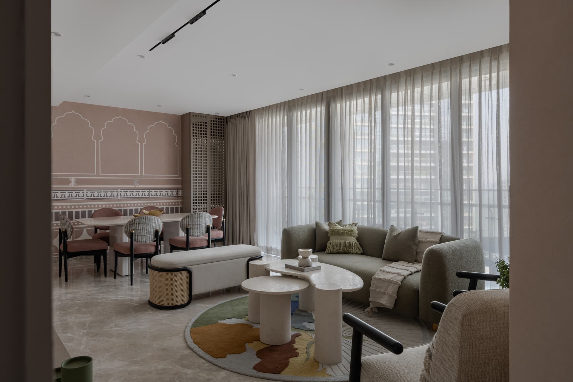 The spatial planning reinforces this sense of restraint and clarity. Open, breathable layouts encourage visual continuity, allowing natural light and material textures to shape the experience of the interiors. Clean-lined furniture and controlled compositions ensure that the richness of craft never descends into visual clutter. Instead, each space reads as calm and intentional, an environment where sensory warmth replaces decorative density. This balance between material richness and visual stillness becomes one of the defining achievements of the project.