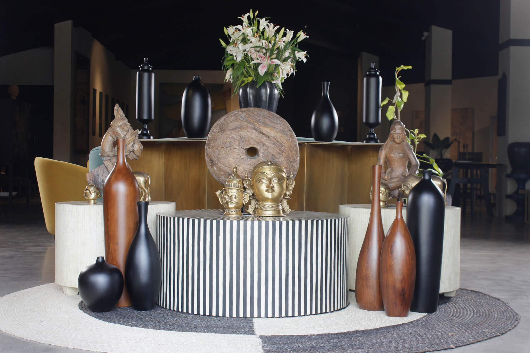 Elevate your coffee table collection with the Emer coffee table, a lavishly detailed resin and bone inlay that portrays the perfect canvas for styling with its monochromatic hues. And to serve with magic and luxury, there is the Thali Platter – Bindu that narrates an enchanting tale with enamelled tantric symbols spelling out the mysteries of oneness. Just like the meditative quintessence of the Traya wall mural, a fluid and abstract composition plays out in three circles, exuding a tranquil, reflective and coruscating aura.