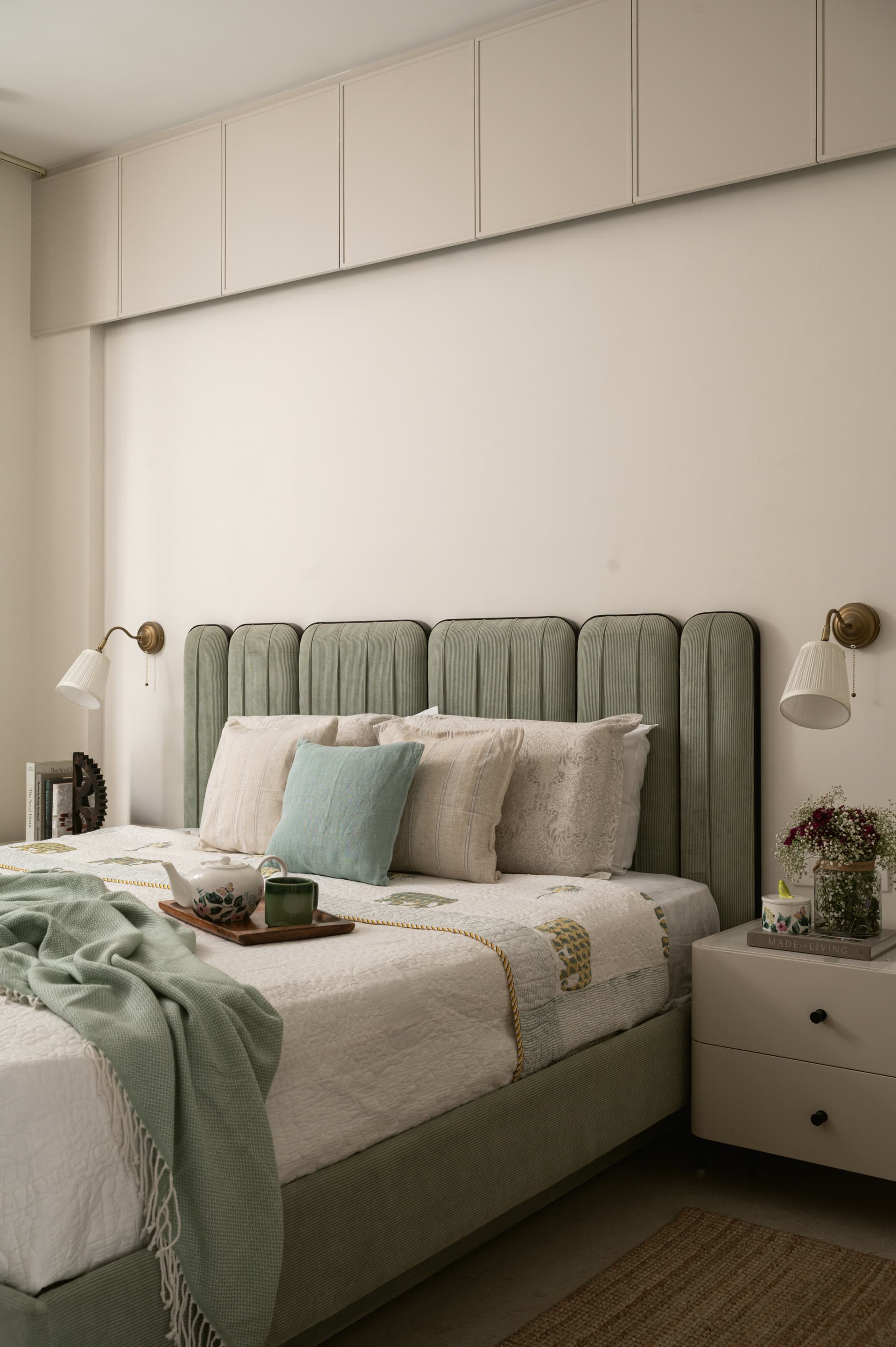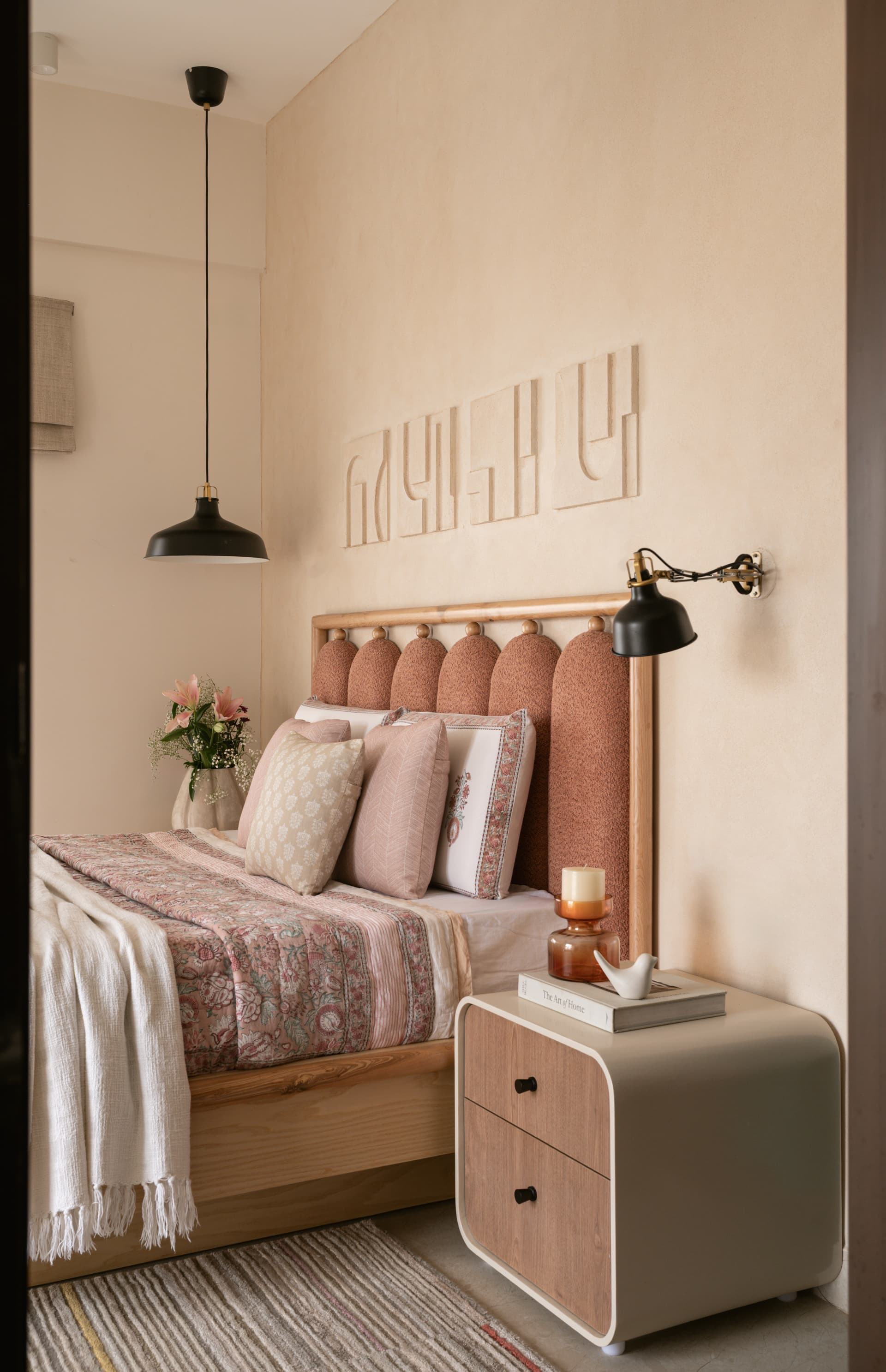 Each of the bedrooms follows a personalised approach to colour and mood. In one, an olive green headboard brings a sense of freshness, while another features a rust-toned backdrop that adds warmth and energy. Importantly, all bursts of colour are confined to loose furniture and furnishings, making future updates easy and cost-efficient. Custom side tables and a minimalist chest of drawers extend the home’s cohesive design language, enhancing both form and function.