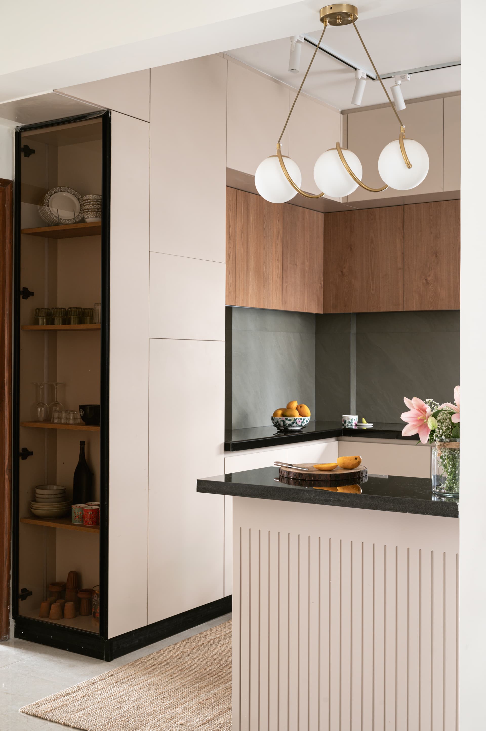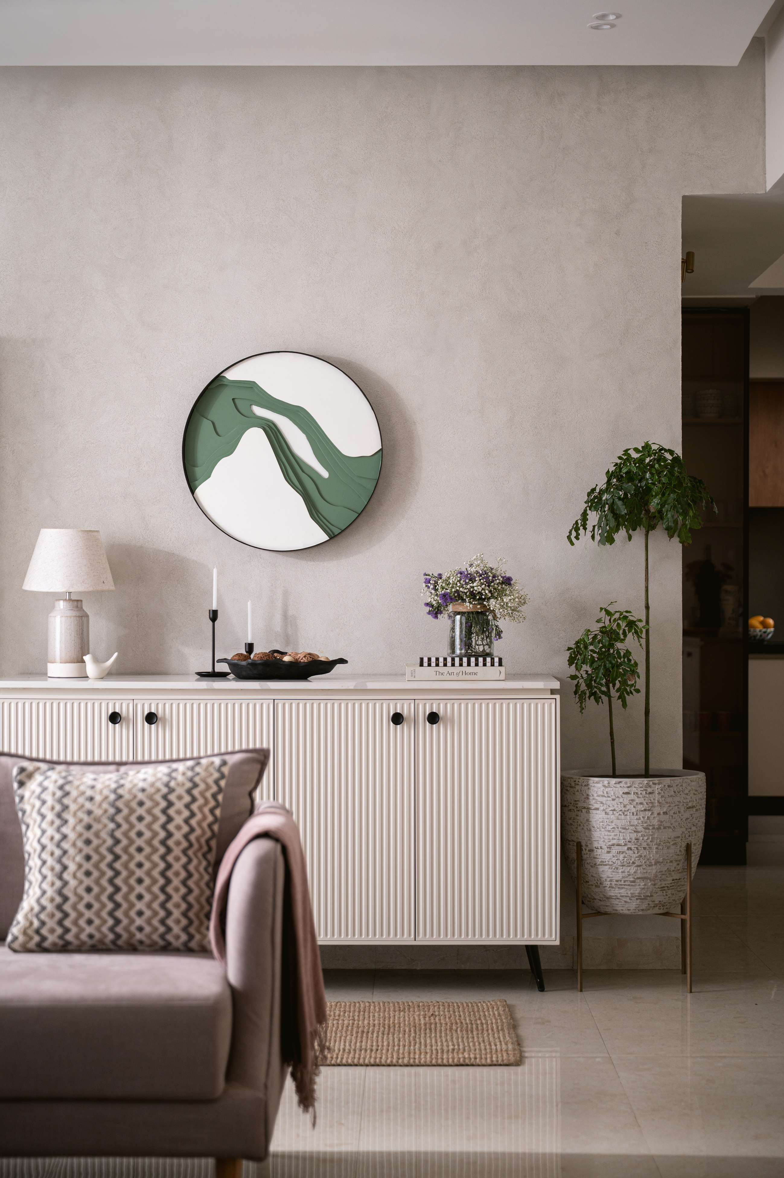 The living room exemplifies this design ethos. A low-back lilac sofa anchors the space, adding a gentle pop of colour without overwhelming the visual balance. The long main wall, often a challenge in apartments of this layout, is treated with custom panelling around the TV unit and entrance, unifying the surfaces and removing any visual disjoint. The console wall art, custom-designed for the family, becomes a subtle focal point, echoing their personality without being overt. In the kitchen, soft beige cabinetry and light wood textures meet sage green dado tiles, offering just the right hint of character. This understated culinary zone flows seamlessly into the dining area, allowing for effortless movement between daily routines and social moments.