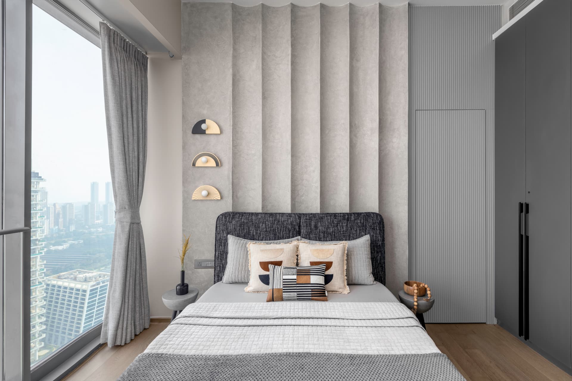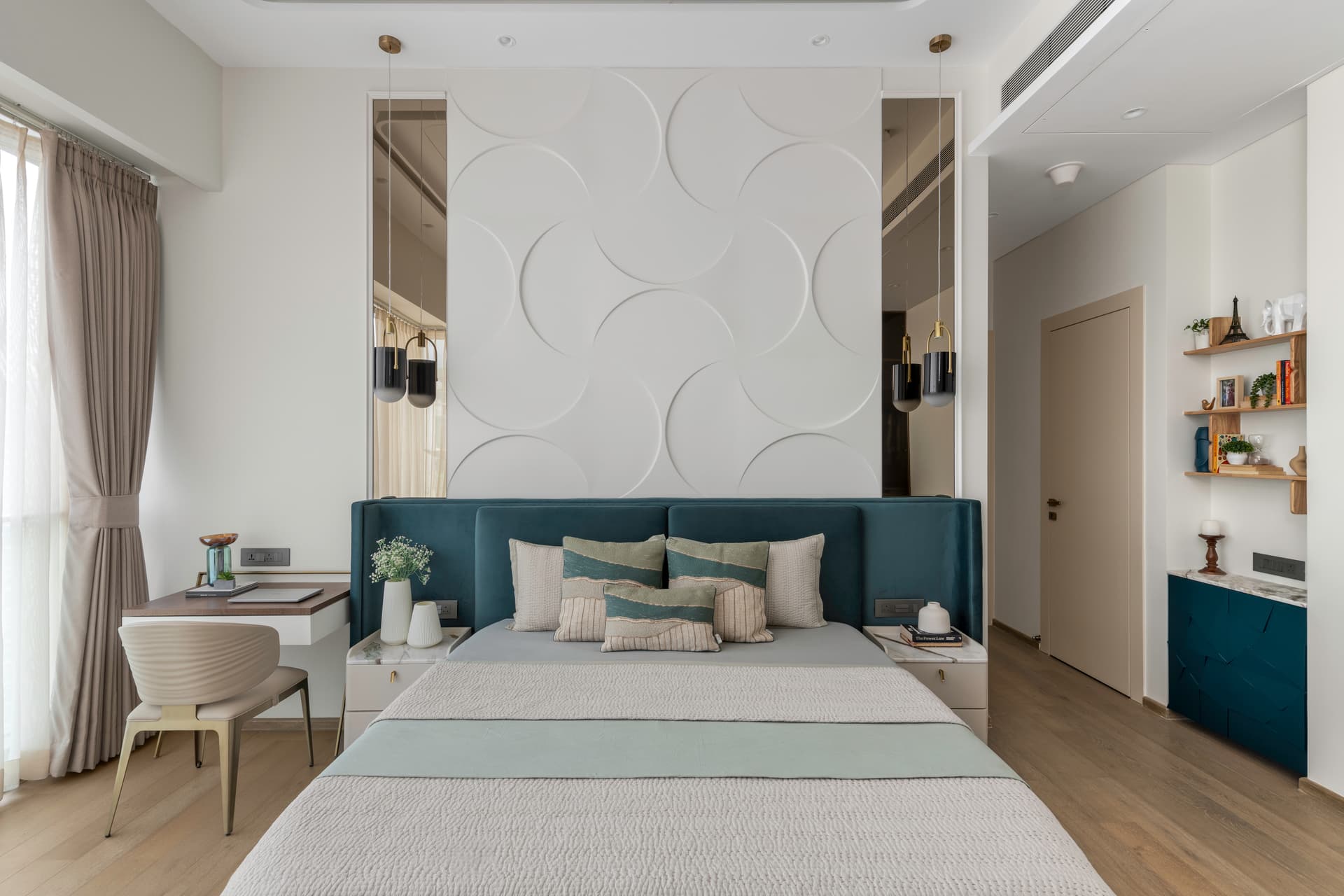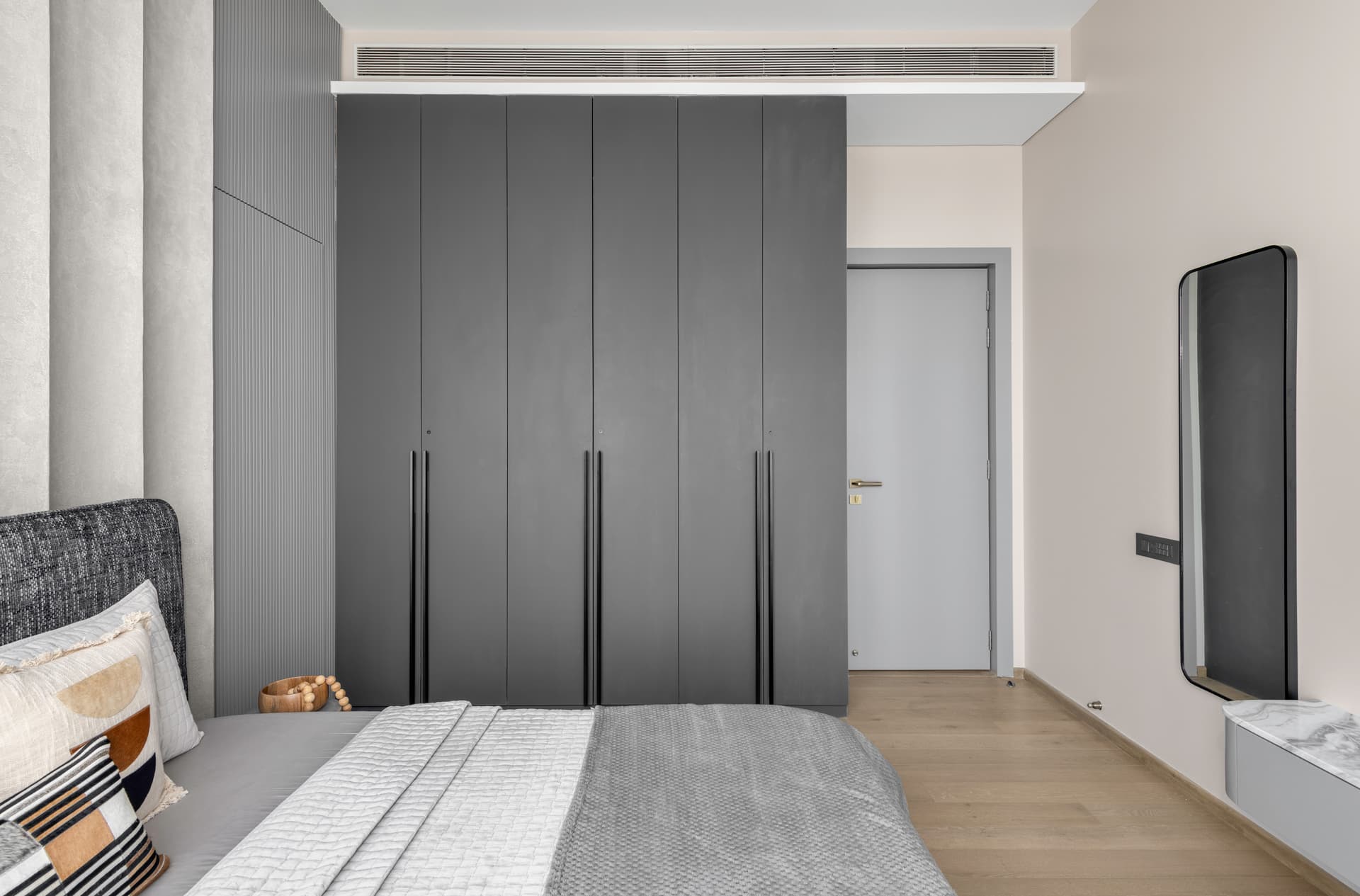 The master bedroom distills the essence of calm. Muted tones reminiscent of dawn’s first light meet sea-inspired blues in the upholstery, while a window-side bench invites pause. A cleverly integrated swivel TV unit merges seamlessly into the wardrobe, keeping the visual flow uninterrupted.