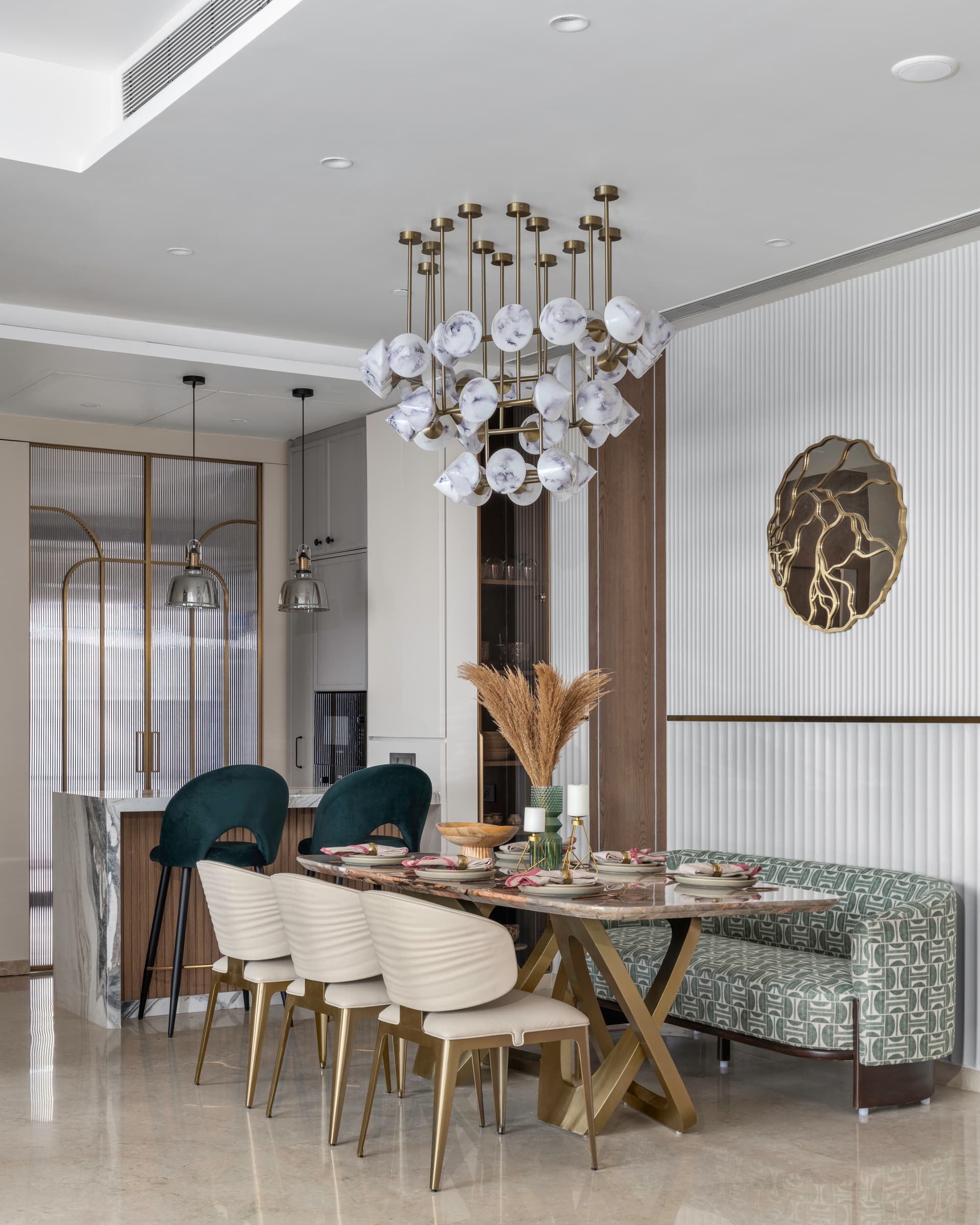 The dining area leans into understated glamour. A marble-topped table with gold-finished legs anchors the room, flanked by a custom-upholstered sofa on one side and sleek chairs on the other. Overhead, a bespoke chandelier glows like suspended poetry. The Boca do Lobo mirror, edged in gold, becomes a reflective canvas that captures shifting moods of the sea and sky, transforming with every hour of the day.
