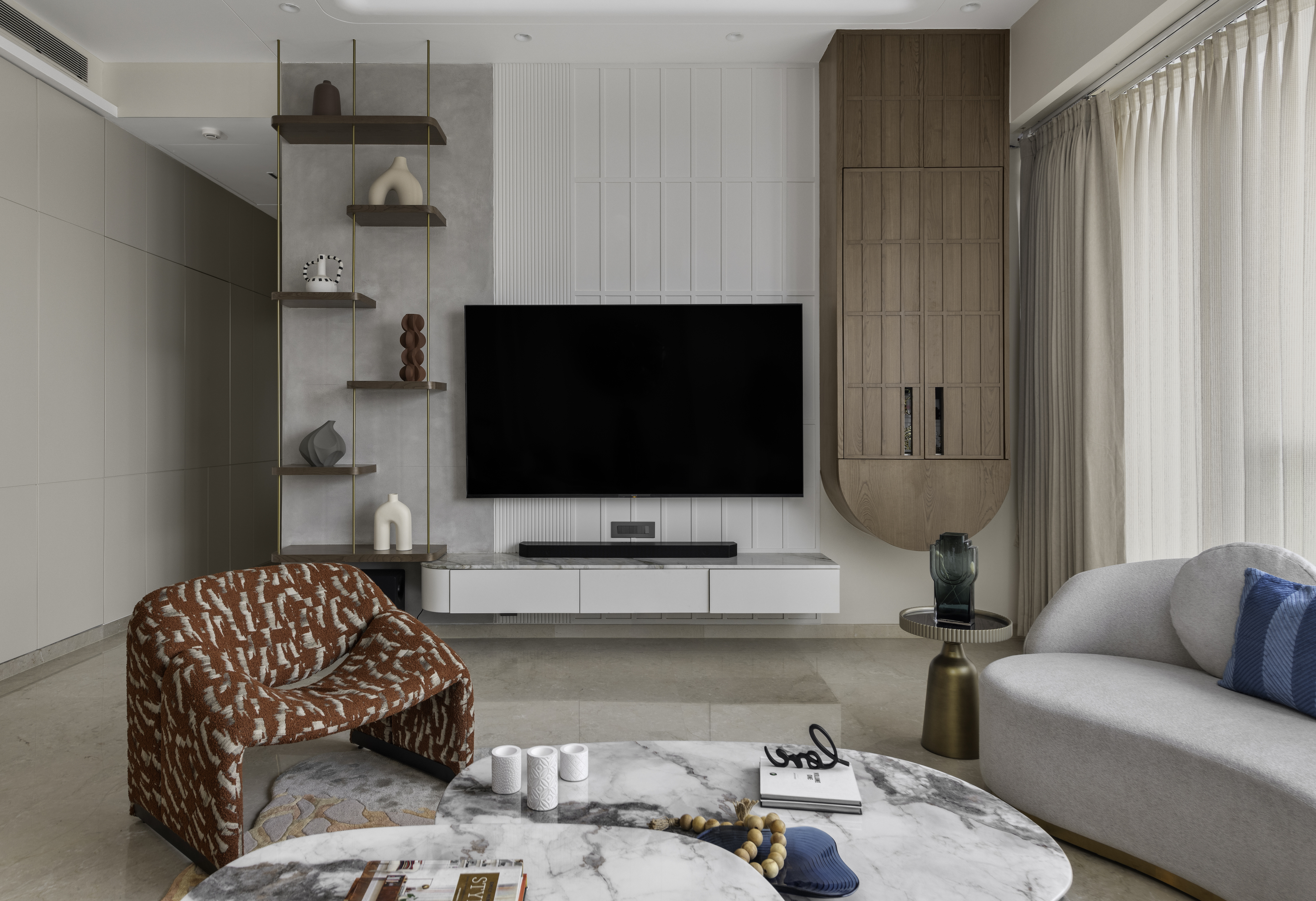The apartment’s soaring 12-foot ceilings, a rare luxury in Mumbai, are treated with quiet restraint. The pastel-toned envelope amplifies daylight, creating a dialogue between the city’s hazy horizon and the calm interior. Subtlety becomes a stage for surprise. In the living room, a textured wall with an earthy finish meets crisp white panels to form a serene backdrop for a sculptural artwork by Nitush Aroosh. Curvilinear furniture pieces seem to sway with the breeze outside, while bursts of saturated hues, a graphic rug here, a vibrant armchair there, animate the otherwise mellow palette.