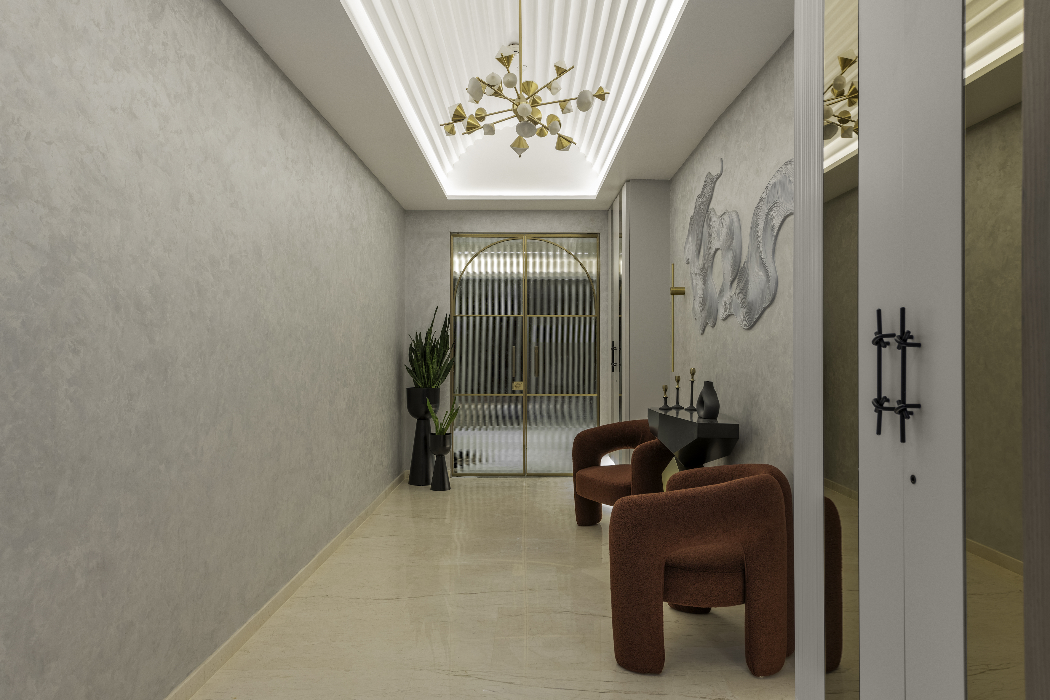 Just beyond, the kitchen introduces a playful counterpoint. The breakfast counter, dressed in exotic Amazon Green marble, conceals a bold surprise: rust-red cabinetry paired with white Caesarstone countertops and patterned Spanish tiles. The automated frosted glass panel, framed in brass, ensures the space transitions fluidly between open and private, social and silent.
