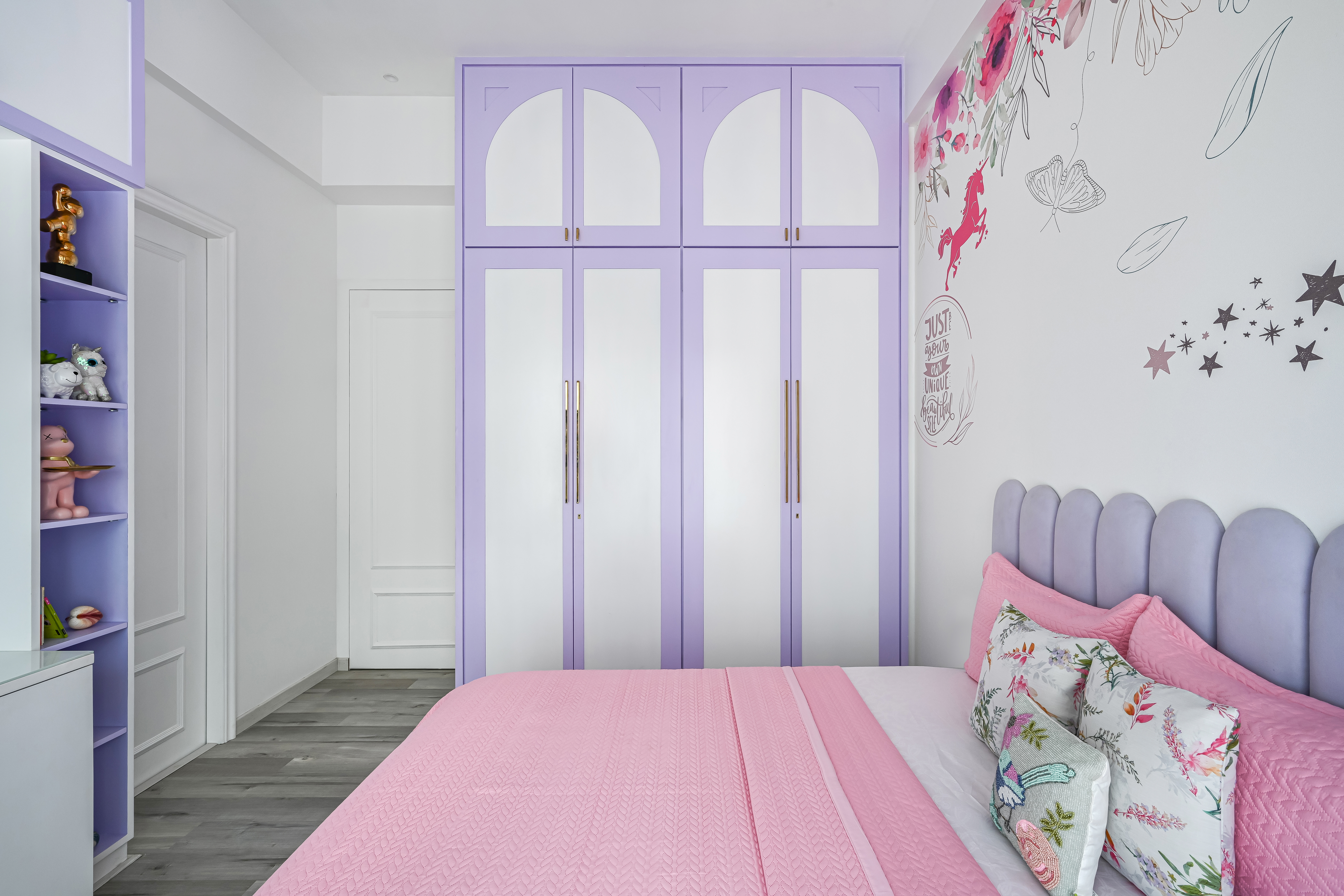 Daughters Bedroom with its unicorn themed pink and lavender colour scheme is a magical and whimsical space that feels playful and fun, while also being functional and comfortable. The colour scheme creates a dreamy and cheerful ambiance, the room is full of imagination and enchantment, a perfect place for the little girl to play, sleep and dream of unicorns.