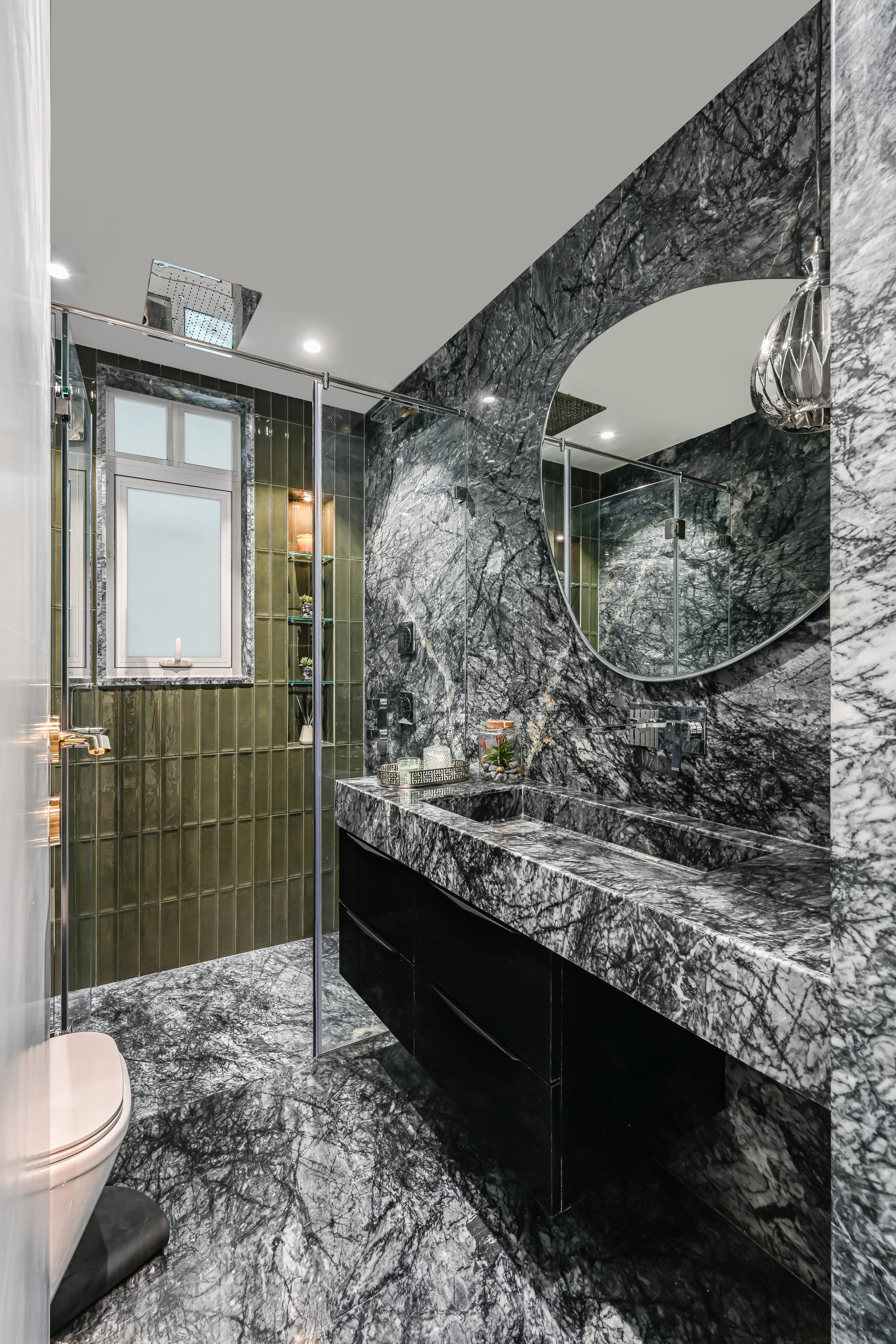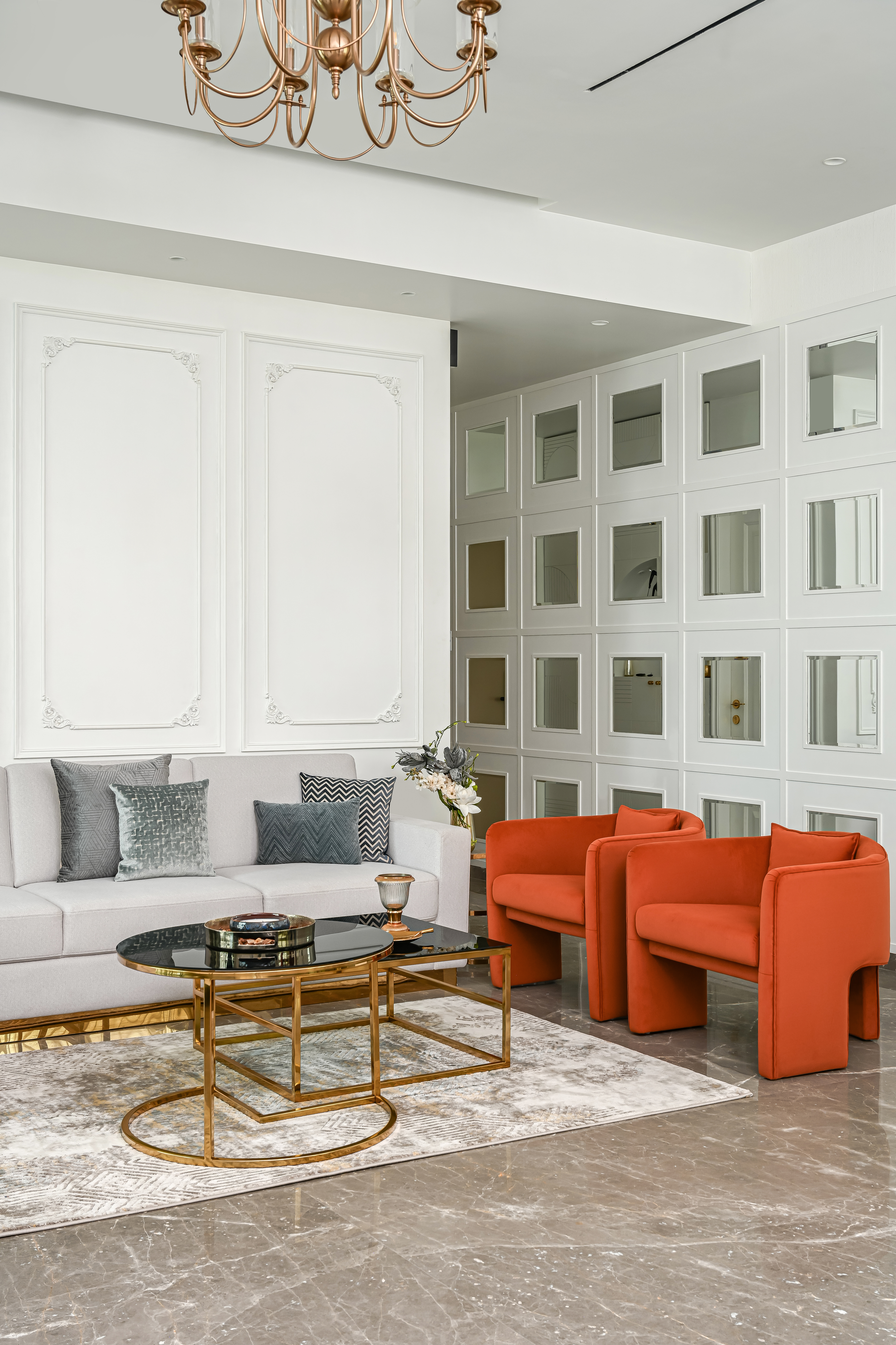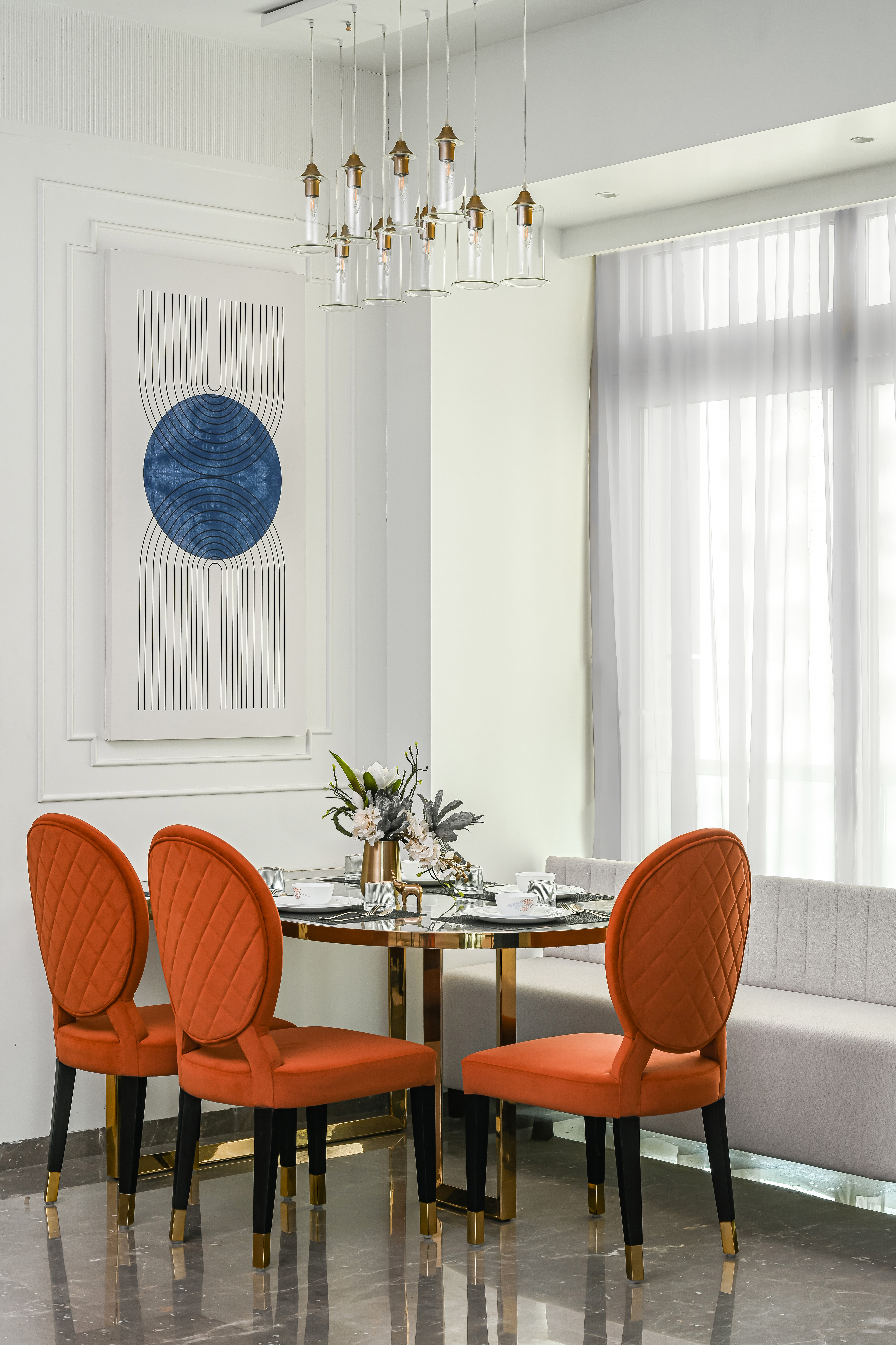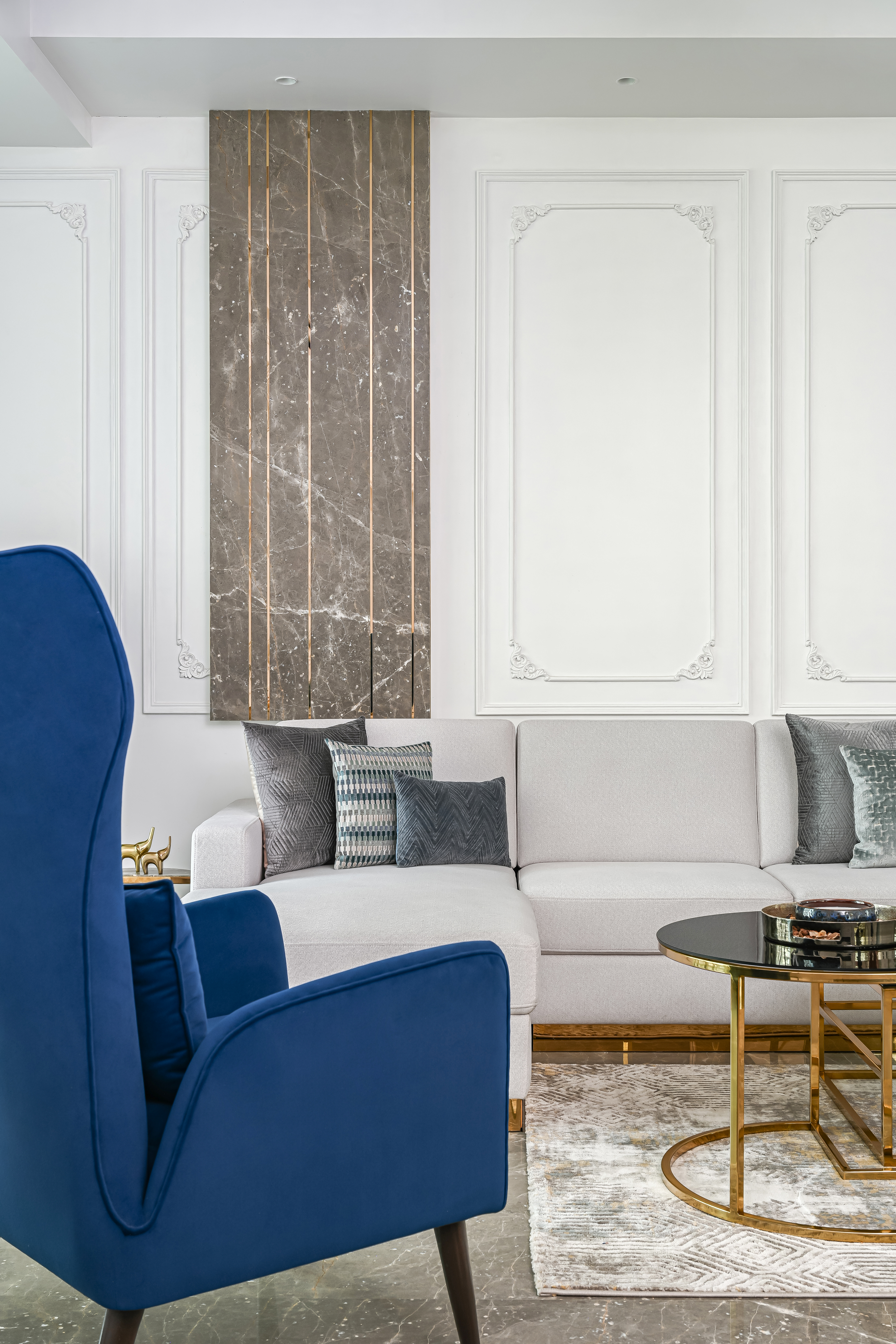 The home reflects a neutral colour scheme that is soothing to the eye with vibrant contrasting colours in loose furniture and artwork. The design scheme is characterised by its grandeur, elegance and sophistication, inspired by ancient Greek and Roman design motifs reinterpreted in a more minimal and understated manner, incorporating clean lines, neutral colour palettes, and sleek materials.