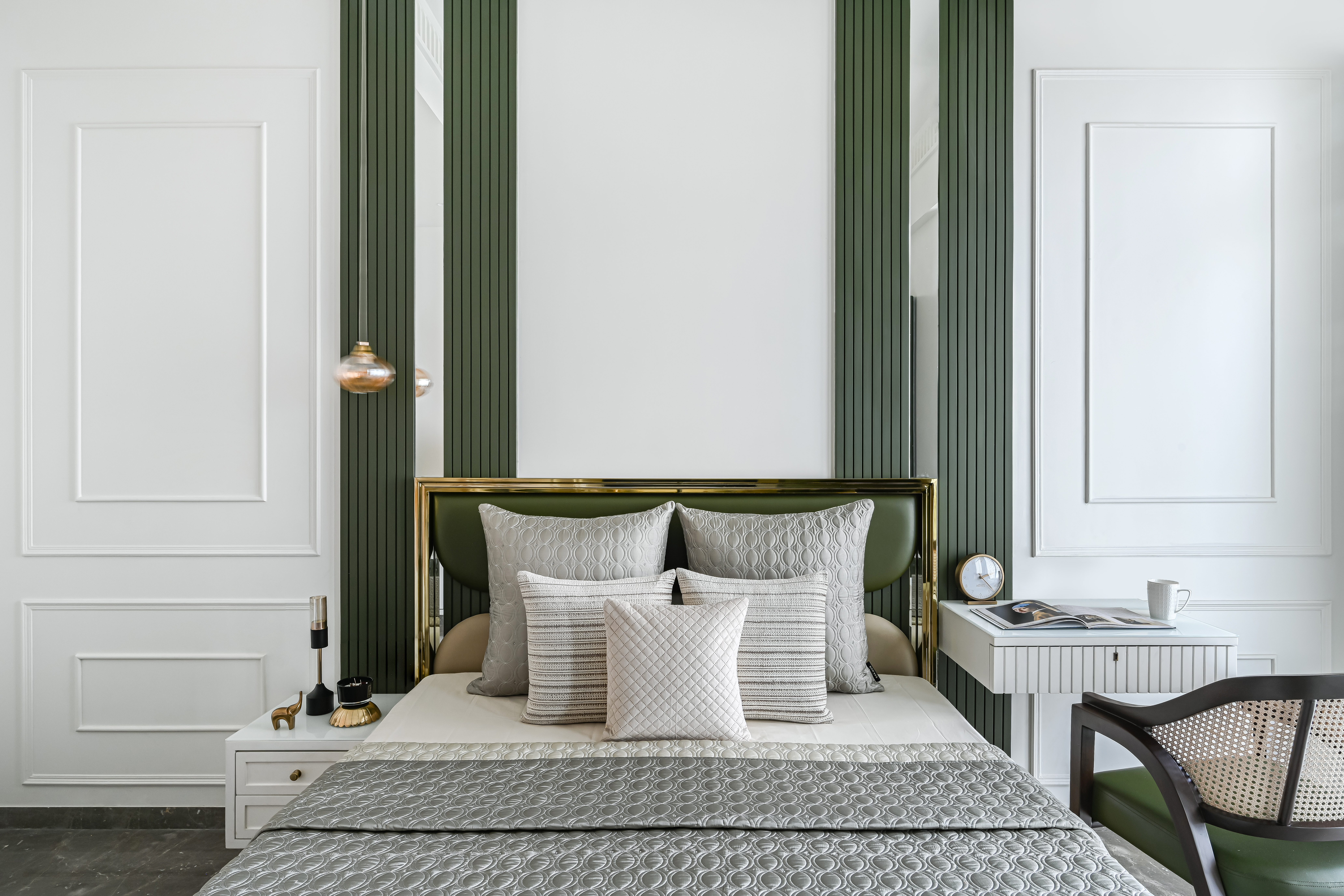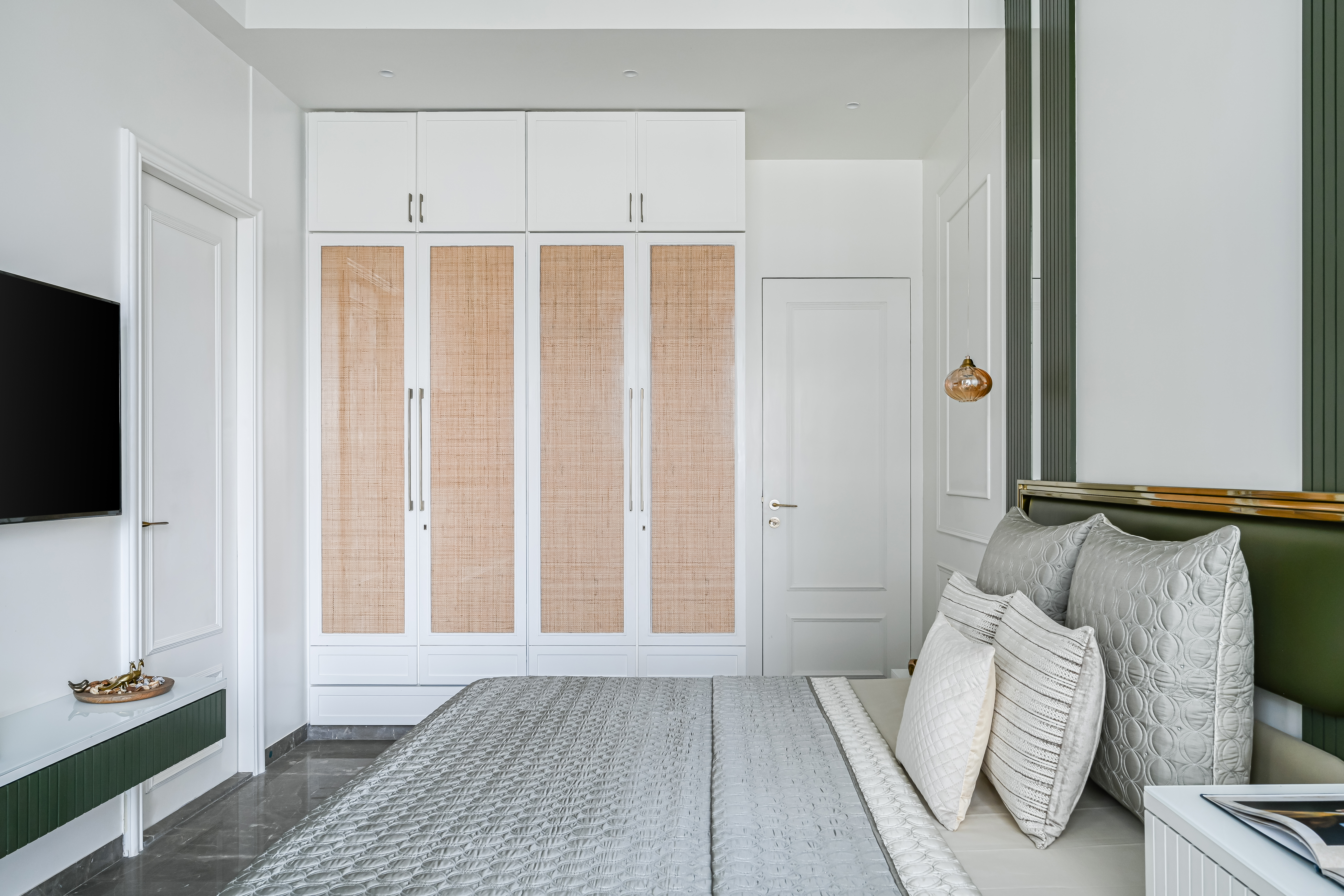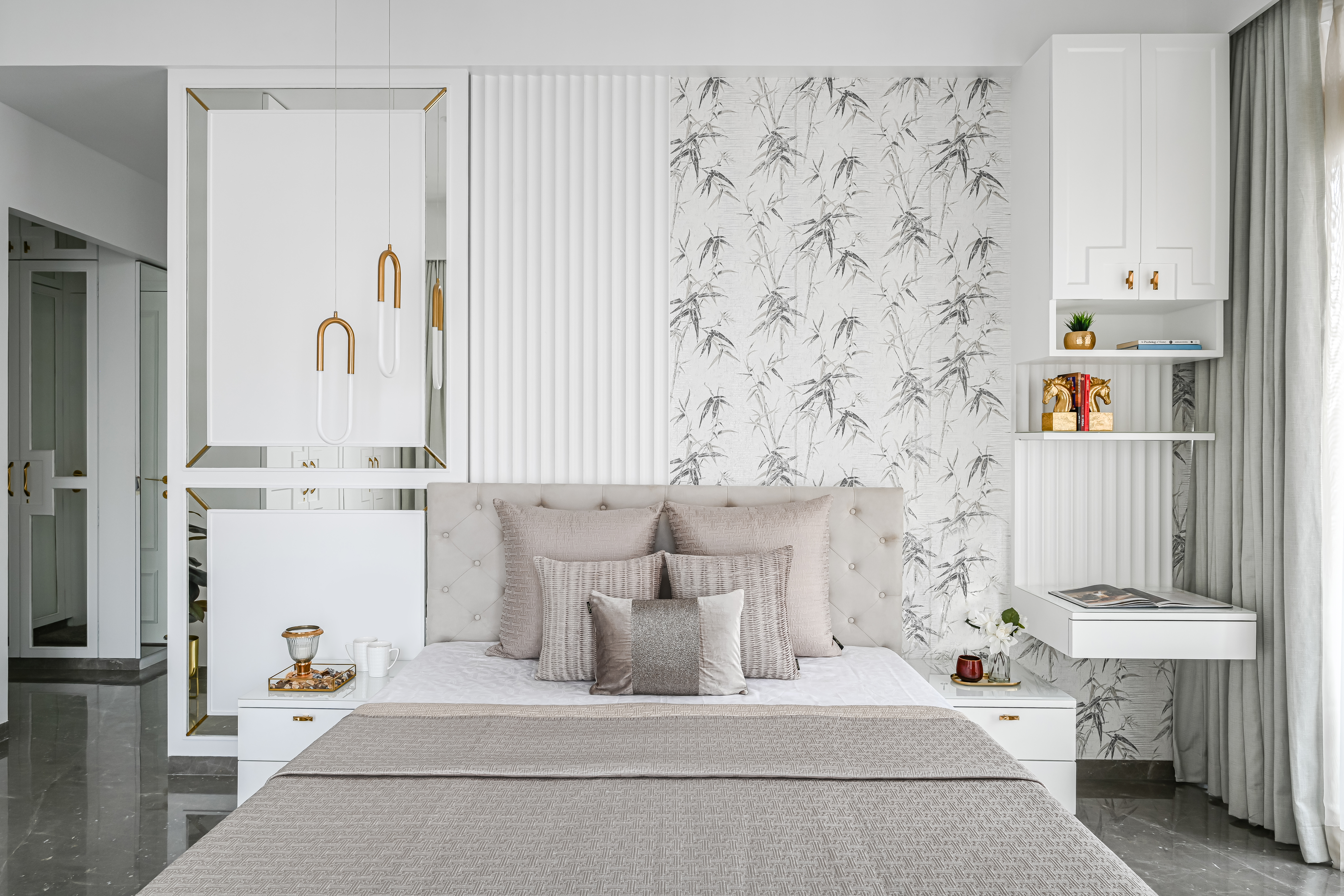 The Master Bedroom feels serene and calming, while also exuding a sense of glamour and luxury. Light colour palette creates a sense of tranquillity, while metallic finishes, add a touch of elegance and glamour.