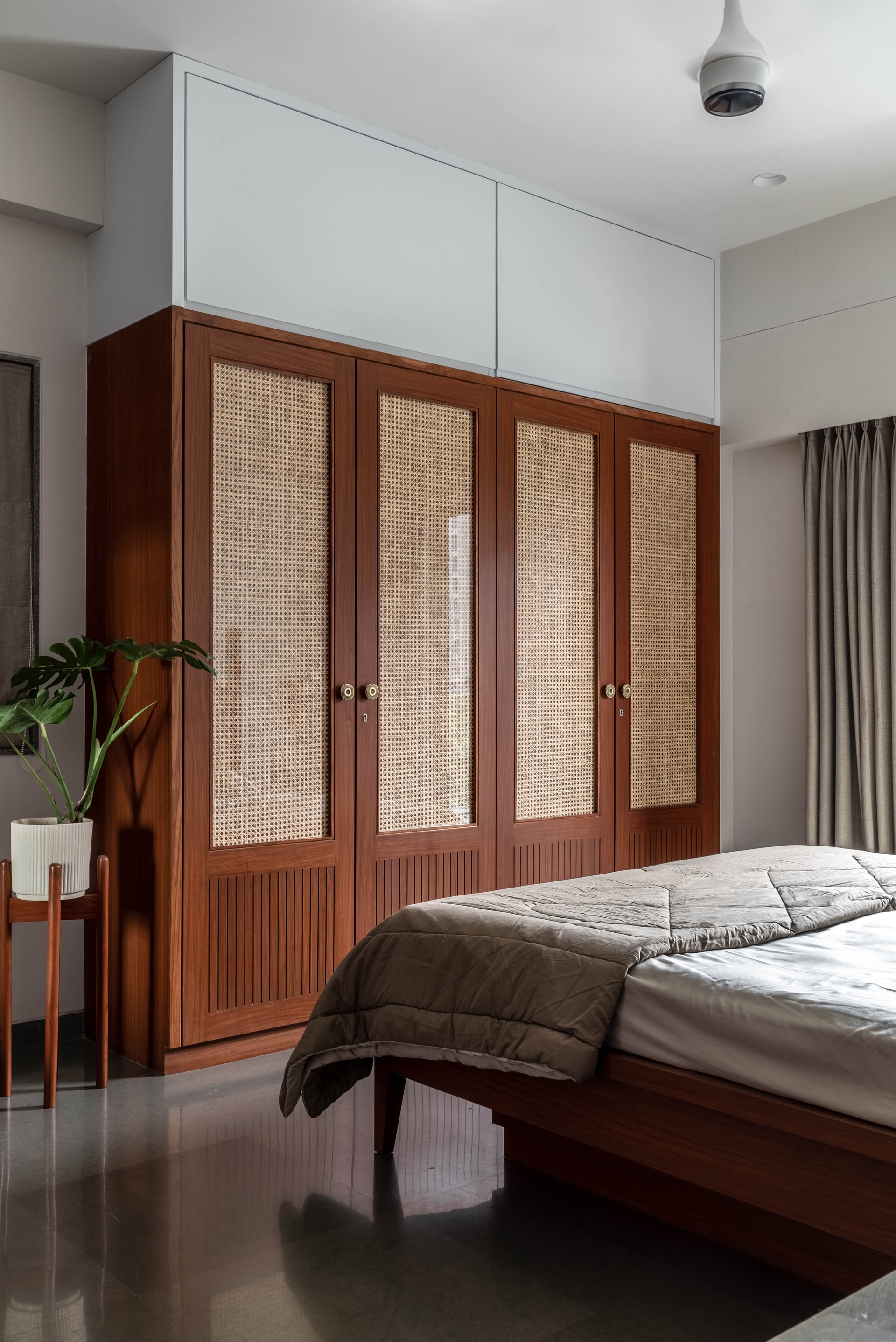 The wardrobe here is the room’s defining piece of joinery: the lower section features cane-panelled doors set within timber frames, with fluted detailing on the lower panels, while plain white loft cabinets above provide additional fitted storage. The timber portion reads as furniture even as the whole unit functions as cabinetry, a distinction that matters in a home where craft is treated as substance, not surface.