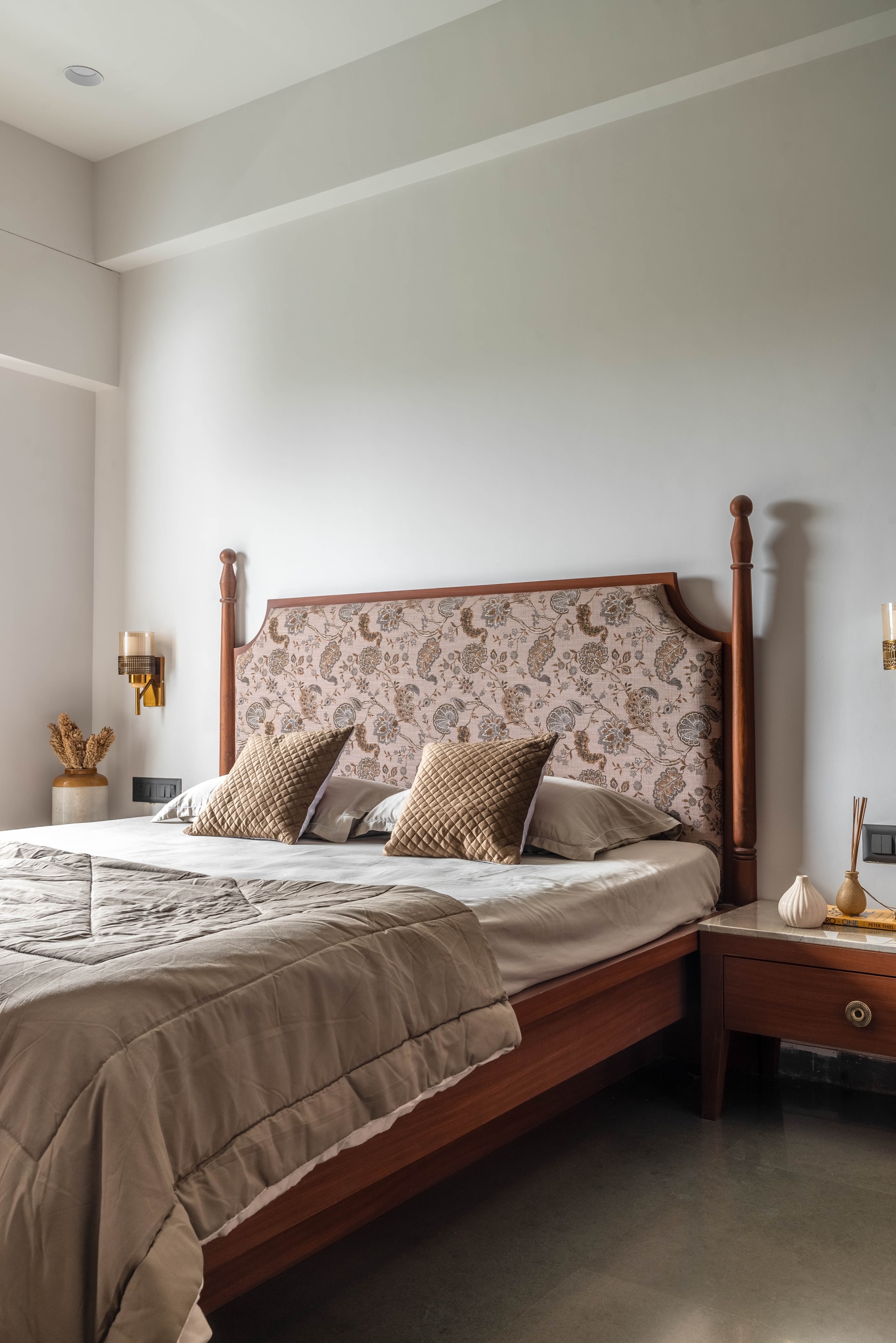 The parents’ bedroom takes a warmer, more traditional approach. A four-poster bed frame in solid timber carries an upholstered headboard in a floral kalamkari-style print, and brass wall sconces flank the bed with a warm, amber glow. Where the master bedroom suppresses ornamentation, this room gently embraces it.