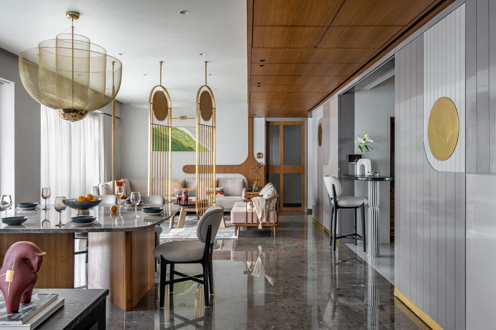 The kitchen, designed to be both flexible and adaptable, features a unique moving wall that can be opened to connect the kitchen to the living and dining spaces via a small breakfast counter. This innovative design element transforms into a custom-designed panelling when closed, serving as a cohesive backdrop that unites all three spaces along with the teak wood ceiling. This ensures that the visual flow of the design remains uninterrupted, whether the sliding door to the kitchen is open or closed.