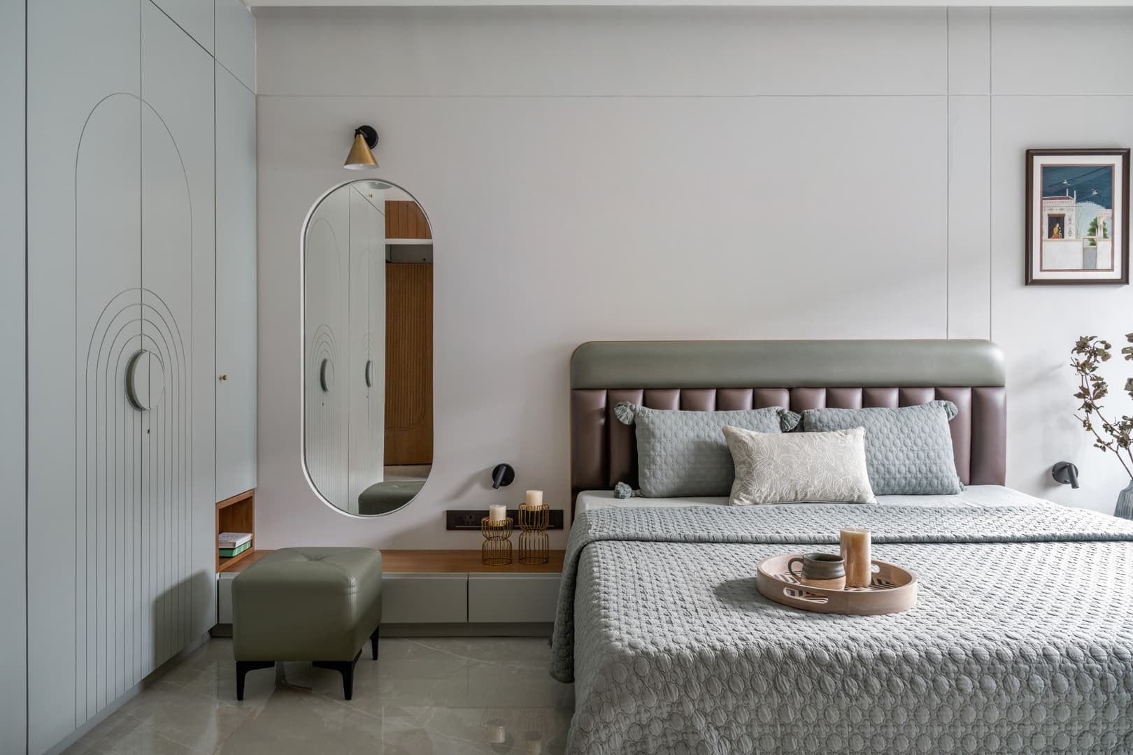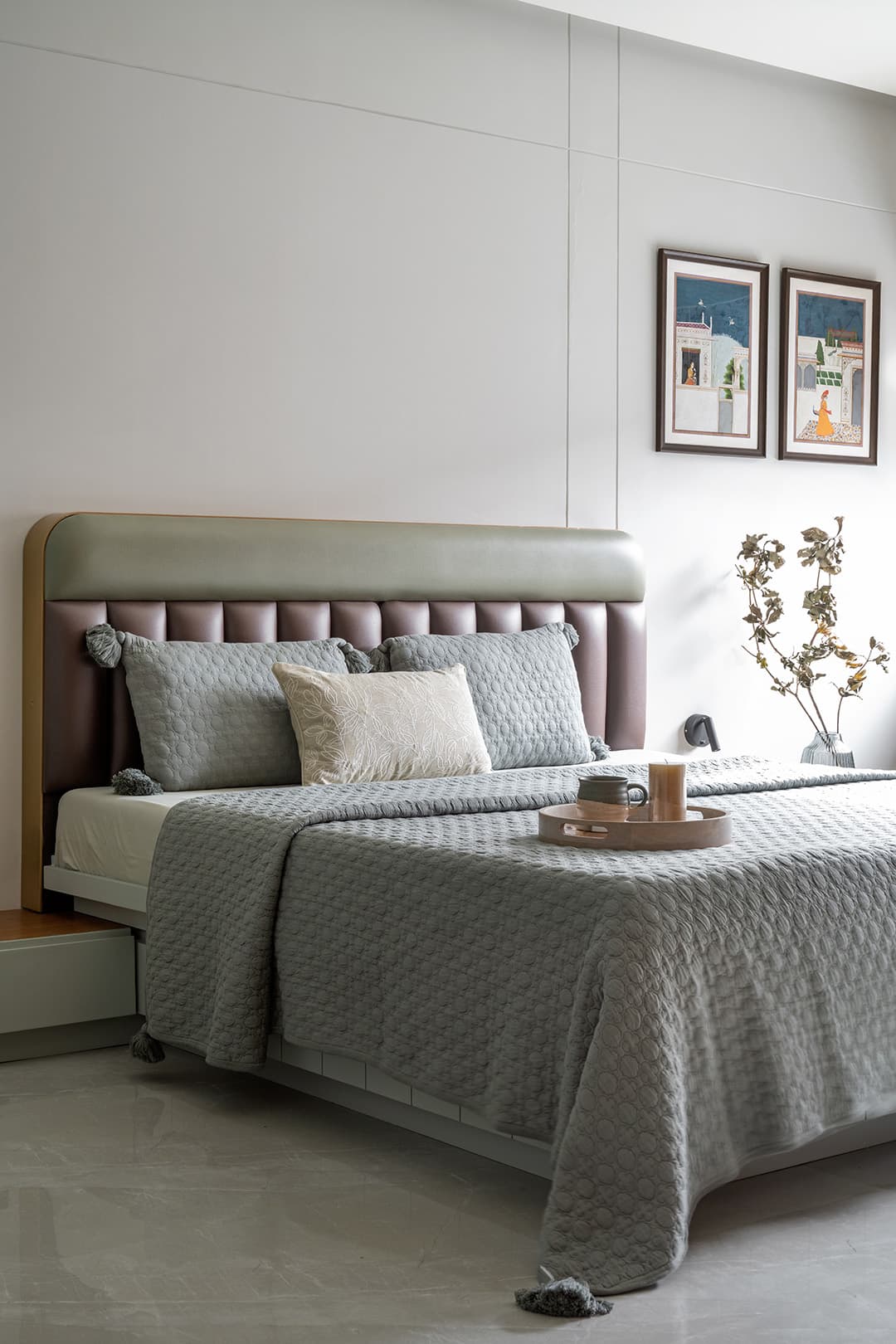 Each bedroom in this home is designed to be a bespoke refuge, echoing the individual personalities of its occupants while maintaining a cohesive design language. The parents’ bedroom exudes simplicity and spaciousness, with soft sage green tones and teak wood forming a soothing palette that promotes relaxation and tranquillity. A cosy reading corner doubles as their favourite spot for evening tea, embodying serenity and offering a quiet retreat from the hustle and bustle of daily life. The Indo-modern style of the room is exemplified by traditional miniature artworks, paying homage to the family’s heritage and adding a touch of cultural richness to the space.