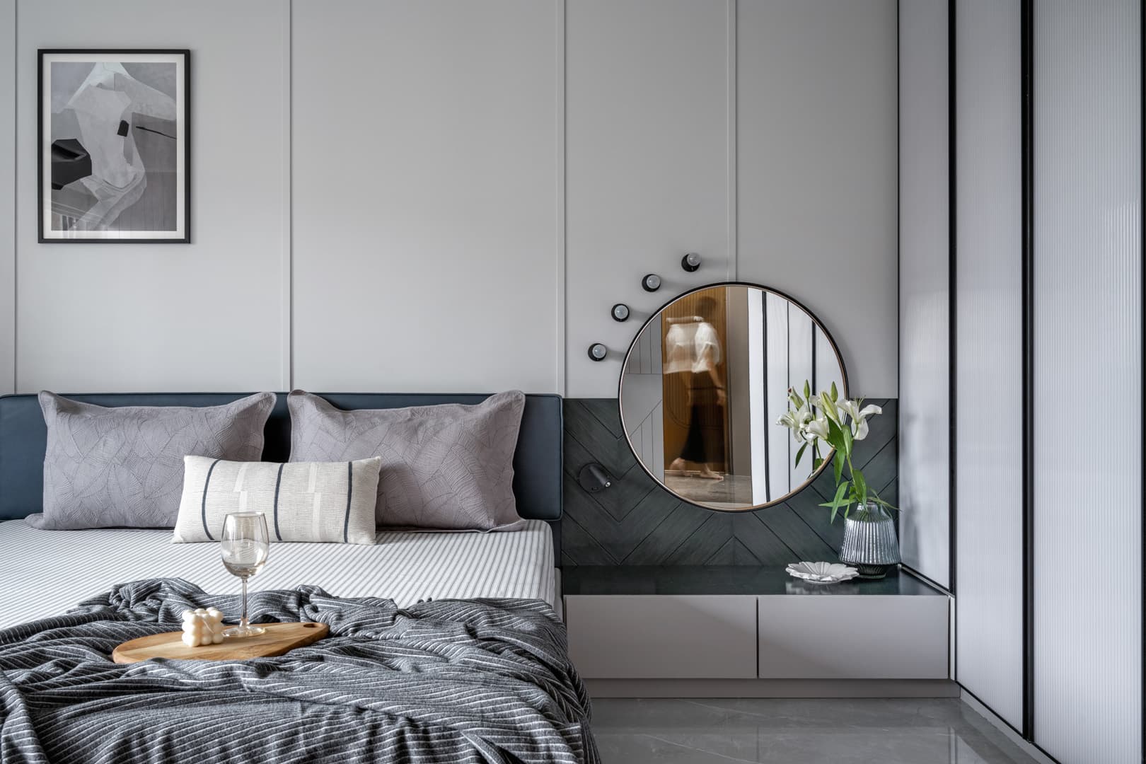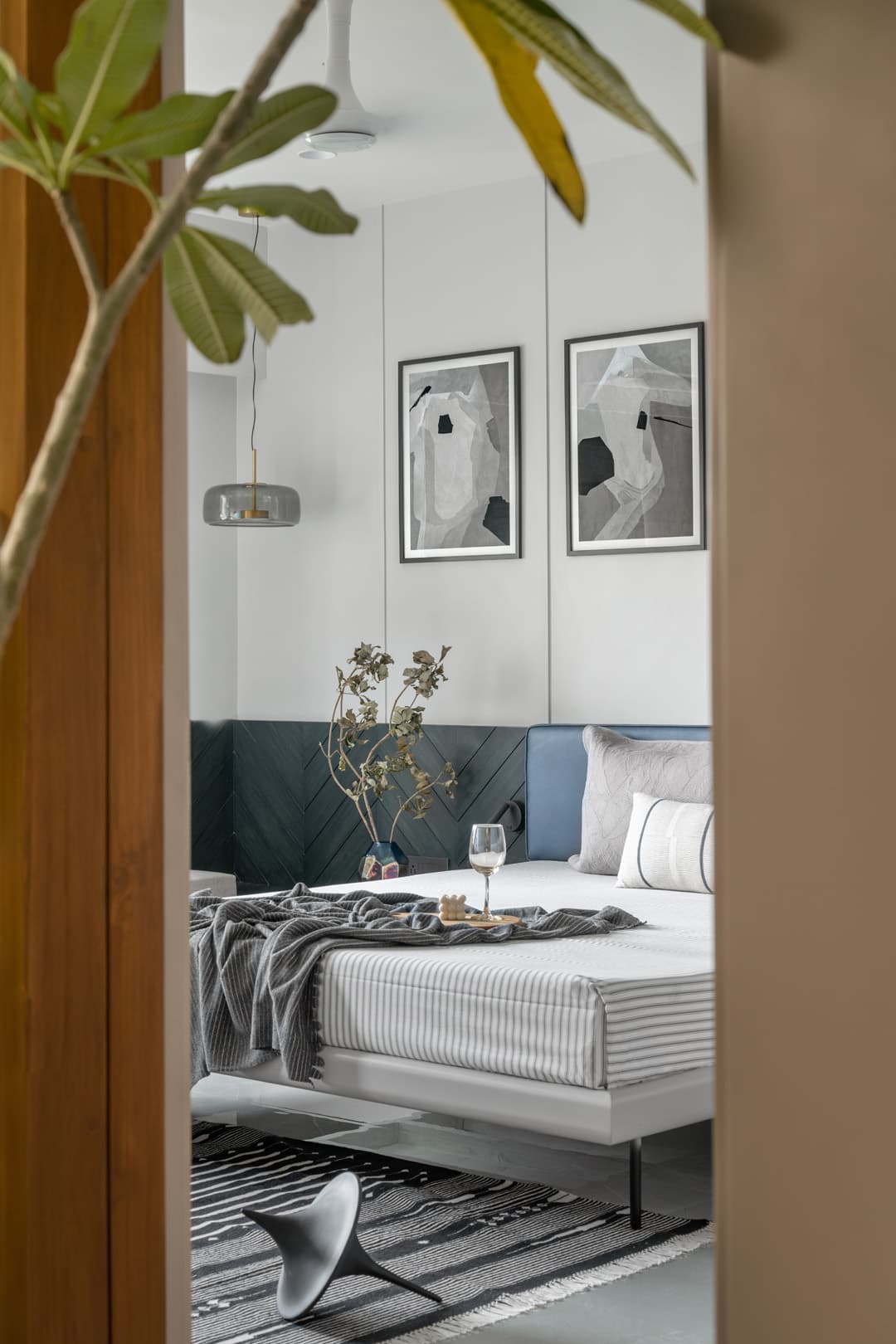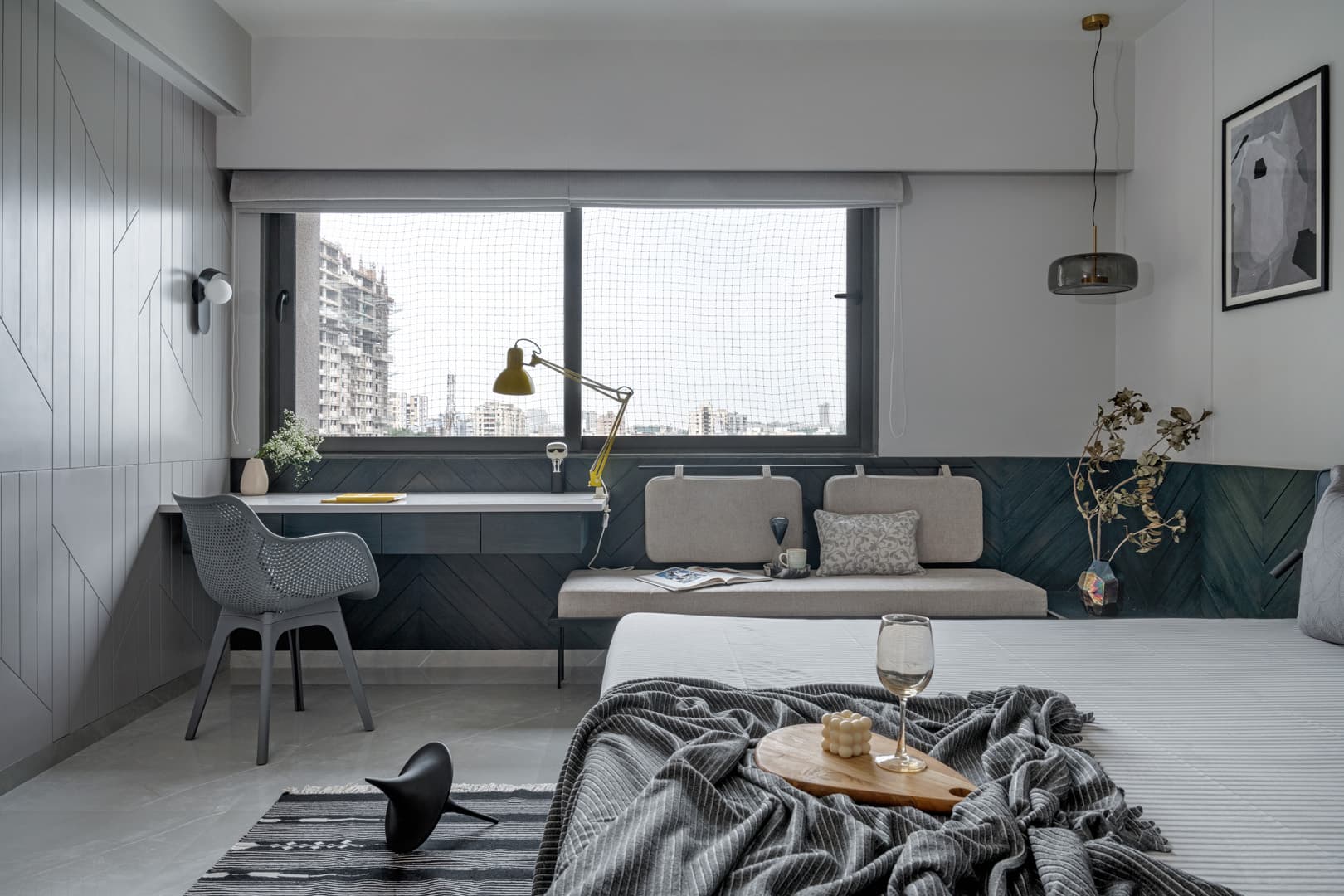 The son’s bedroom takes a bold and minimalistic approach, creating a striking contrast with its material and colour palette. The dark Prussian blue stain on the veneer for the headboard and bench panelling against a bright wall panelling creates a captivating design antithesis, reflecting the couple’s contrasting yet harmonious personalities. This room is a perfect blend of boldness and elegance, offering a sanctuary that is both visually striking and deeply personal.