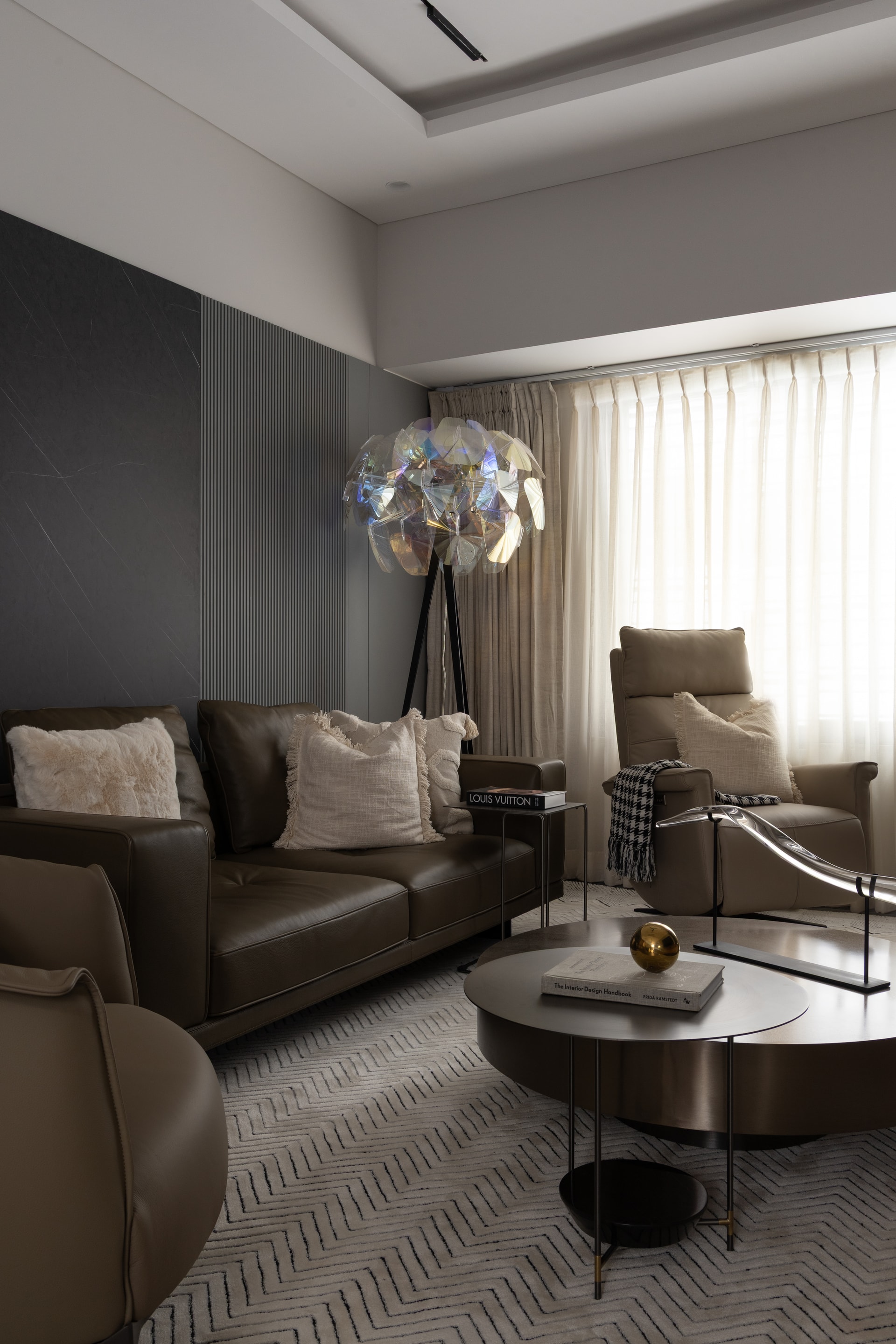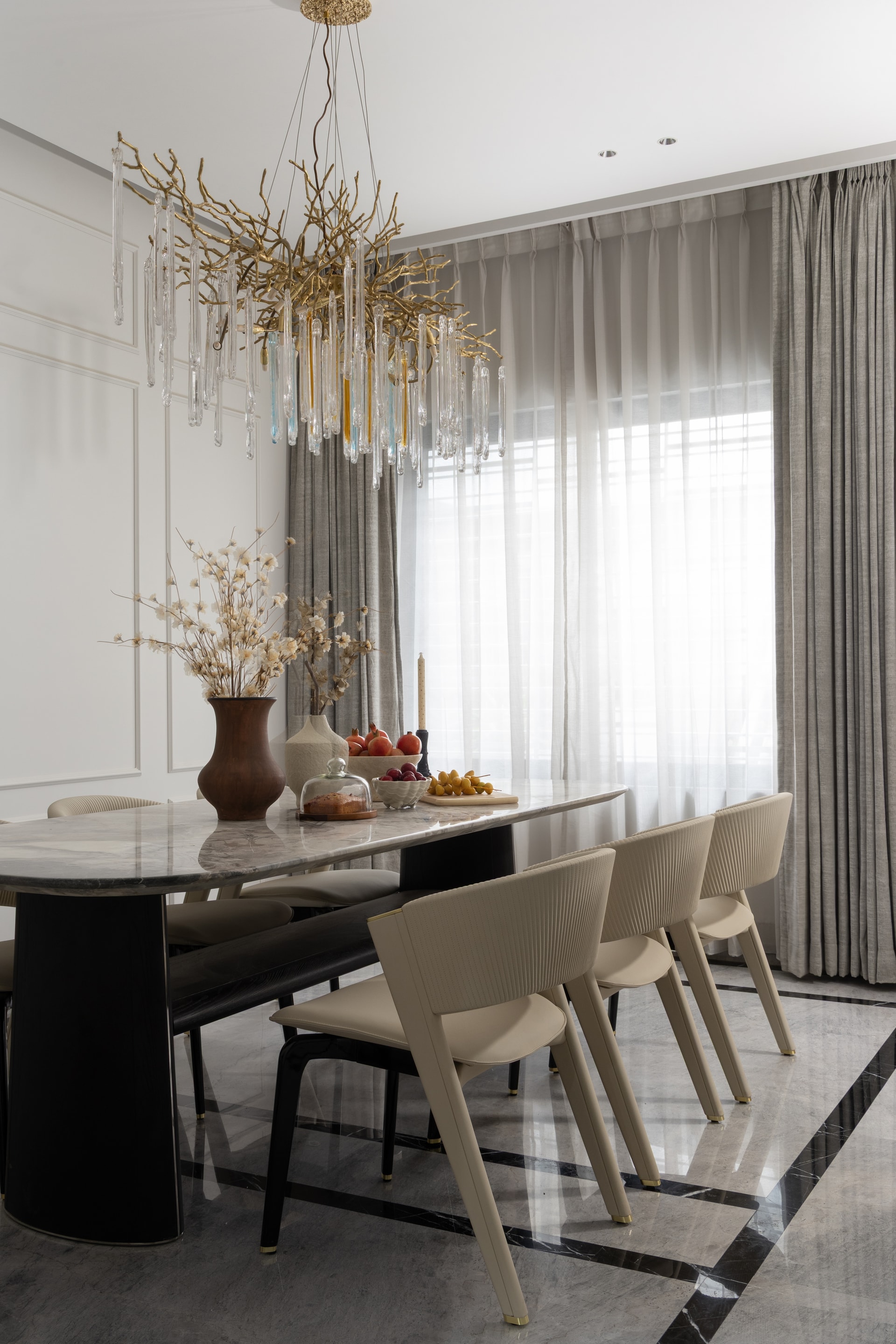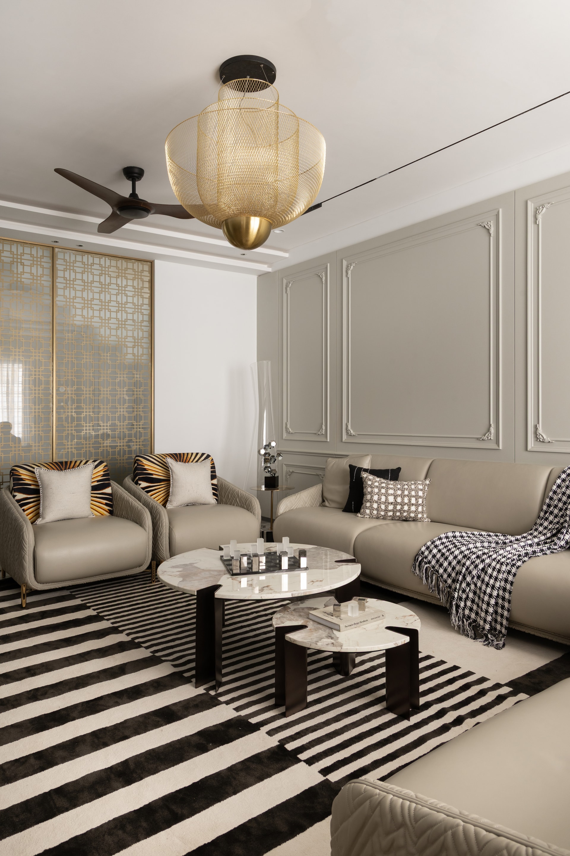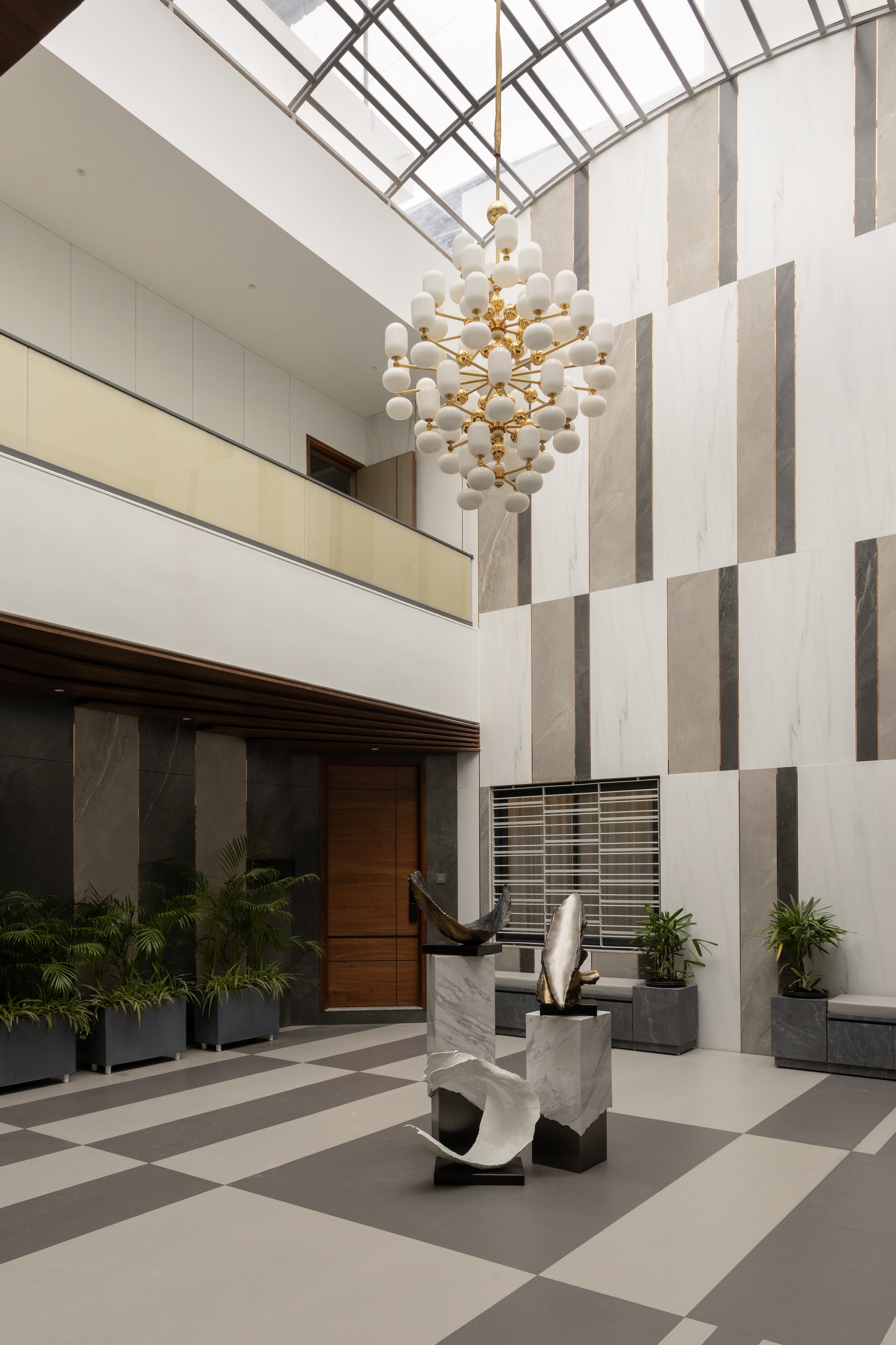 Materiality plays a defining role in unifying the residence. Polished Italian marble floors with delicate inlays set a refined base, while warm teakwood paneling introduces depth and tactility. Brass accents, used sparingly yet deliberately, add a layer of quiet luxury, catching light without overpowering the spaces. Bespoke furniture and custom lighting further reinforce the project’s tailored approach, ensuring that every element feels intentional and rooted in the larger architectural narrative.