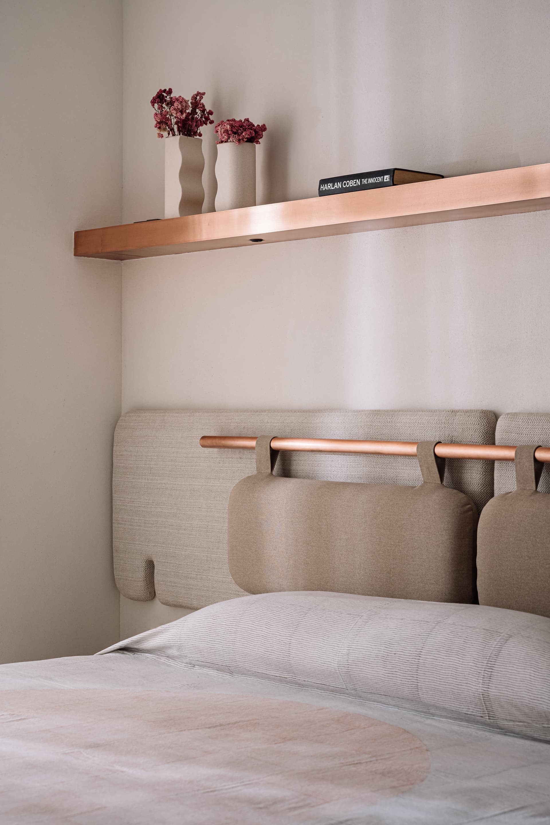 Nourishing individual identities in personal spaces, the parent’s bedroom articulates functionality for the senior’s needs with clean lines, a clutter-free ambience, a cosy reading nook and a small dresser. The married son’s bedroom was reconfigured combining two rooms and sublimely celebrates multi-functionality in design with eloquent use of space. Straddled on captivating fabric and textural art on the cupboards, an alluring brass mirror, and a comely seater next to an extensive fenestration that facilitates a warm flow of light and fresh air, the room applauds relaxed creativity.