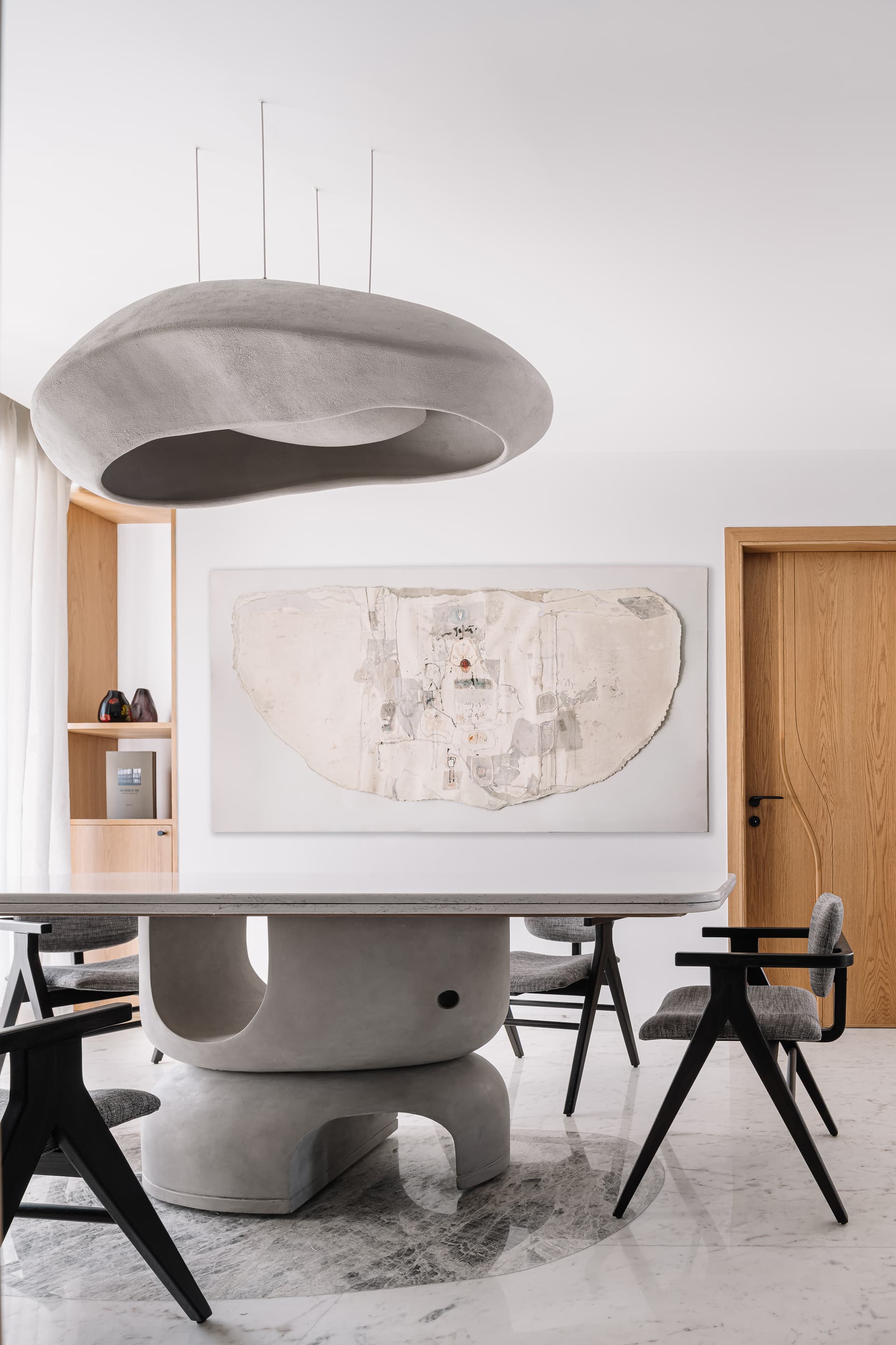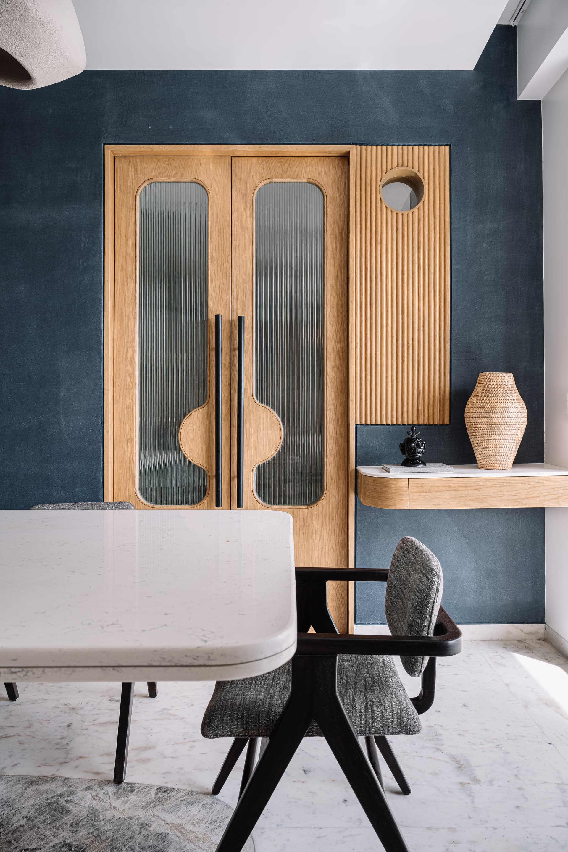 A welcoming gesture at the entrance, a soulful mosaic, crafted using remnant stones from different rooms is symbolic of the unique personalities of each member. A beguiling piece of art in soft hues against a cerulean blue backdrop, this statuesque mural greets guests with its compelling demeanour and vibrancy. The entrance unfolds to an exquisitely engaging living room that exudes a sublime voice with its art deco renditions. Gradients of soft hues, a tantalizing swing, and a bodacious table, nuanced with dark tones it crafts an aura of nostalgia and belongingness with its abstract visual language.