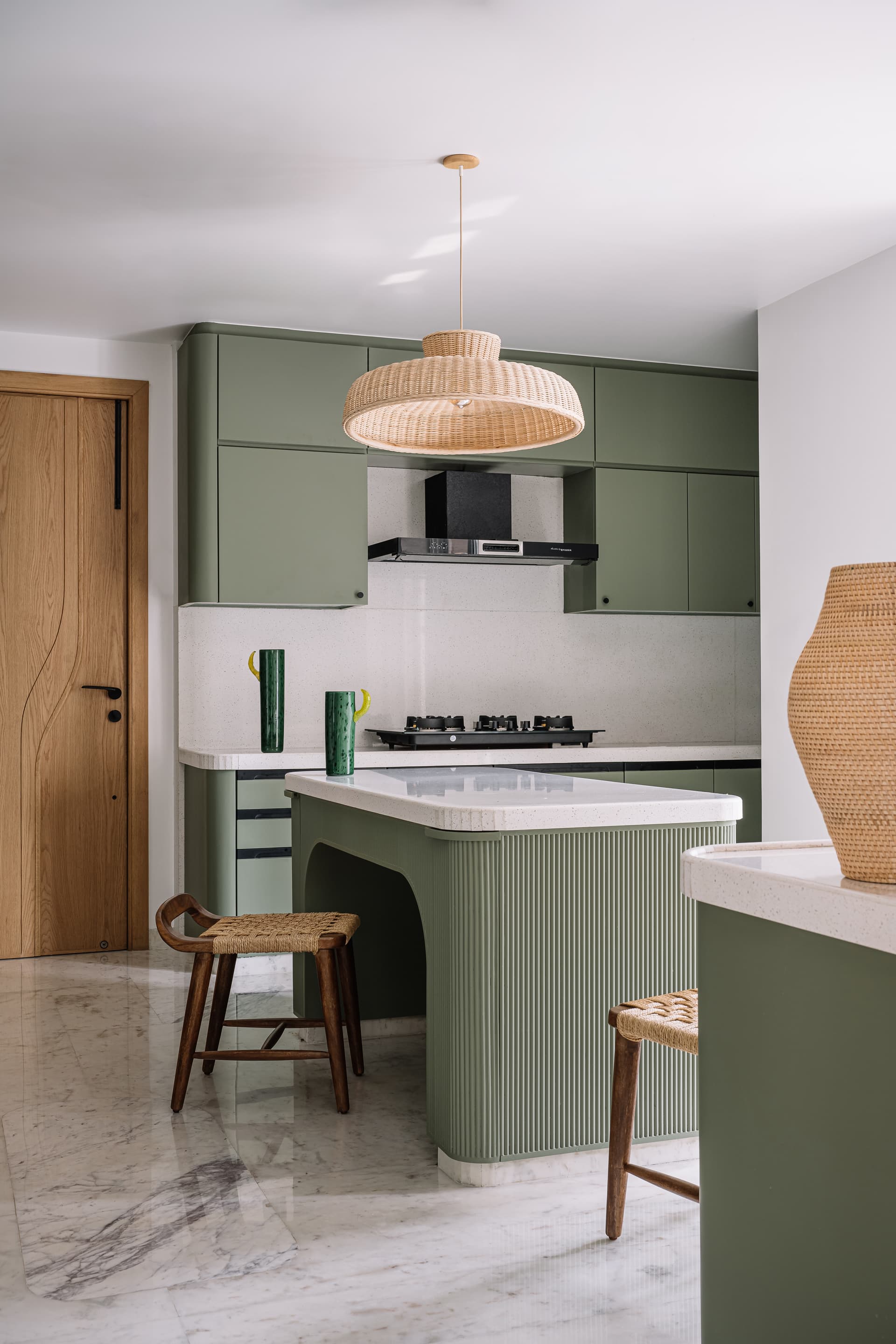 A sublime abstract sculpture of Shrinathji blesses the family from its exalted stance in the traditional temple as it opens gently into the living room. Multiple marble steps inside inspired by Carlo Scarpa’s works are adorned with miniature idols in the backdrop of deep-blued walls. The allure of art deco prevails through the dining area where a fog-grey stone inlay in an abstract ellipsoid design embellishes the floor. The pattern is reflected by the pendulum dining light, pivoted with a dining table that is a sculptural delight and balanced perfectly with a captivating painting by artist Shahanshah Mittal on the adjacent wall. Adjoined by a spacious kitchen in verdant olive green it looks more like a family bonding area over cooking or comfort munching.