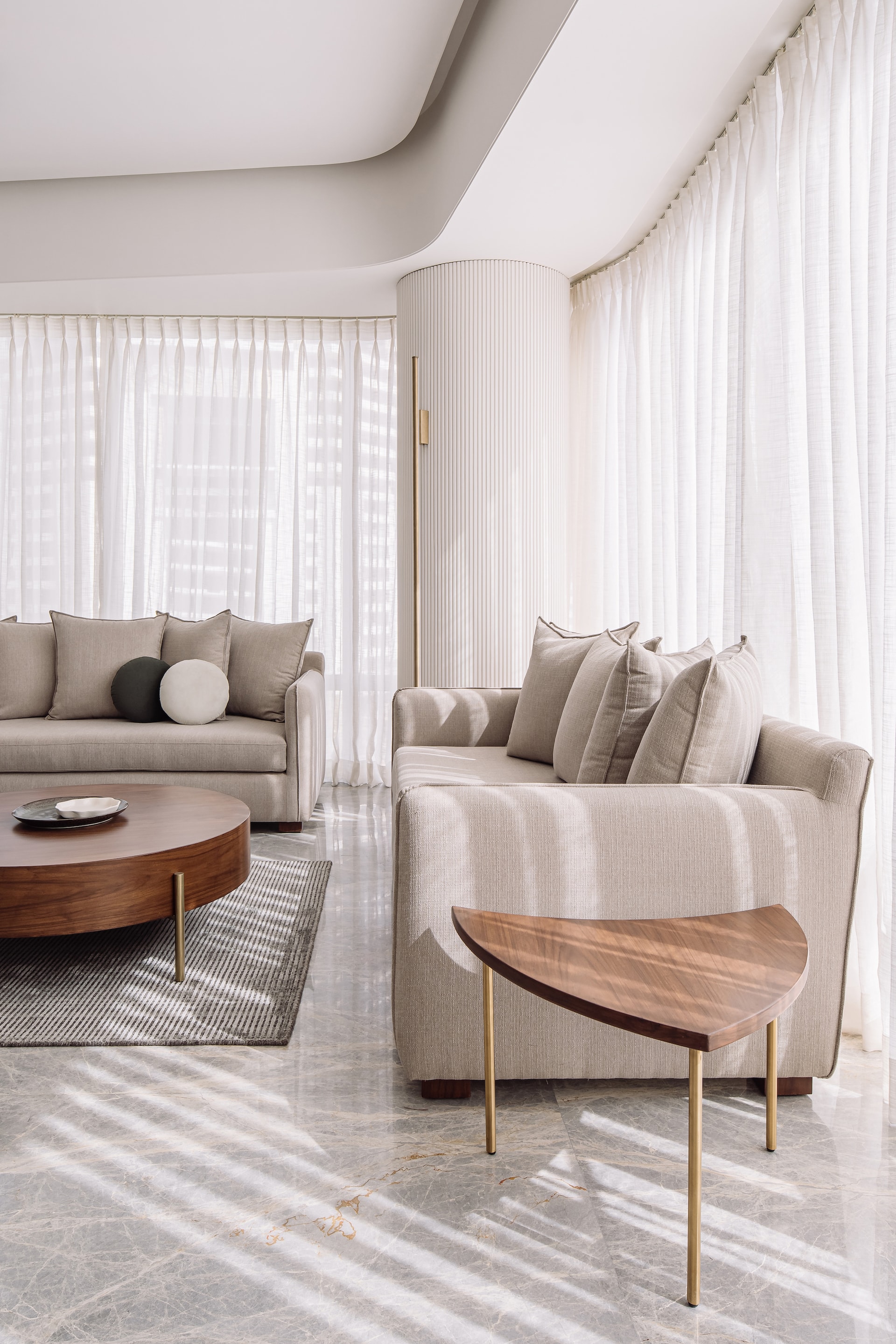 North-eastern sunlight swathes the communal nucleus of Pied-à-terre, breathing an animated quality into the marble floors. The living room can be visualised as the rightful oasis of the family, resting untethered from the urban stir. The space celebrates soft, organic geometry that reiterates an unobtrusive spatial flow. A beam along the living area’s glass-clad façade curves gently to double up as an enveloping pelmet holding diaphanous, sheer draping. The stoic structural column was treated adeptly to render it a homogeneous part of the space versus an awkward eyesore. Sheathed in a fluted surface finish, the column’s stature is further exemplified by the linear Hatsu wall light.