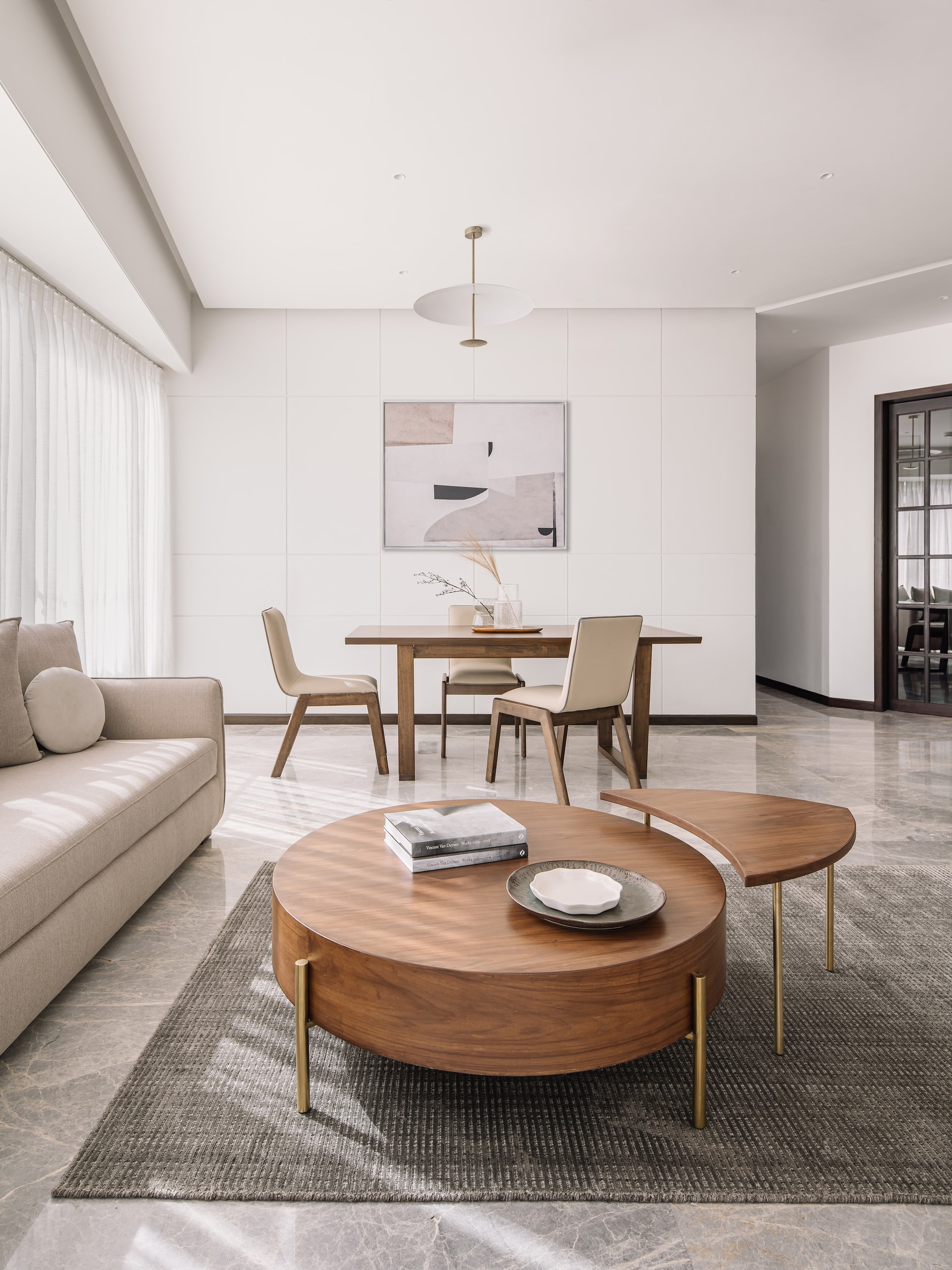 A portrait of pared-down design, the intimate dining space harmoniously ties into the open floor plan. The gridded POP wall treatment makes a comeback, creating a subtle backdrop for the area. The light wood table and chairs previously owned by the clients were refurbished and paired with the statement Hatsu Disc Pendant. An oversized abstract art print in shades of blush, beige, and black injects an accent of colour in this corner.
