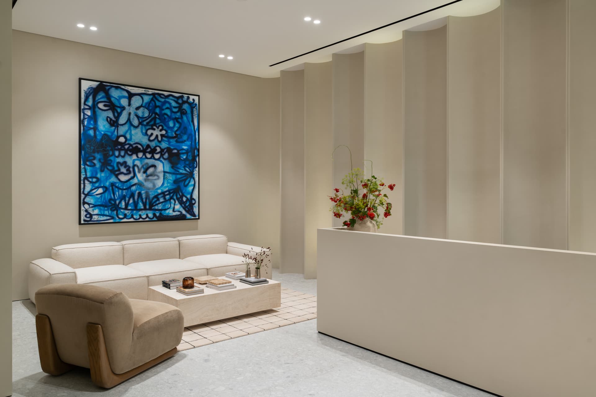 Rather than a traditional reception area, the entrance unfolds into a curated lounge defined by soft sculptural seating, marble-topped tables, and warm neutral tones. The spatial arrangement encourages conversation and relaxation, creating a setting that feels closer to a refined living room than a typical corporate waiting area.